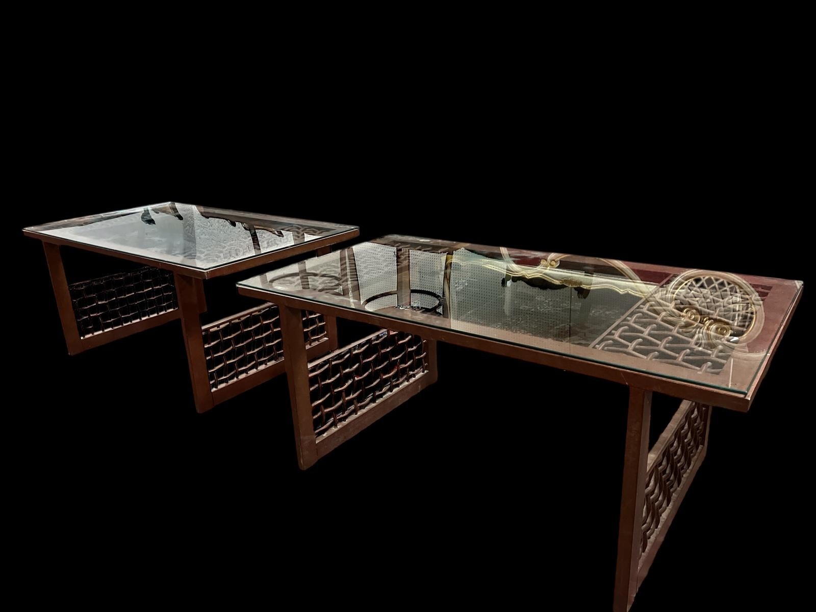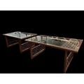 A PAIR OF ALFRANK METAL TABLES each of rectangular outline with glazed top and interwoven panels on rectangular supports joined by conforming stretchers Each table 47cm (h) x 110cm (w) x 60cm (d)
