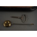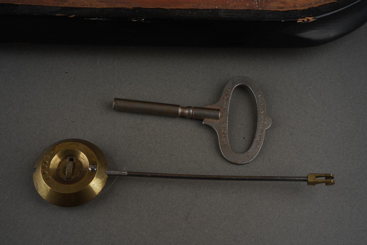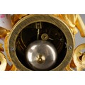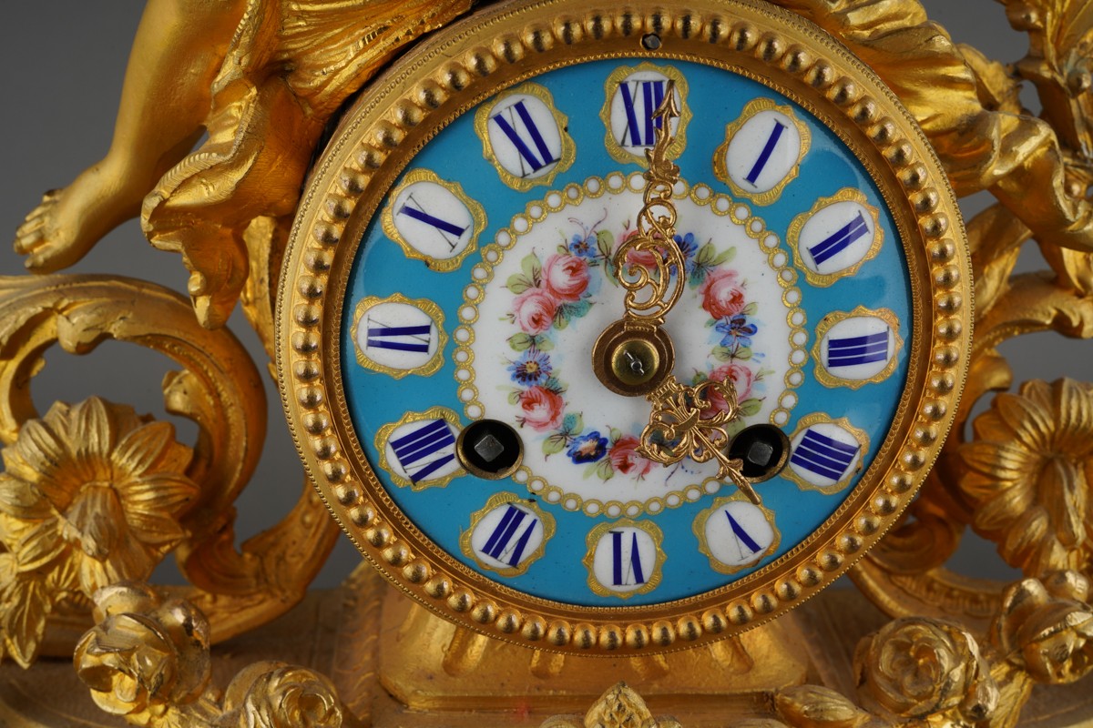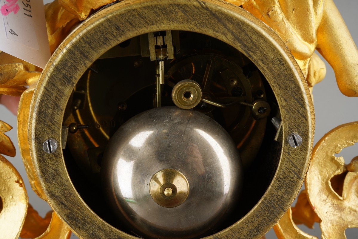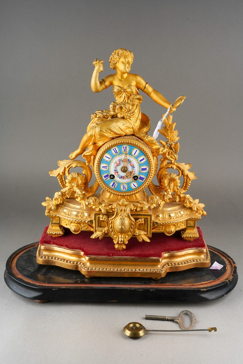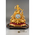 A late 19th Century gilt metal figural mantel clock, with porcelain dial, Roman numerals, Japy Freres movement, striking on a bell, movement stamped 16908, winds and runs, height 32cm approx, comes with a giltwood and velvet plinth and an ebonised oval dome stand, (no dome), with key and pendulum (4)