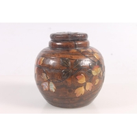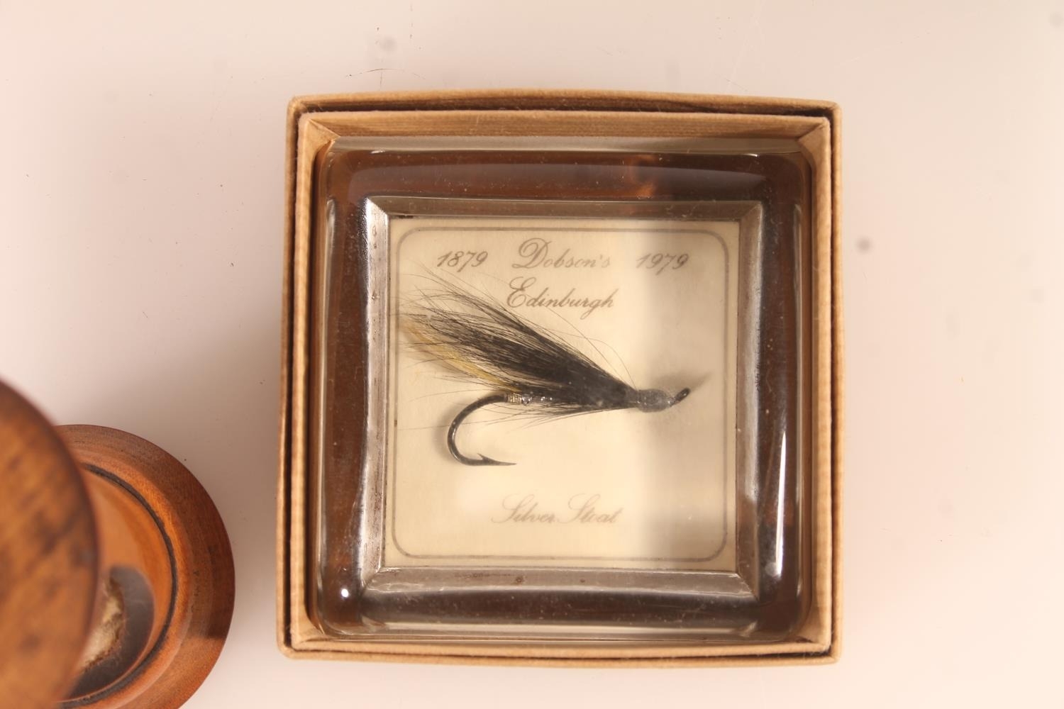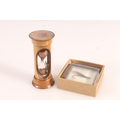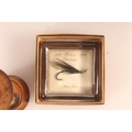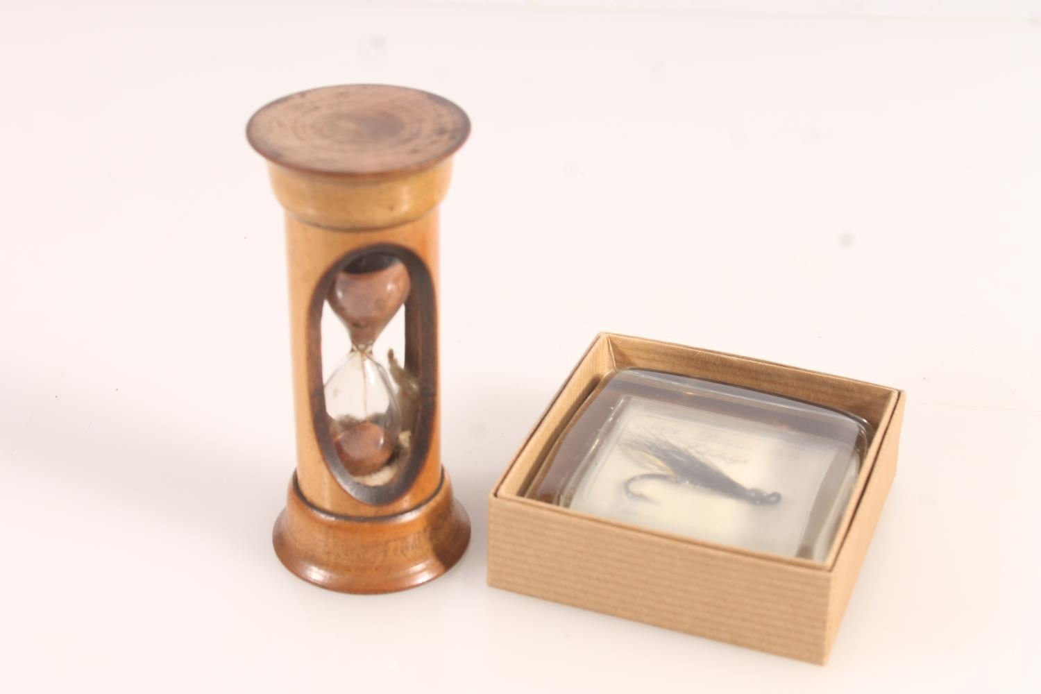 Late 19thC treen hourglass and a village green fishing fly in resin block (2)