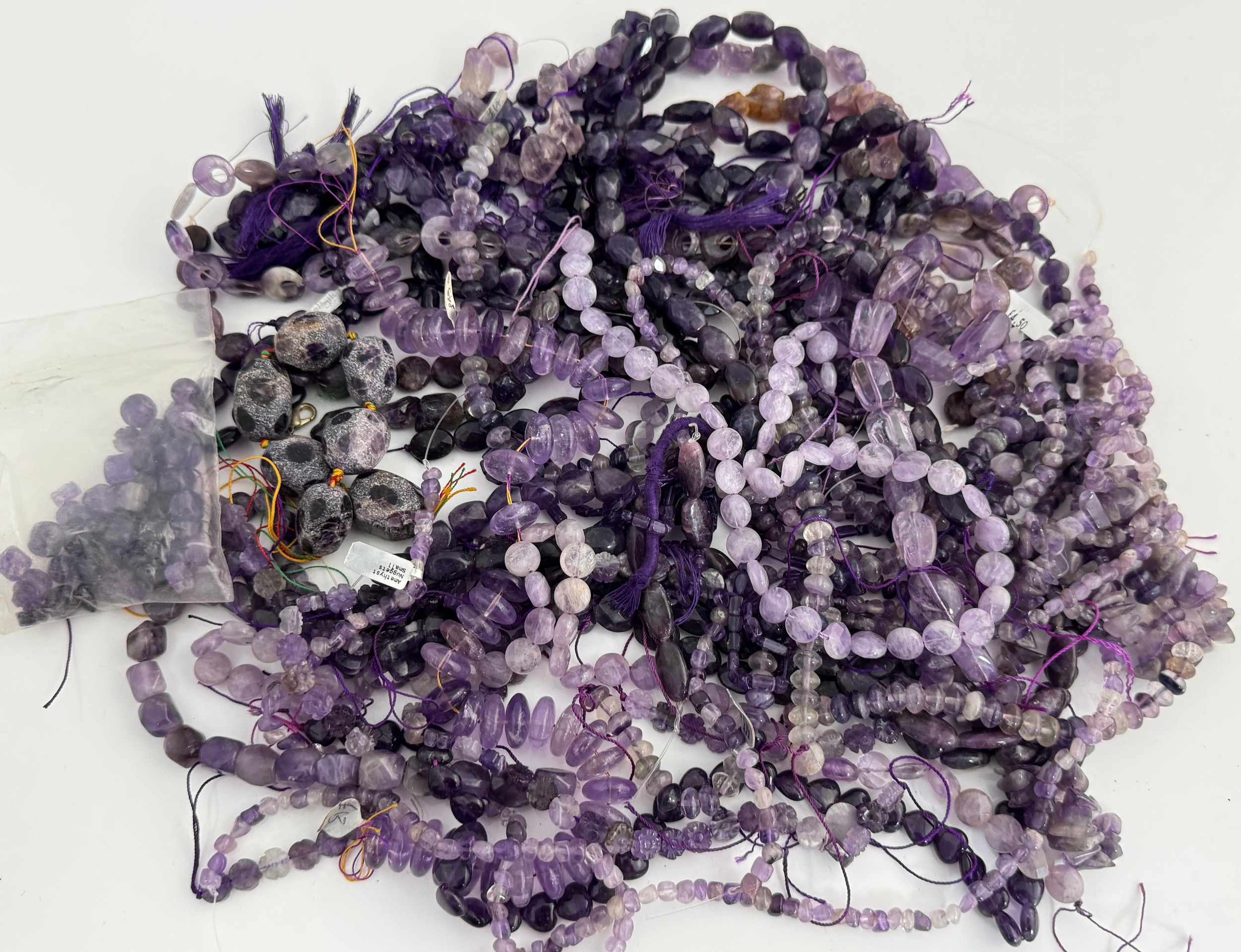 Numerous strings of amethyst beads for jewellery making, plus some loose beads.