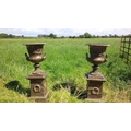 PAIR HEAVY CAST IRON URNS ON PLINTH IN VERDI GREEN BRONZE FINISH