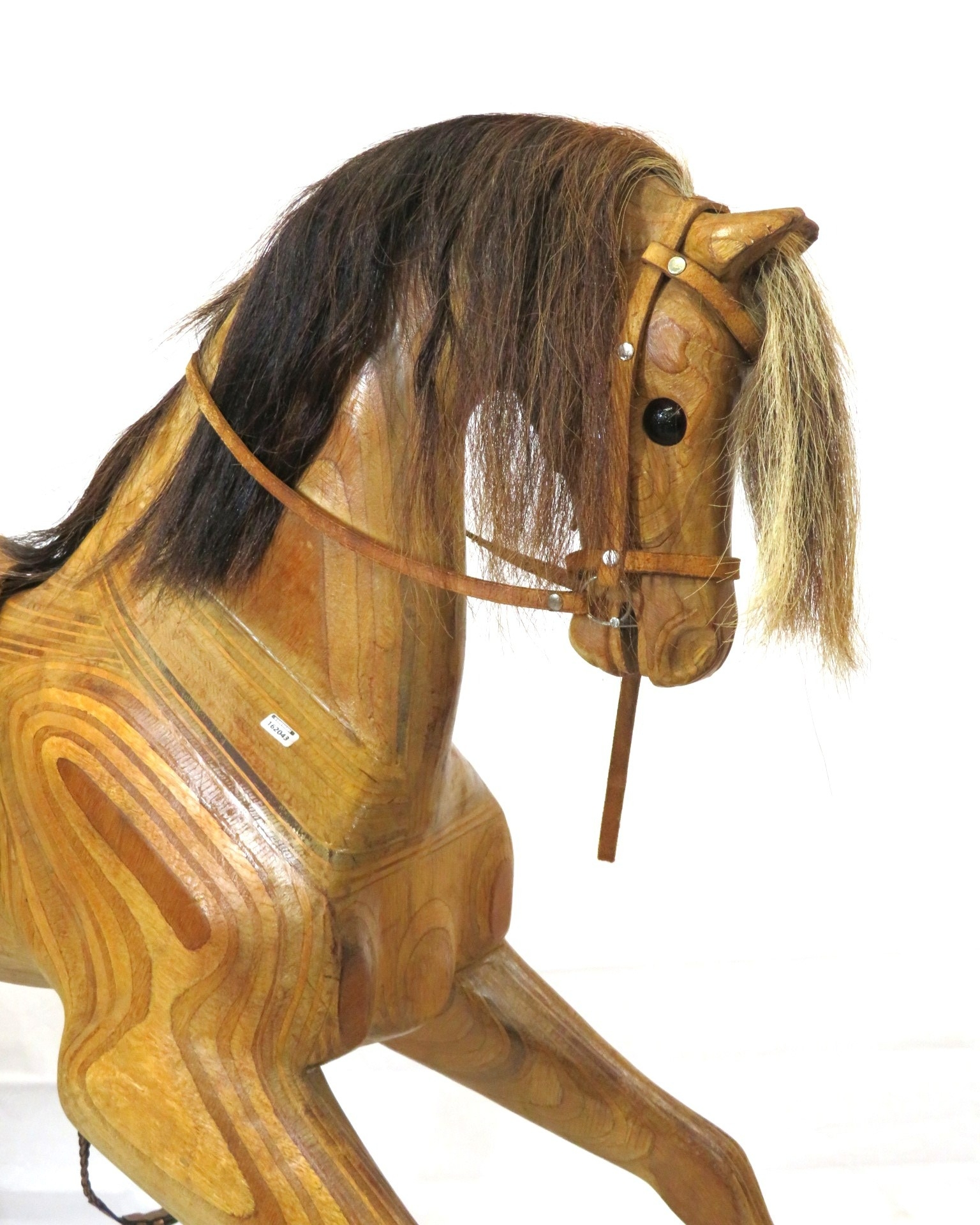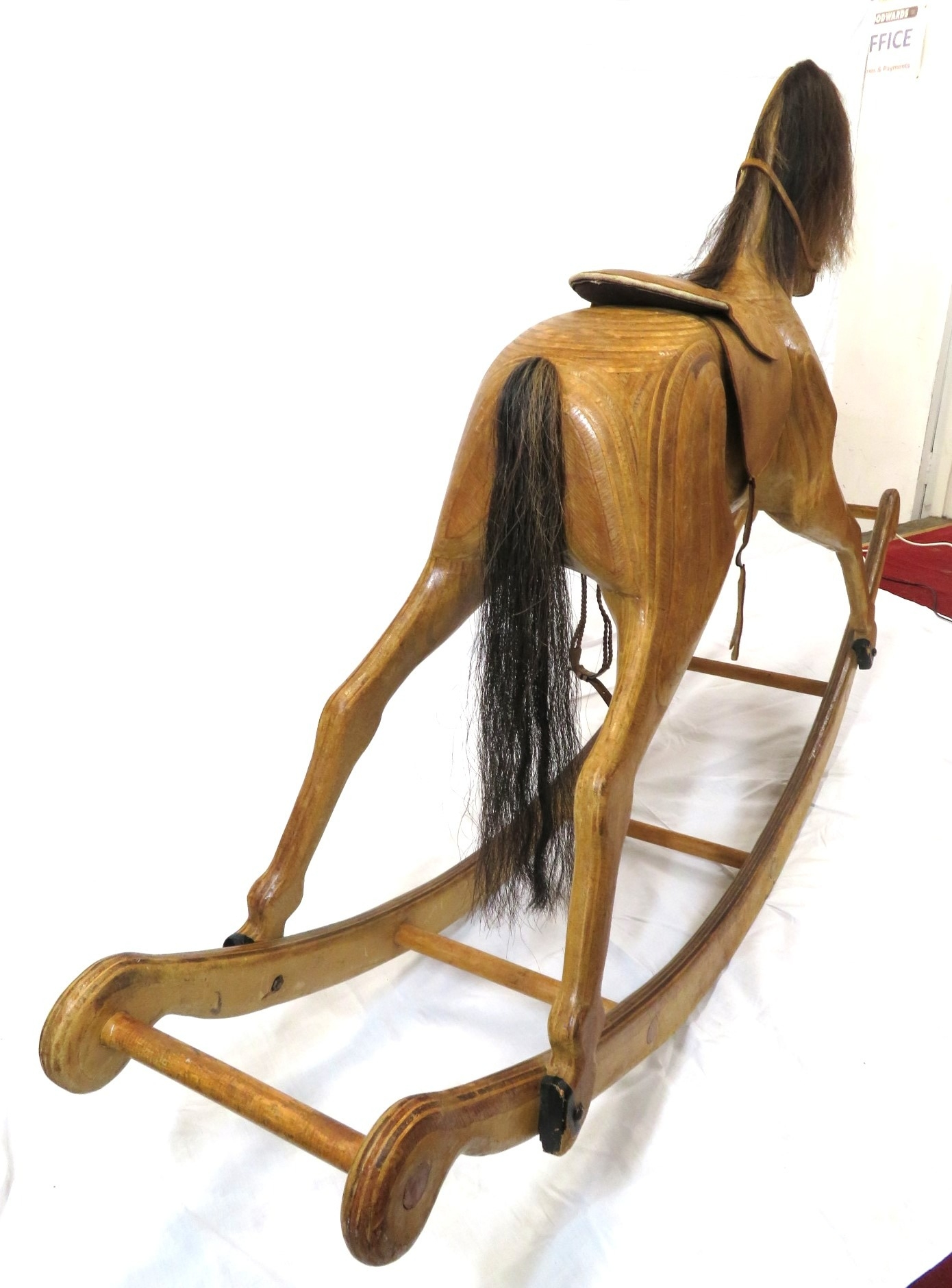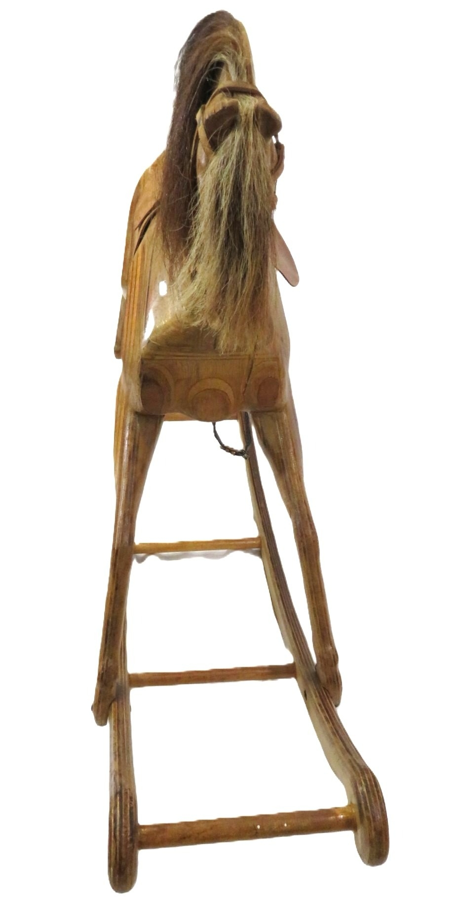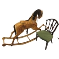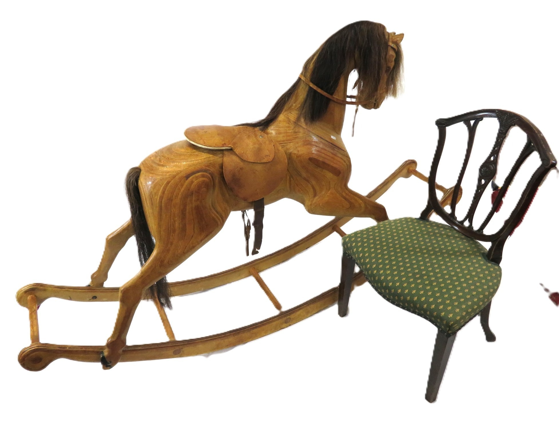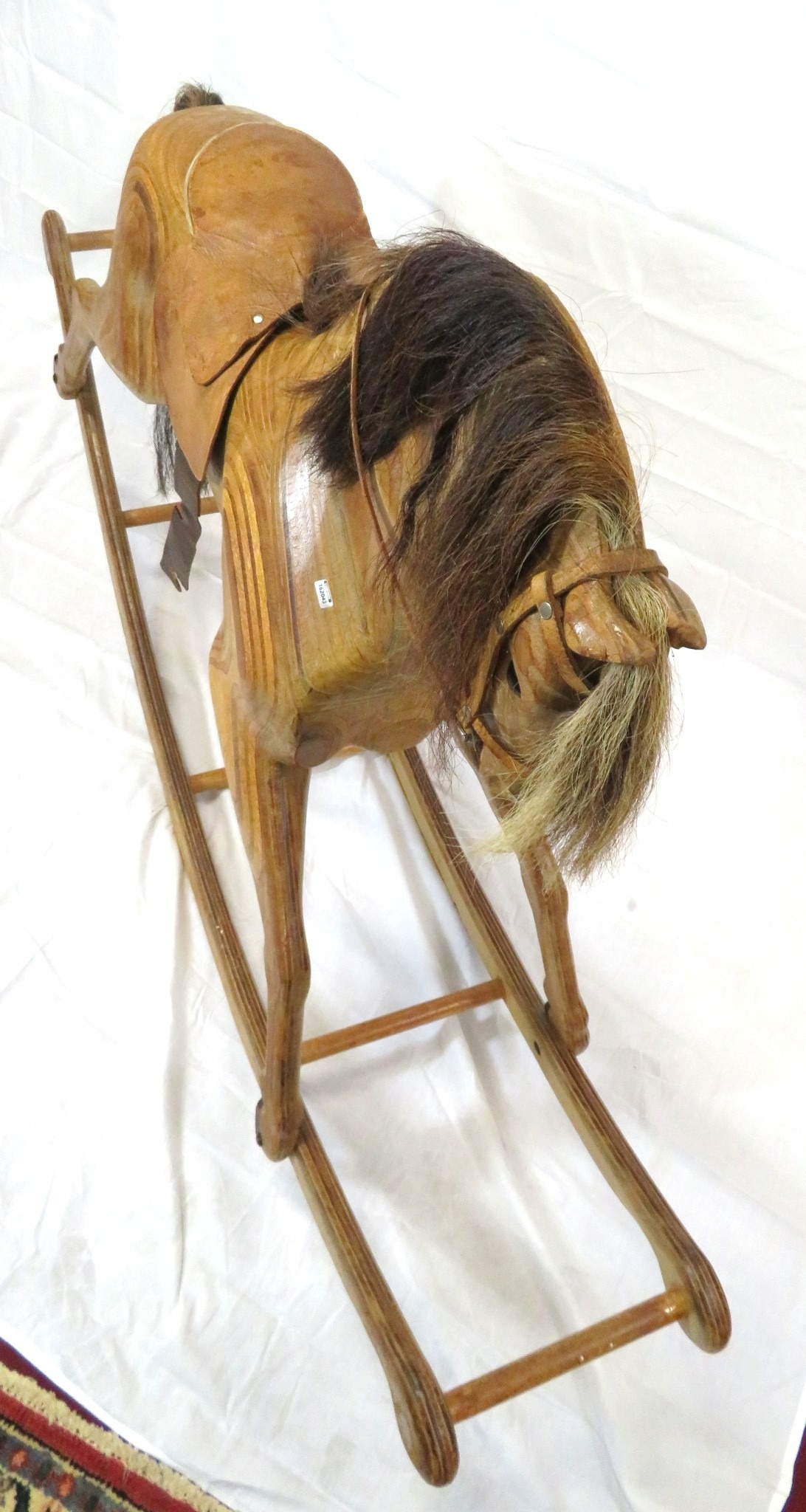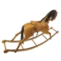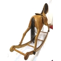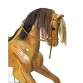Vintage yew rocking horse with leather saddle & reins