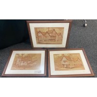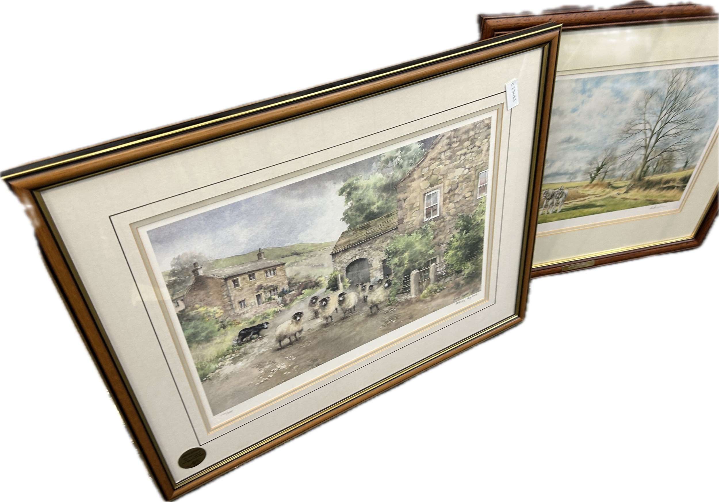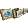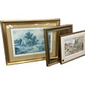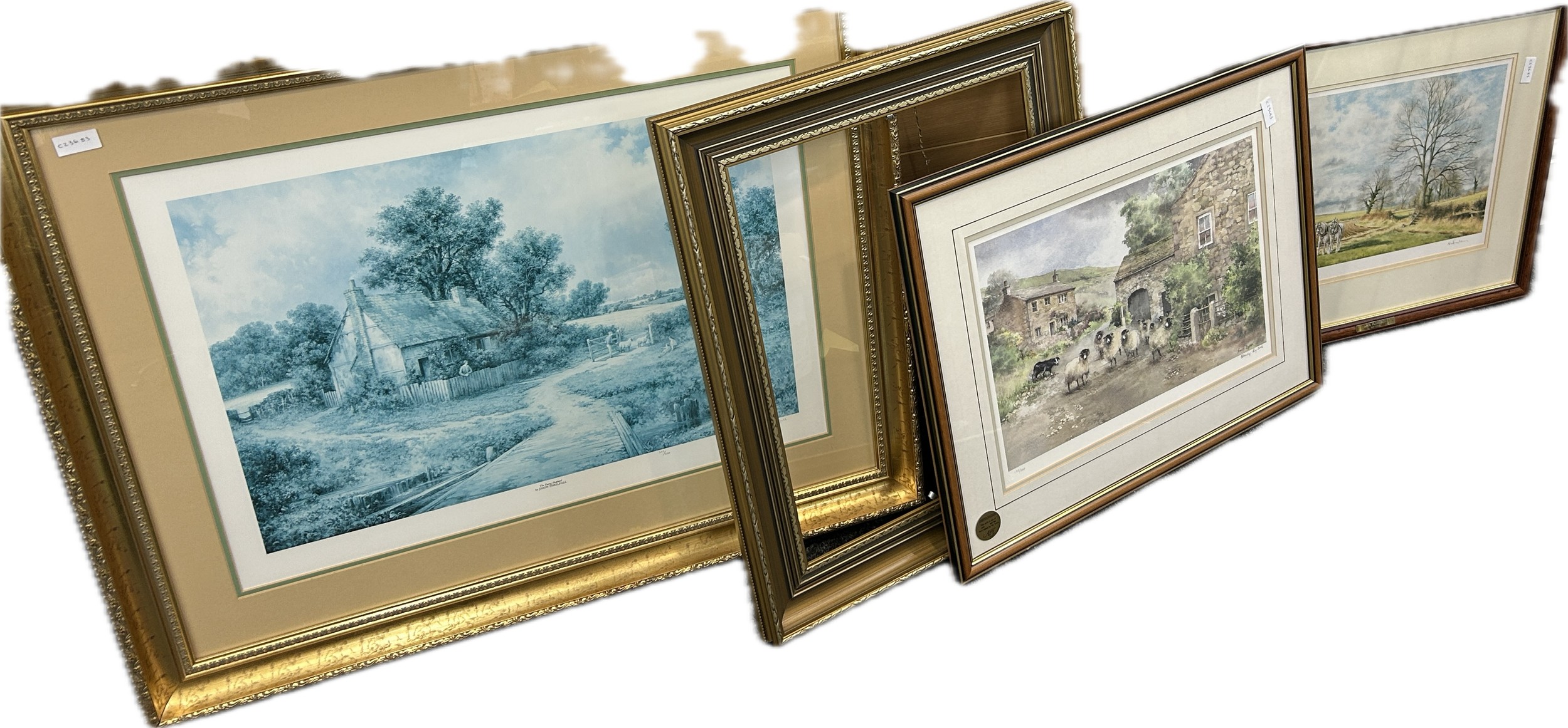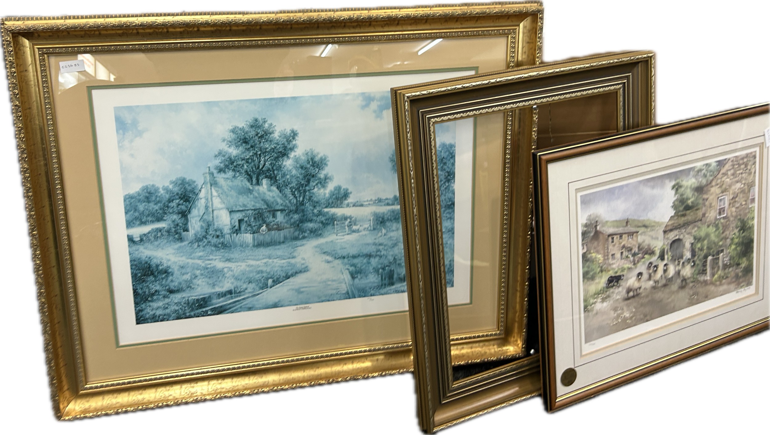 Selection of three framed prints, two limited edition, depicting landscape and cottage scenes and a gold coloured frame, largest measures approximately: 28 inches tall x 35 wide