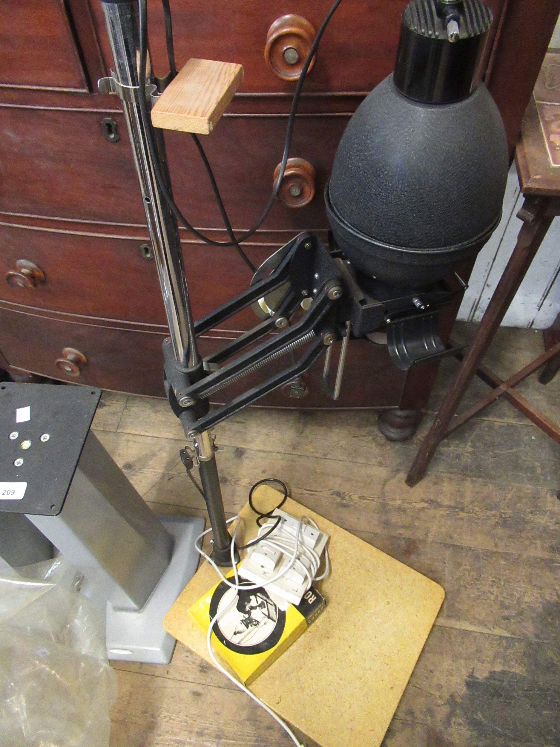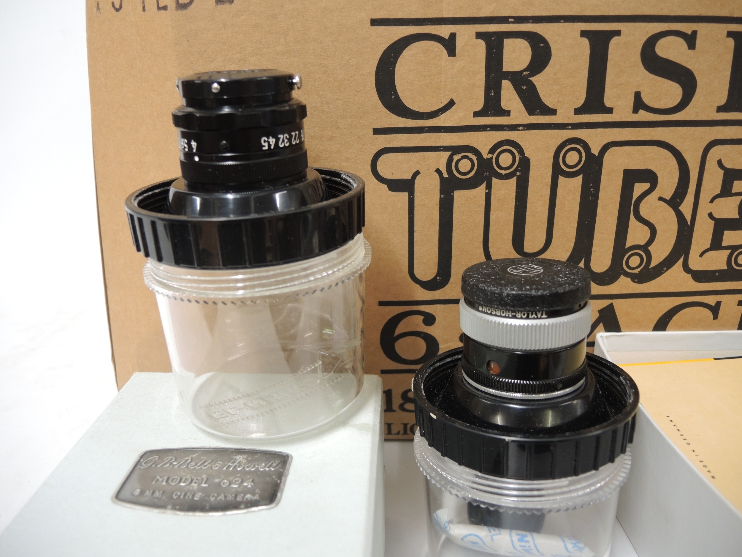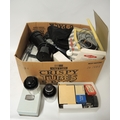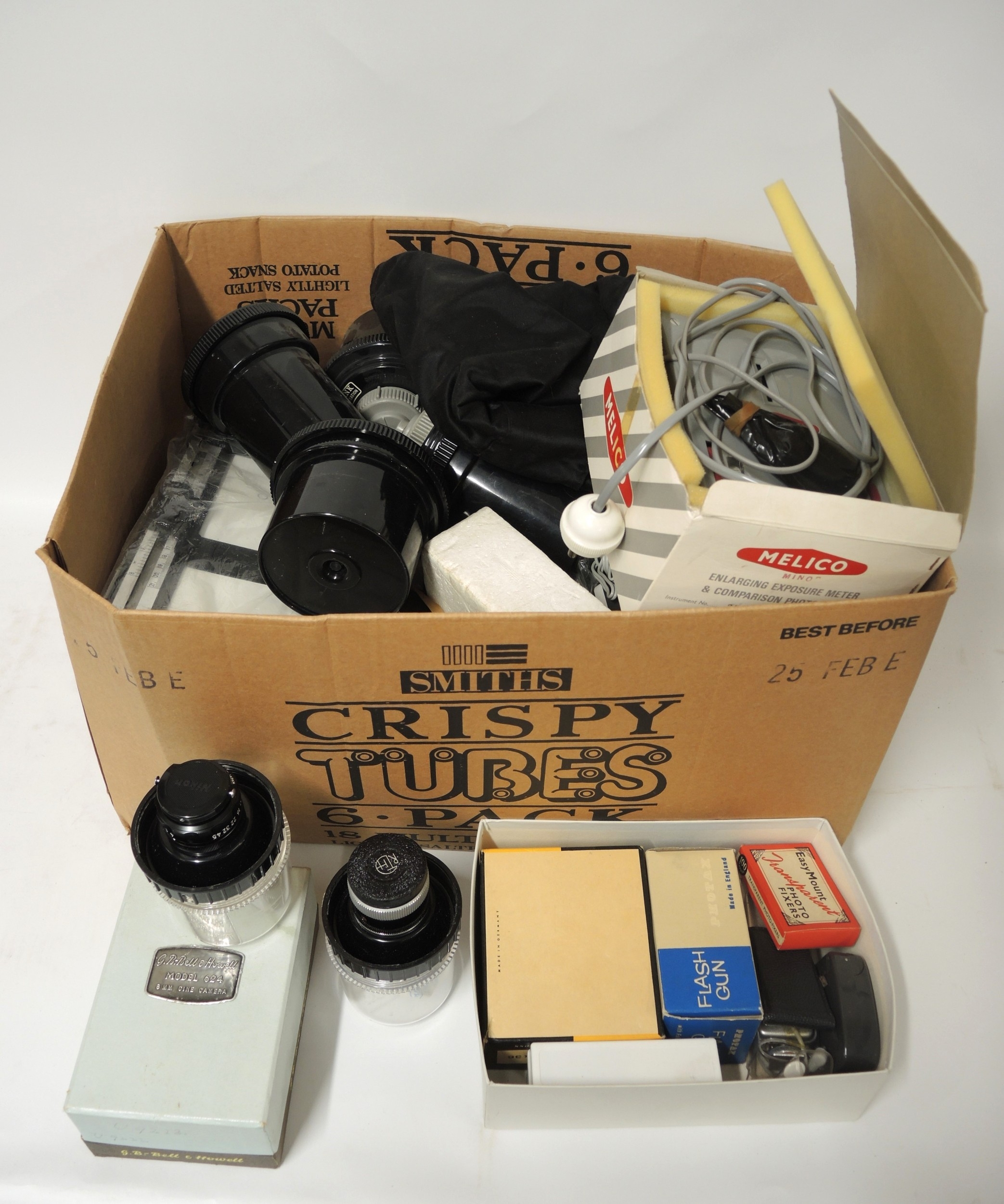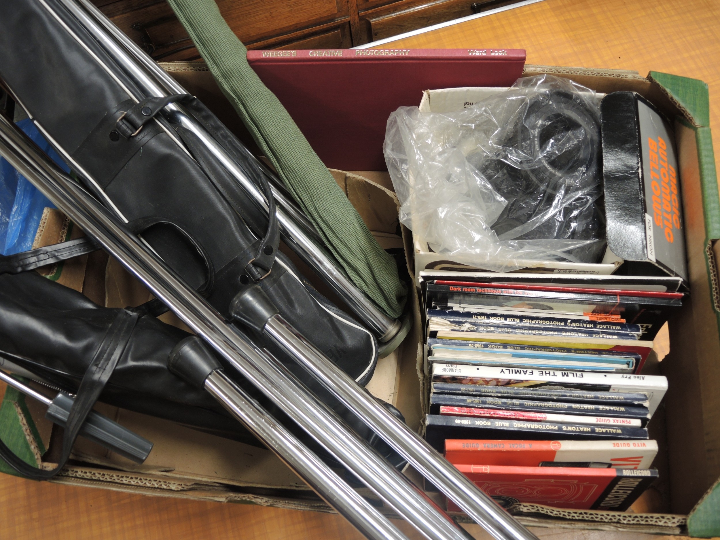 Quantity of various photographic equipment, including lenses by Taylor, Hobson and Nikon, various tripods, an enlarger etc., together with a mid 20th Century wooden banded trunk