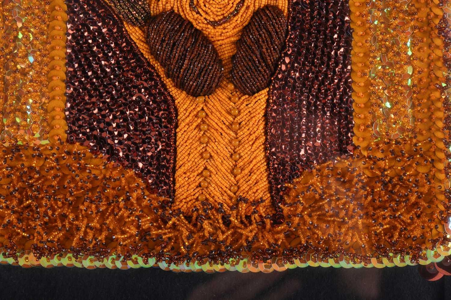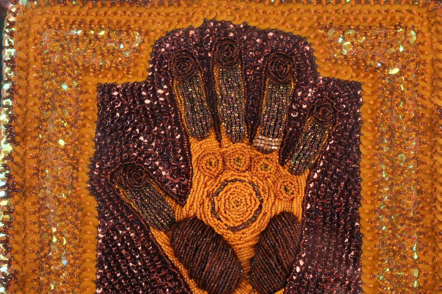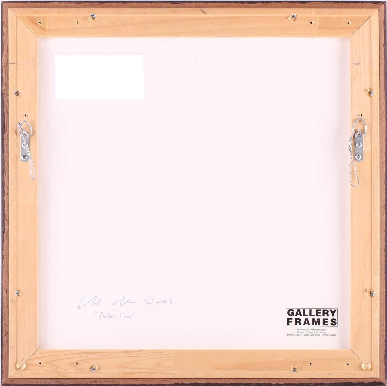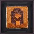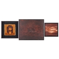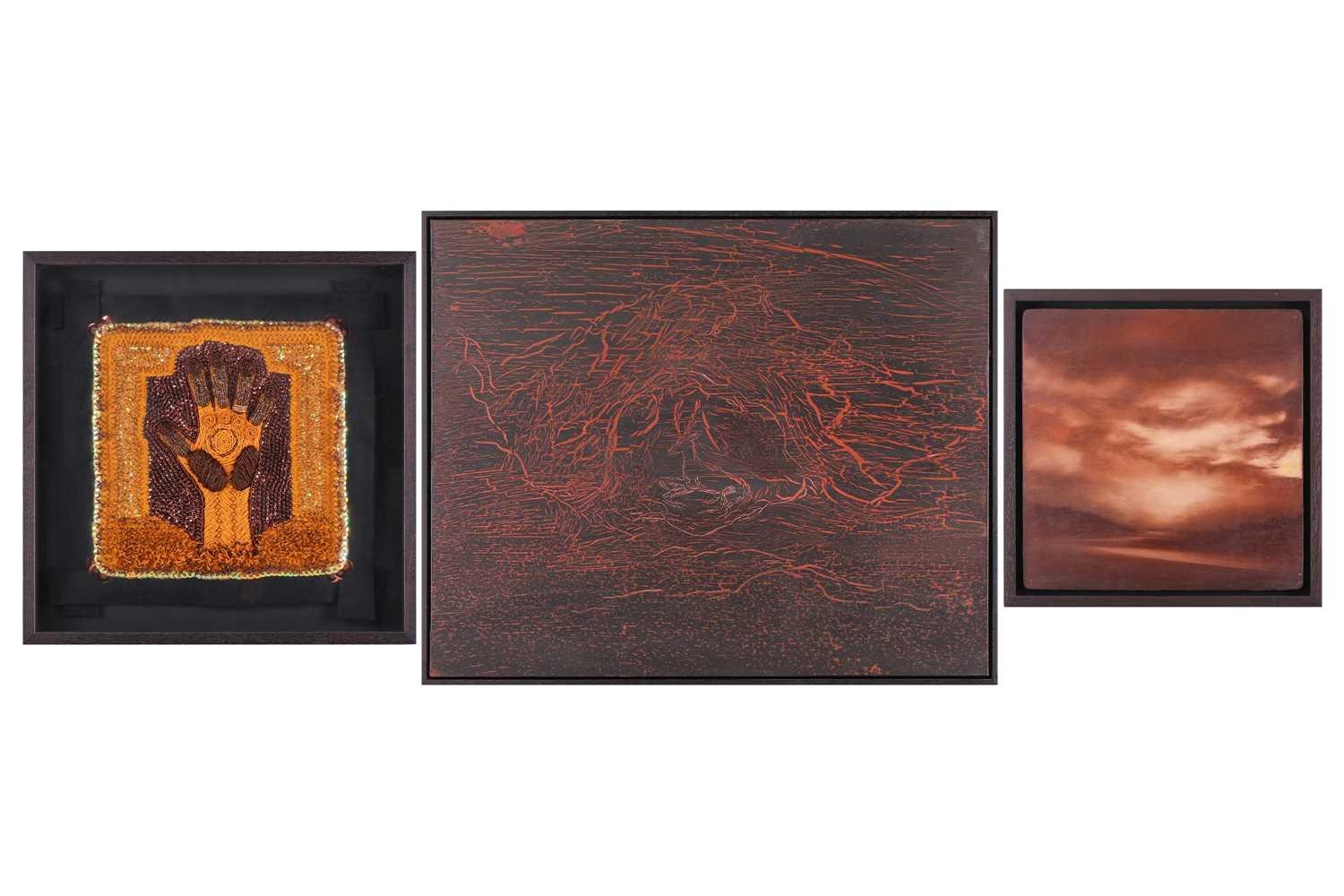† Ilda David (b.1955) Portuguese, Untitled (2022), unsigned, mixed media on canvas, 50 x 61 cm, framed 52 x 63 cm; Curtis Phillips (b,1967) American, 'Arboreal Series #1402 (2002), unsigned, oil and wax on panel, 30.5 x 30.5 cm, framed 34.5 x 34.5 cm; Rebecca Roush (Contemporary) American, 'Amber Hand' (2003), signed and dated verso, beaded fabric, 36 x 36 cm, framed and glazed 42.5 x 42.5 cm Qty: (3)