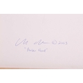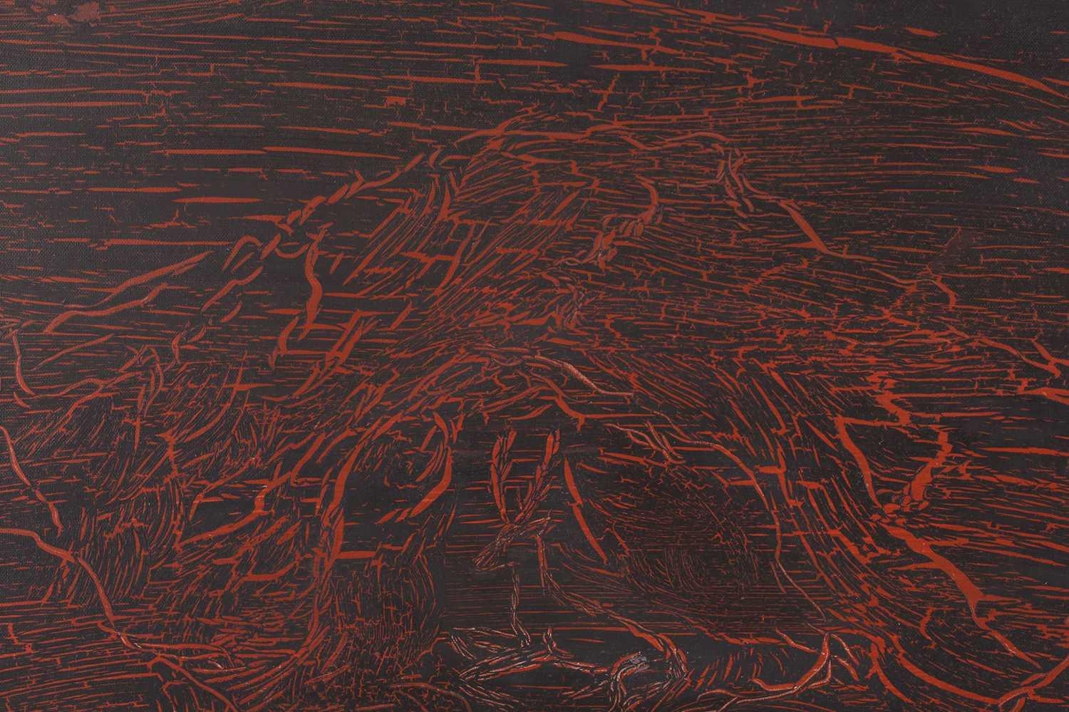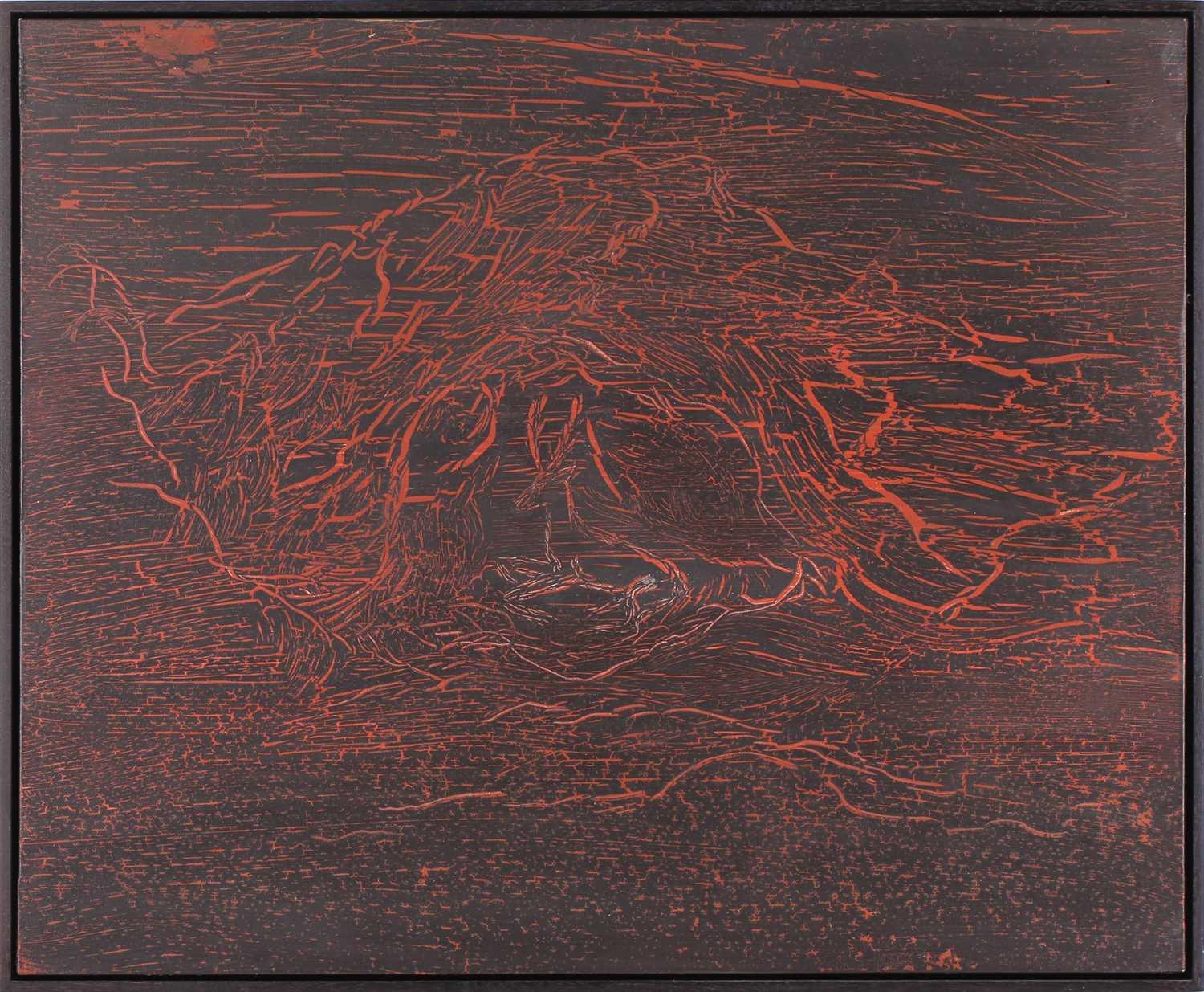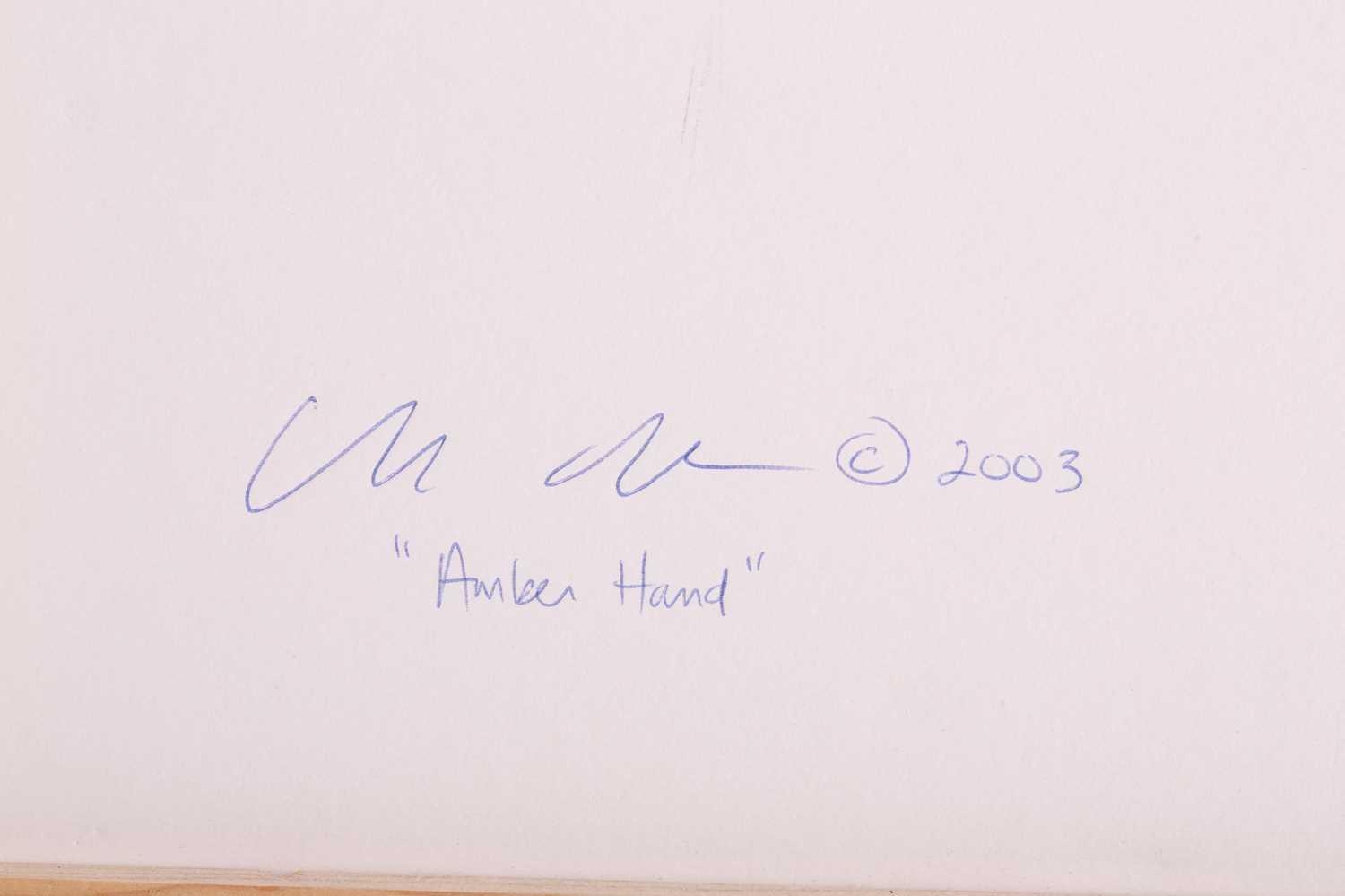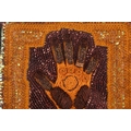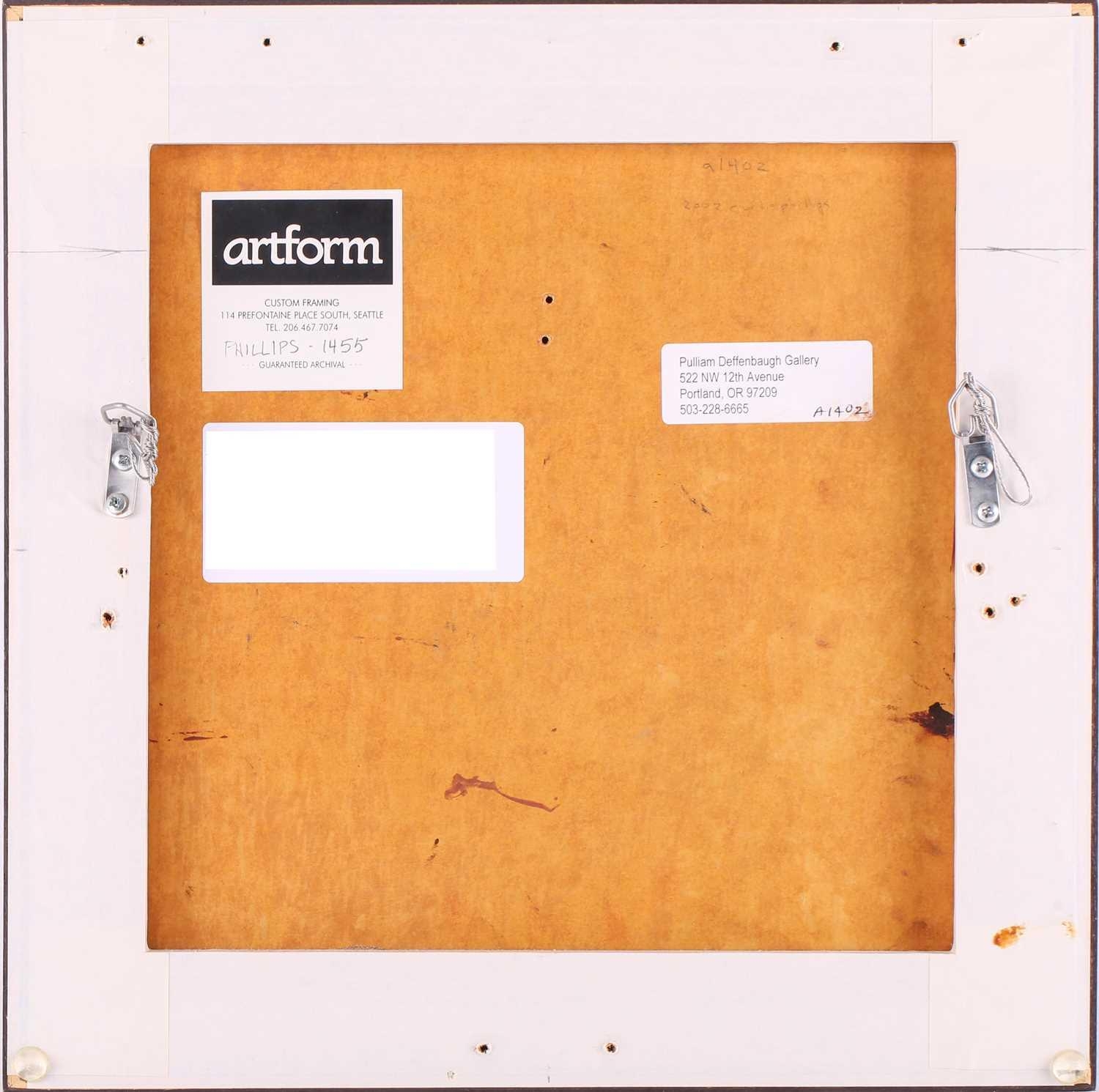 † Ilda David (b.1955) Portuguese, Untitled (2022), unsigned, mixed media on canvas, 50 x 61 cm, framed 52 x 63 cm; Curtis Phillips (b,1967) American, 'Arboreal Series #1402 (2002), unsigned, oil and wax on panel, 30.5 x 30.5 cm, framed 34.5 x 34.5 cm; Rebecca Roush (Contemporary) American, 'Amber Hand' (2003), signed and dated verso, beaded fabric, 36 x 36 cm, framed and glazed 42.5 x 42.5 cm Qty: (3)