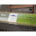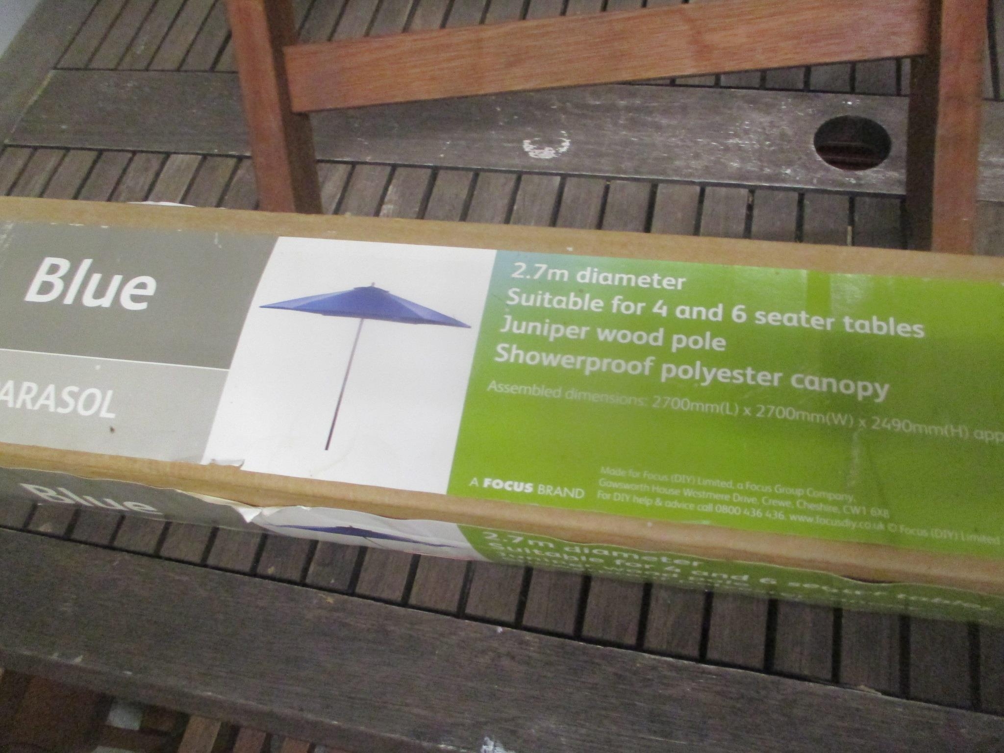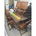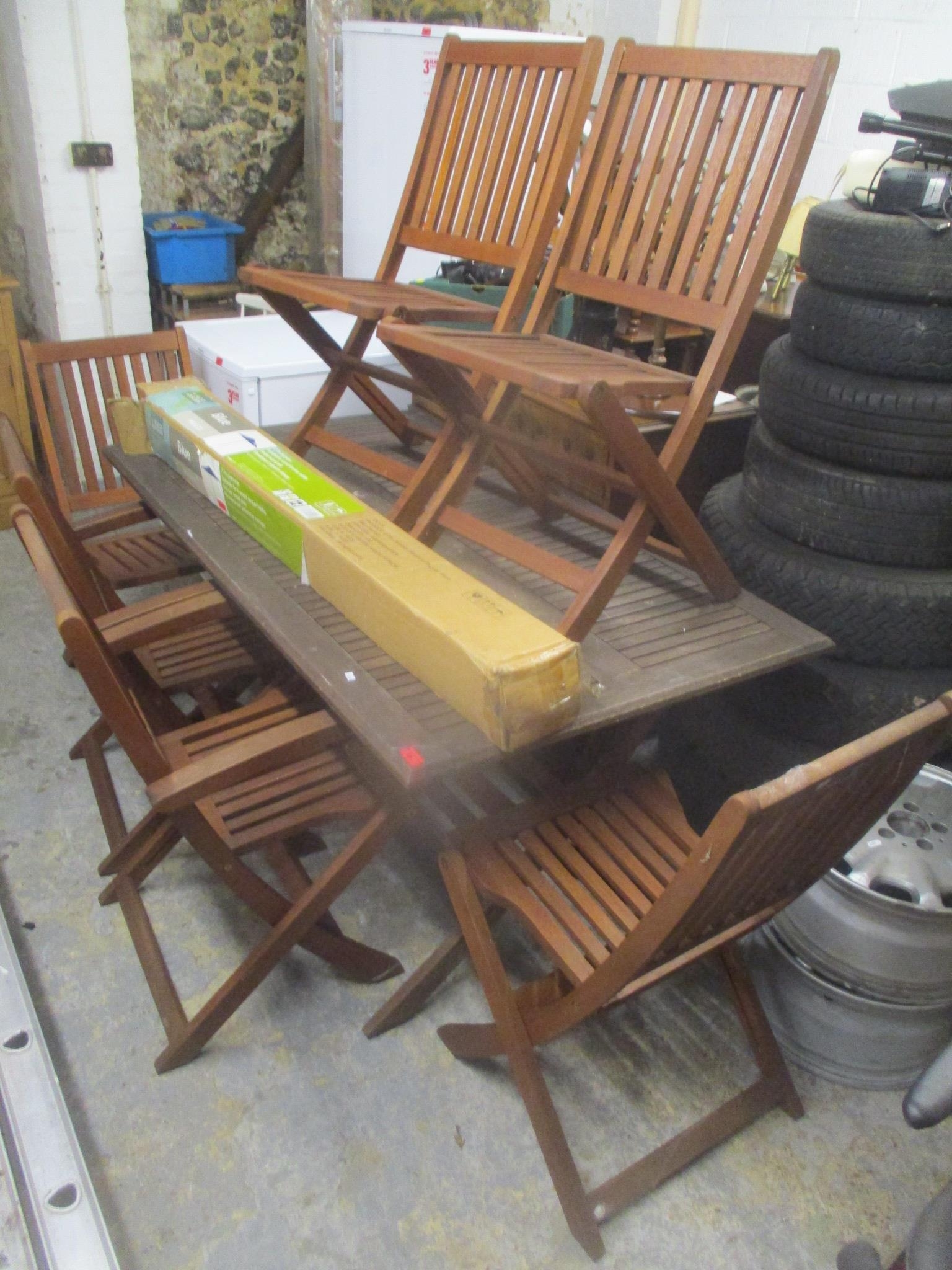 A garden teak table, 74.5cm h x 150cm w, together with four folding chairs and a boxed parasol