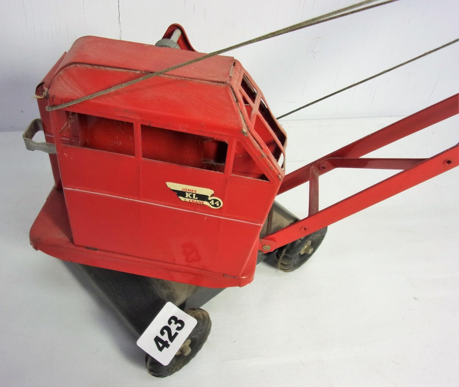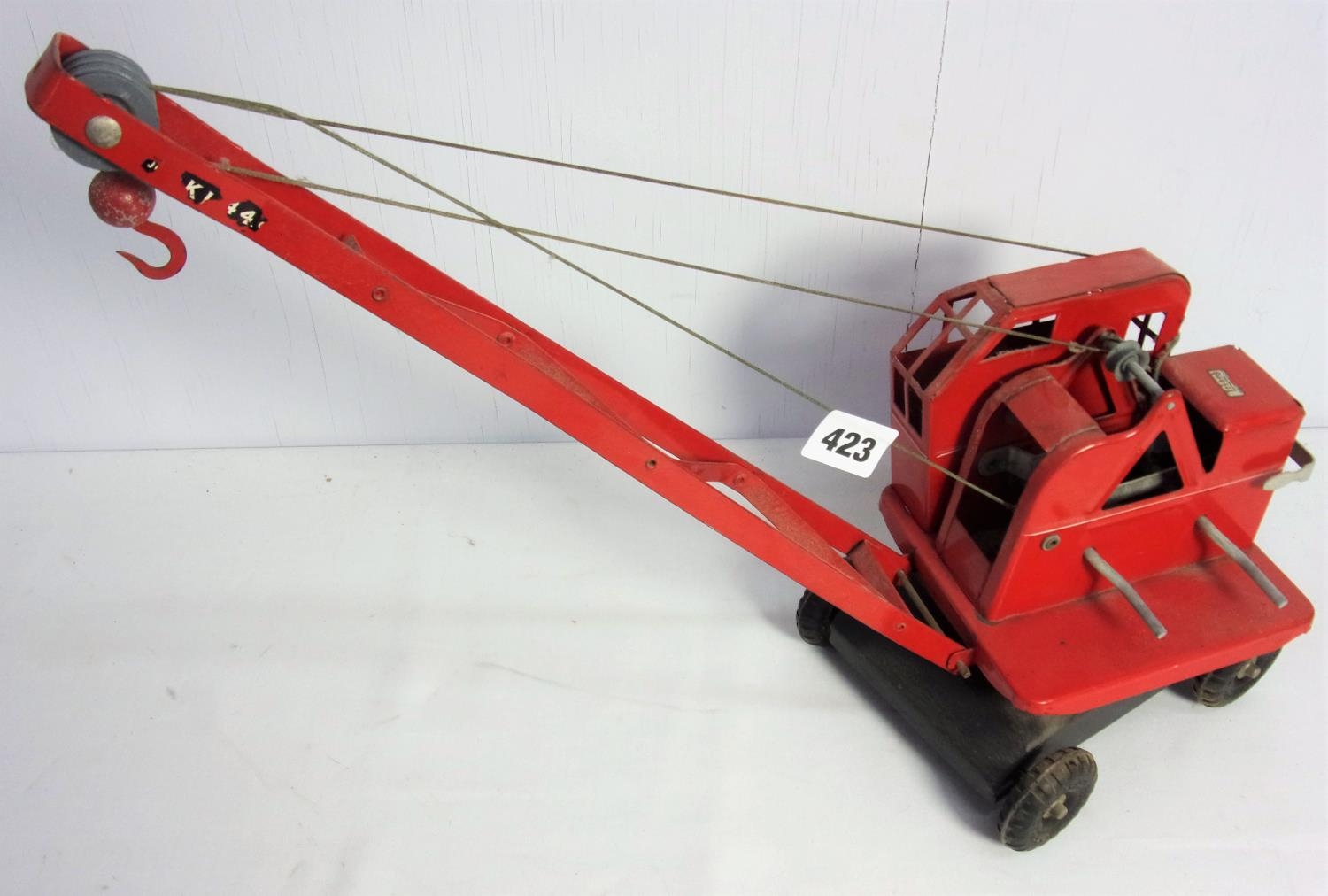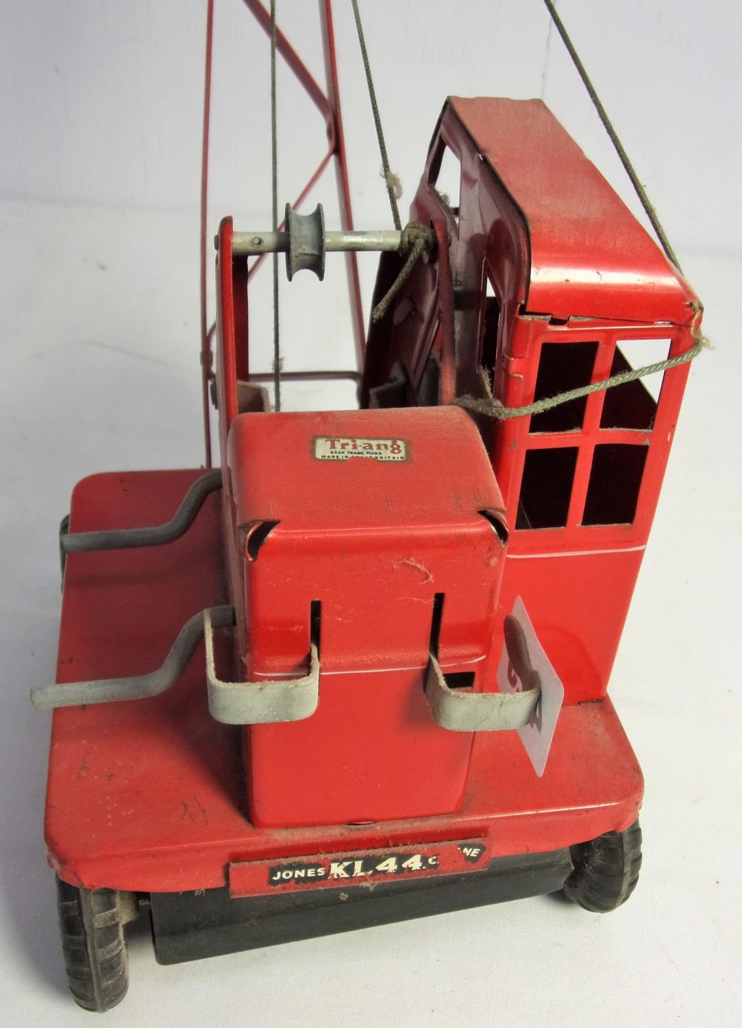 TRIANG TIN PLATE KL JONES CRANE 44 IN GOOD CONDITION WITH GIB WEIGHT AND HOOK