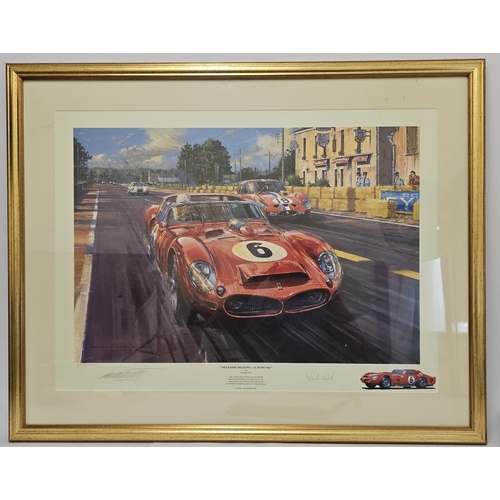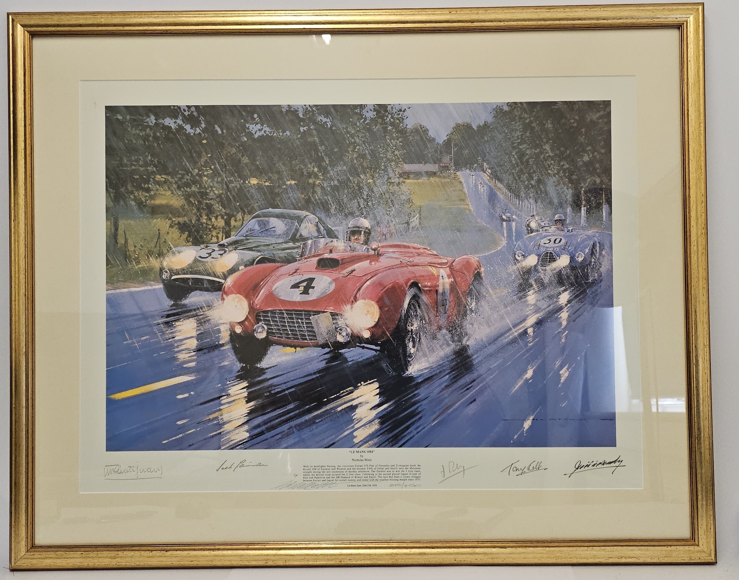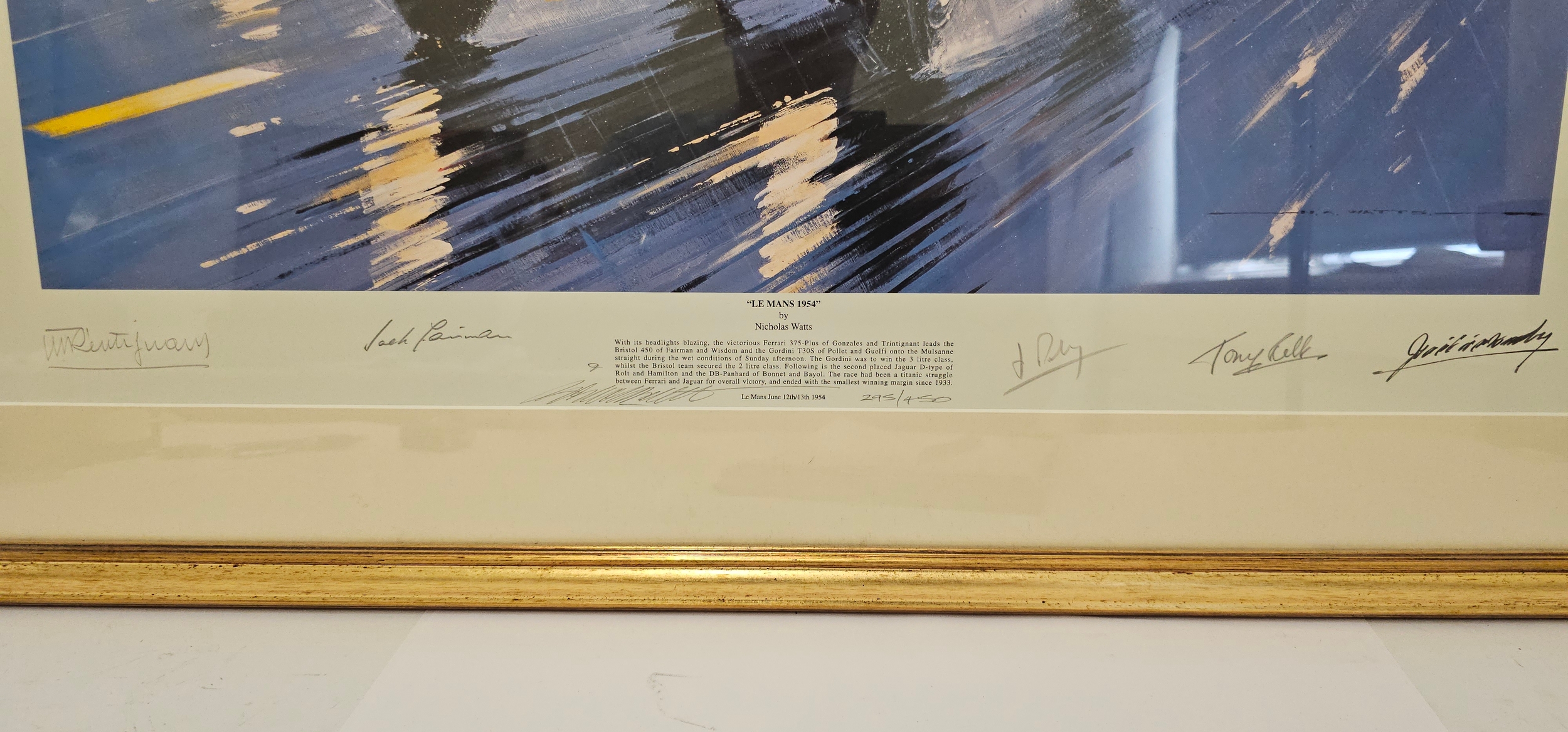 Nicholas Watts, "Le Mans 1954", limited edition print 295/540, signed in pencil by Trintignant, Rolt, Gonzolez, Fairman, Pollet and the artist, 72 x 80 overall framed size.