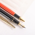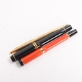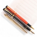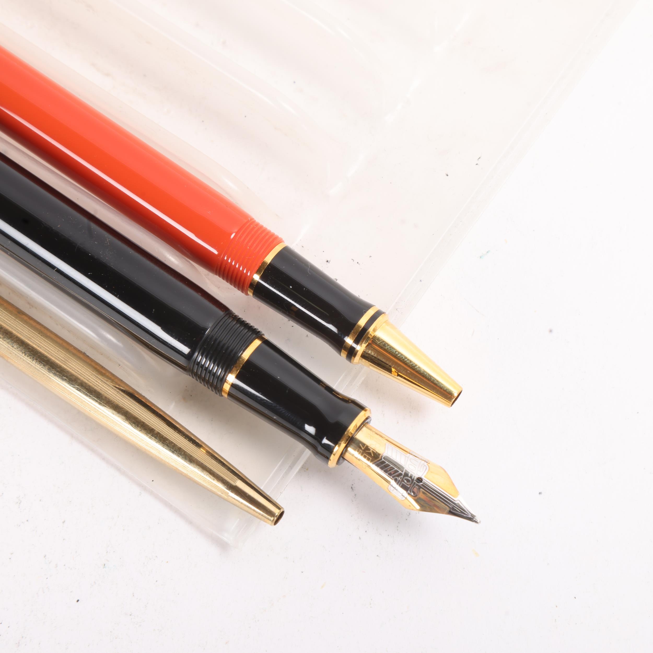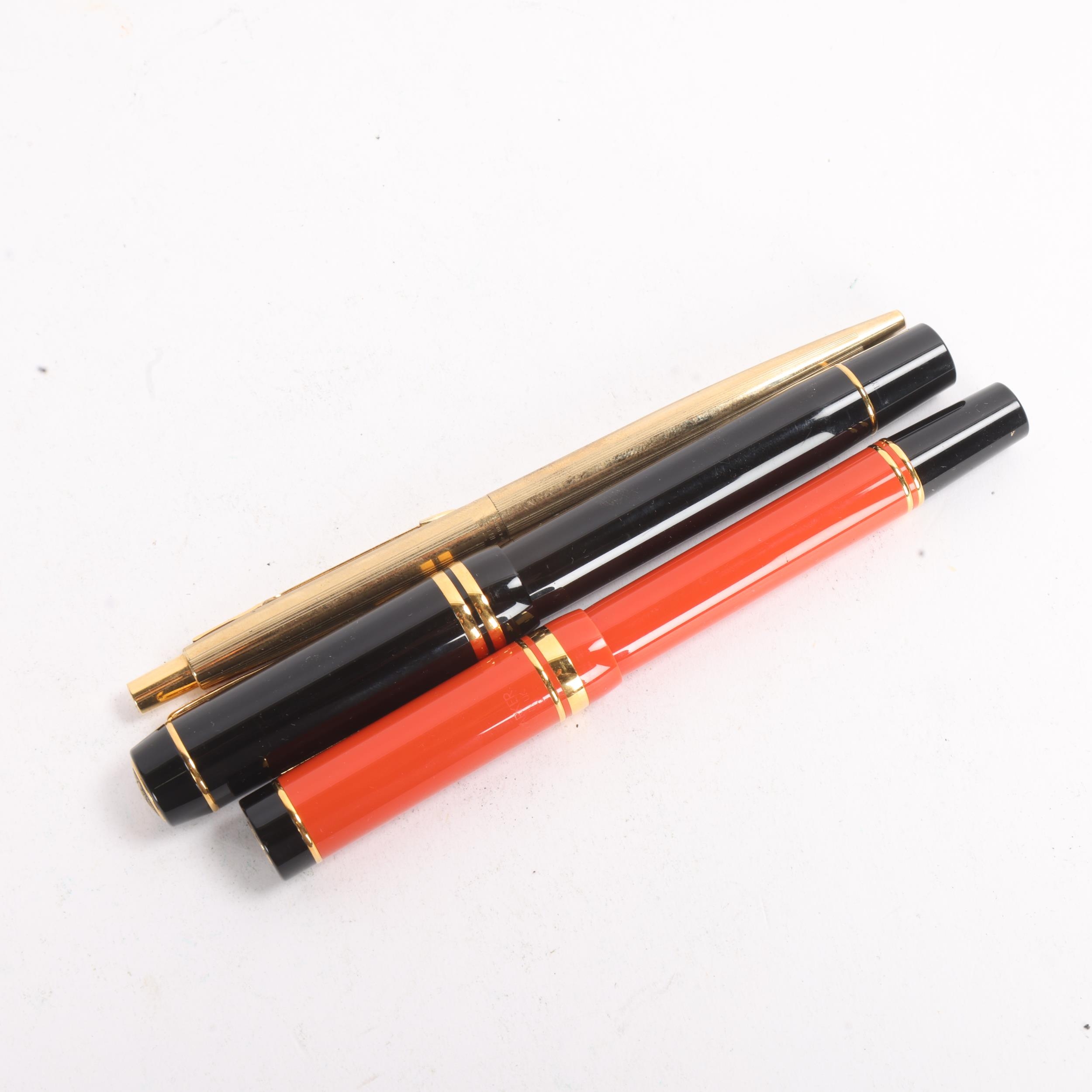 Three Parker pens, including Duofold Centennial black fountain pen with 18K gold nib and converter, length 13.5cm, a Duofold Big Red International ballpoint pen, length 13cm, and a 10K gold filled ballpoint pen, length 13.2cm