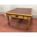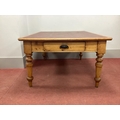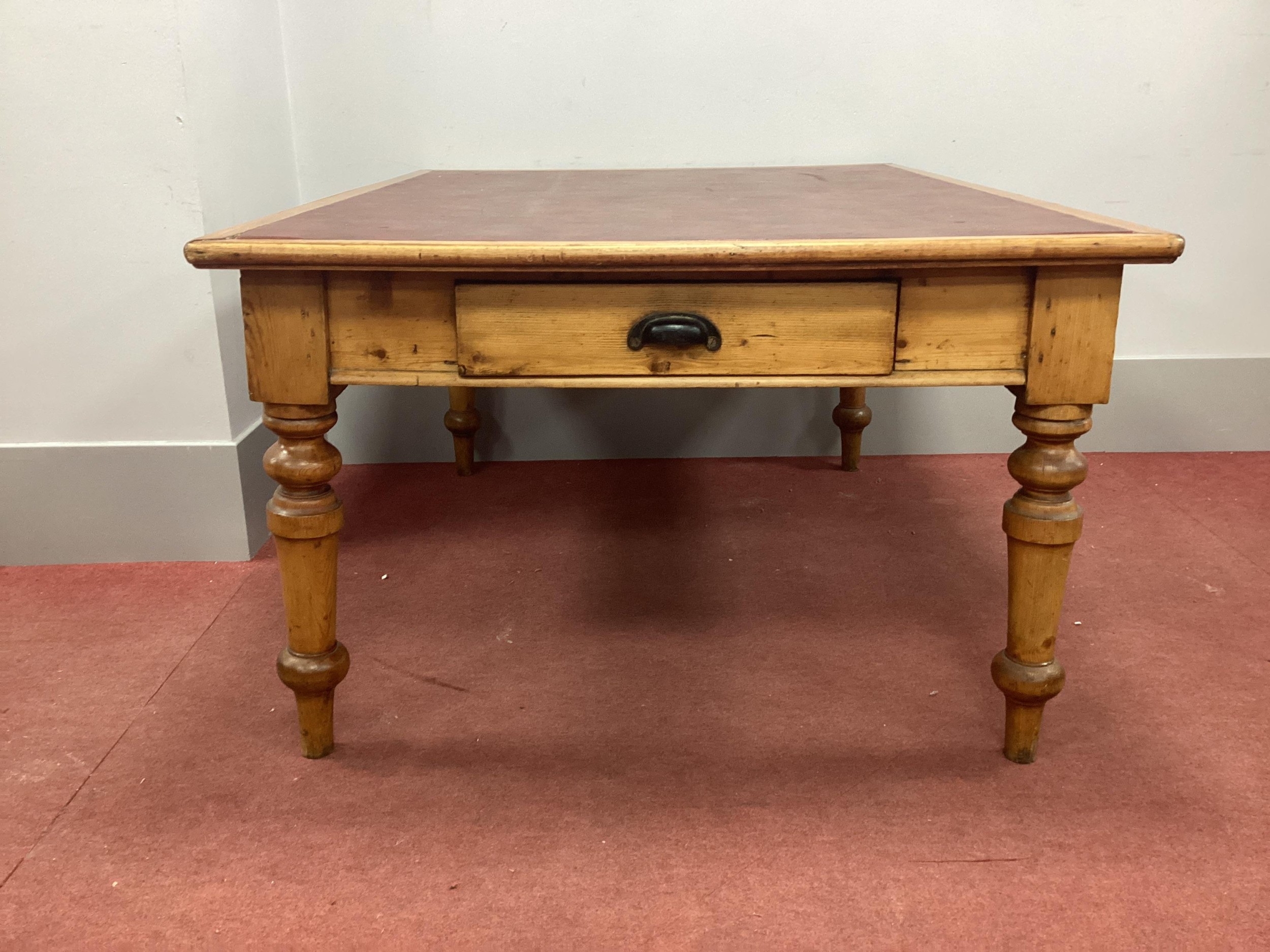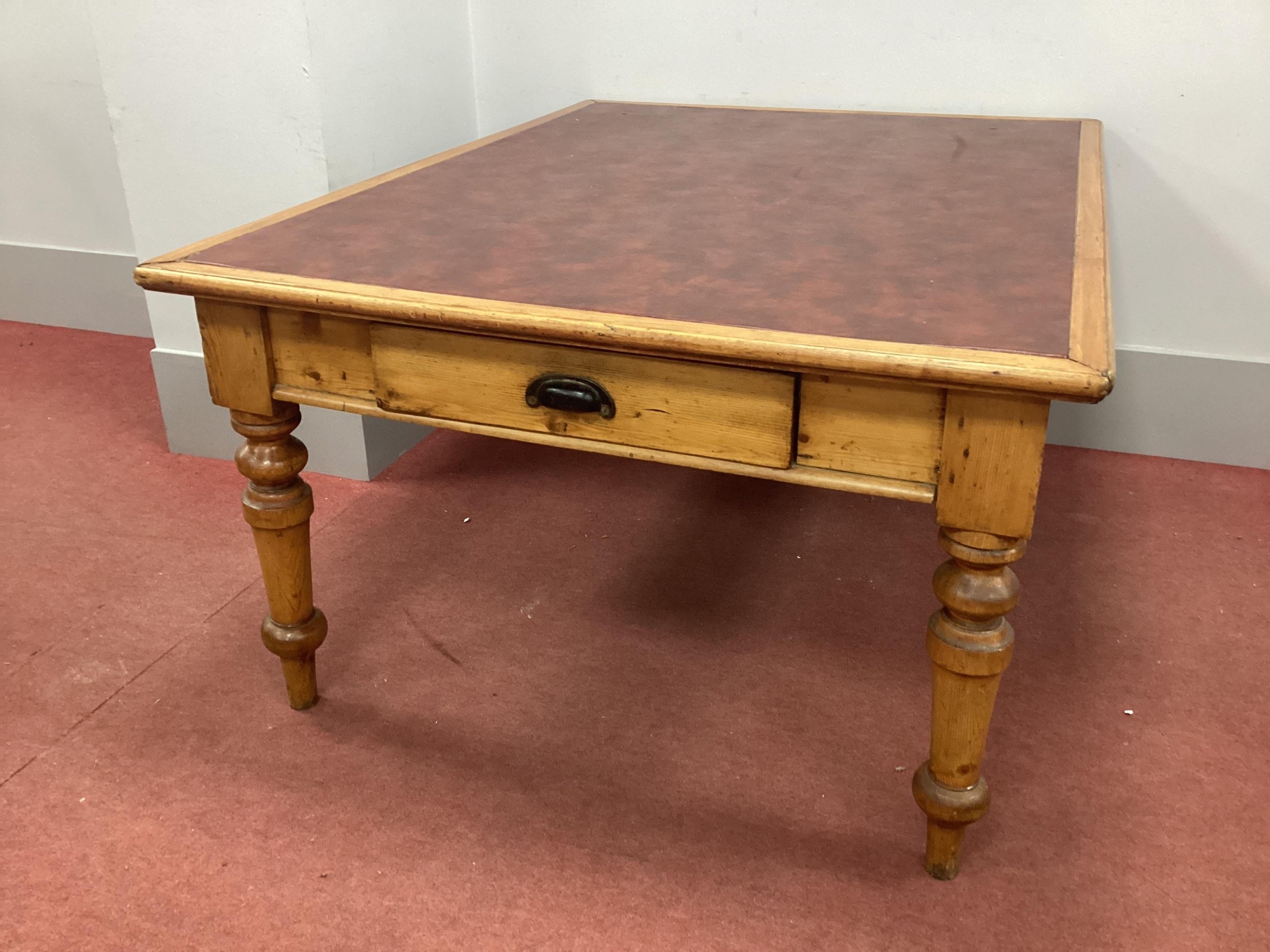 A XIX Century Pine Library Table, with red leatherette sciver and two end drawers, on turned supports, 150cm wide.