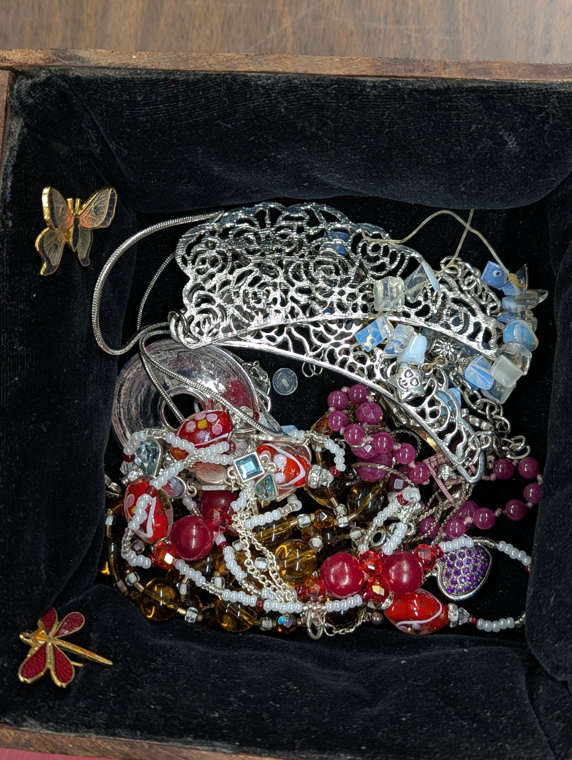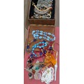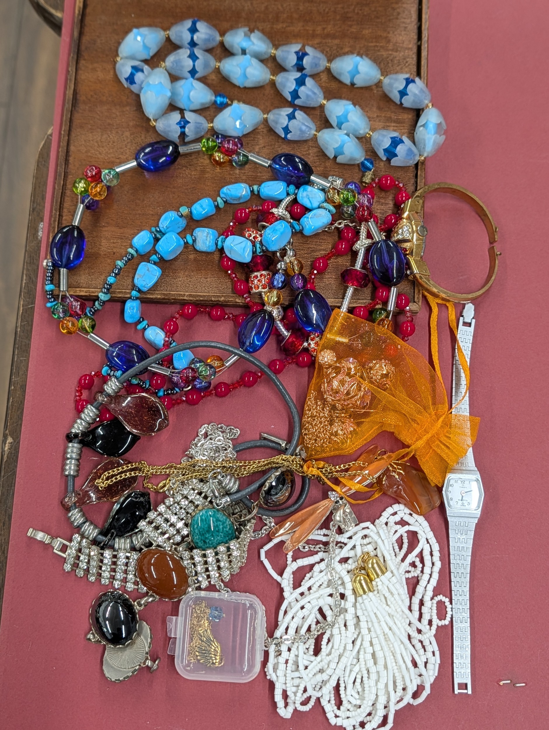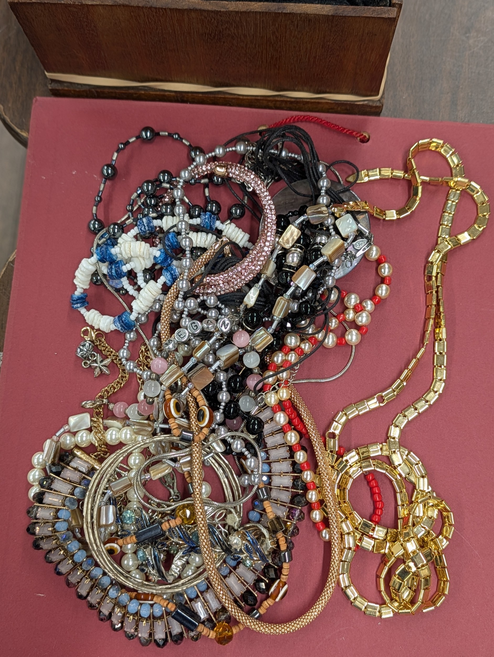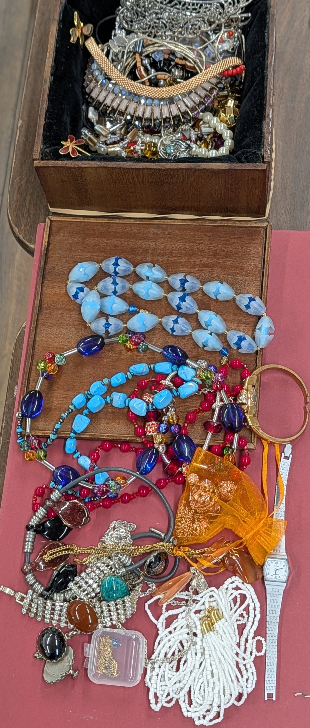 An Assortment of Vintage and Contemporary Costume Jewellery and Watches In Lined Square Wooden Box