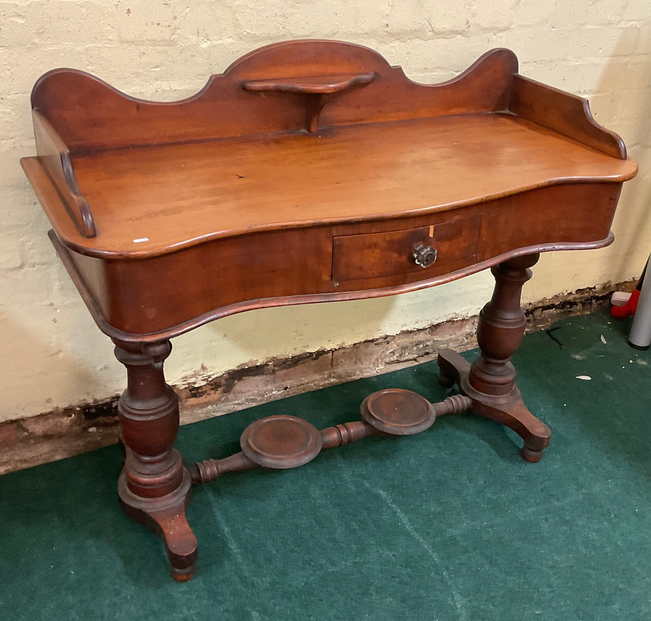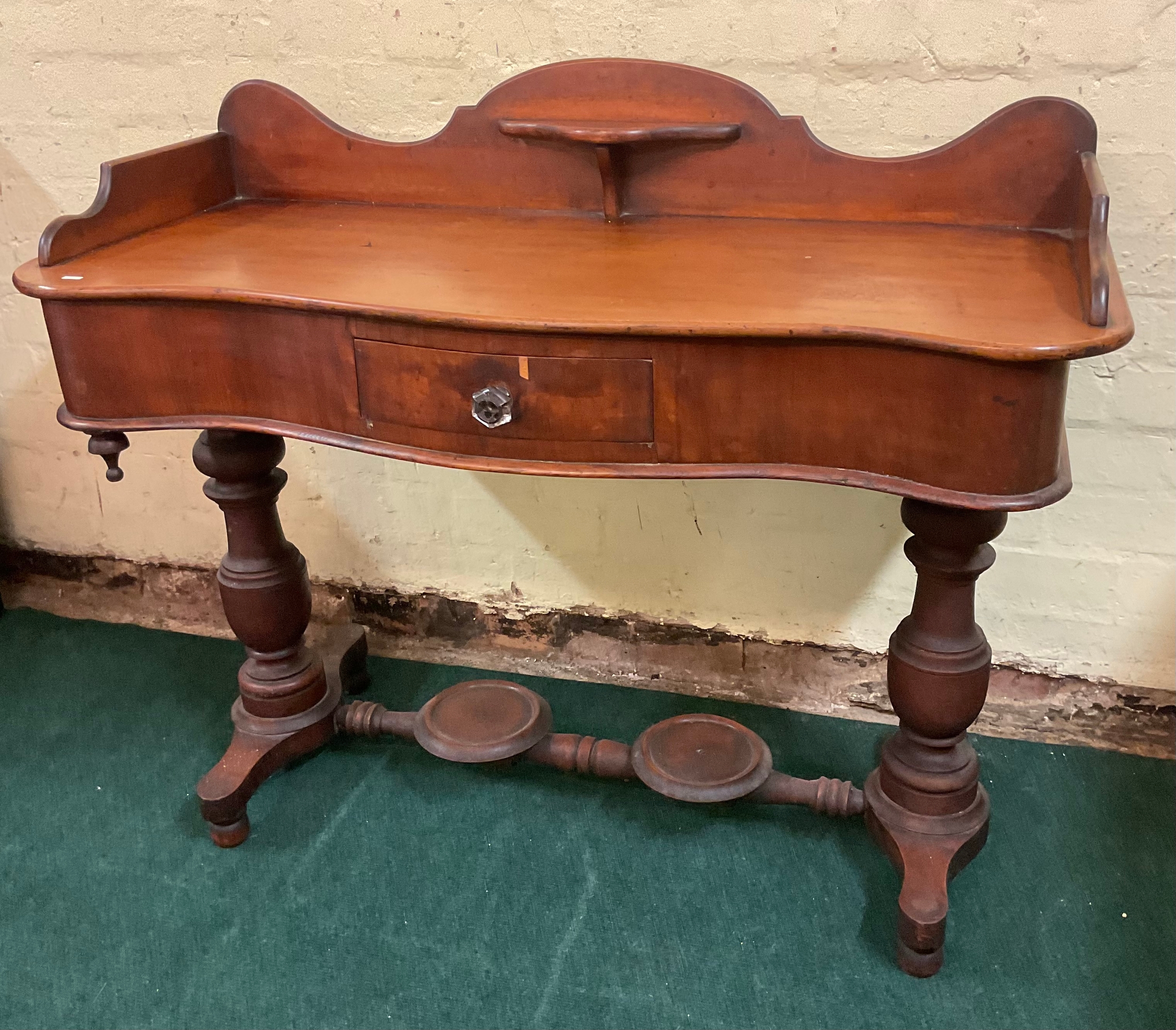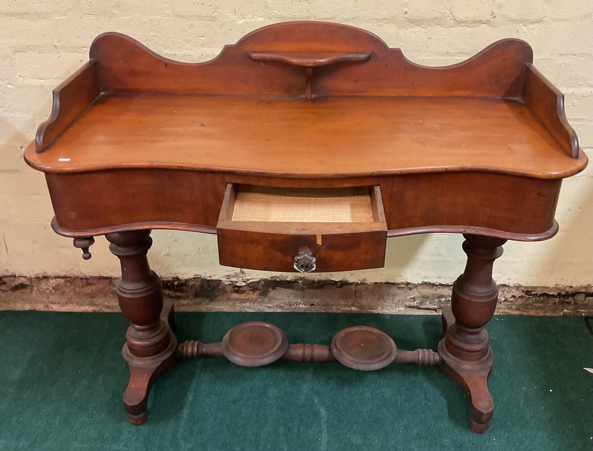 AN ANTIQUE VICTORIAN MAHOGANY WASH STAND/TABLE, MAHOGANY TABLE TOP WITH GALLERY SHELF TO SERPENTINE BACK, OVER SHALED SERPENTINE FRIEZE HOUSING CENTRAL DRAWER, ALL ON TURNED AND CARVED PEDESTAL LEGS STANDING ON TURNED AND CARVED STRETCHER RAILS, WITH JUG STAND AND WASH BOWL STAND TO CENTRAL STRETCHER - APPROX 87.CM.H X 107.CM.W X 43.CM.D