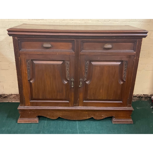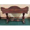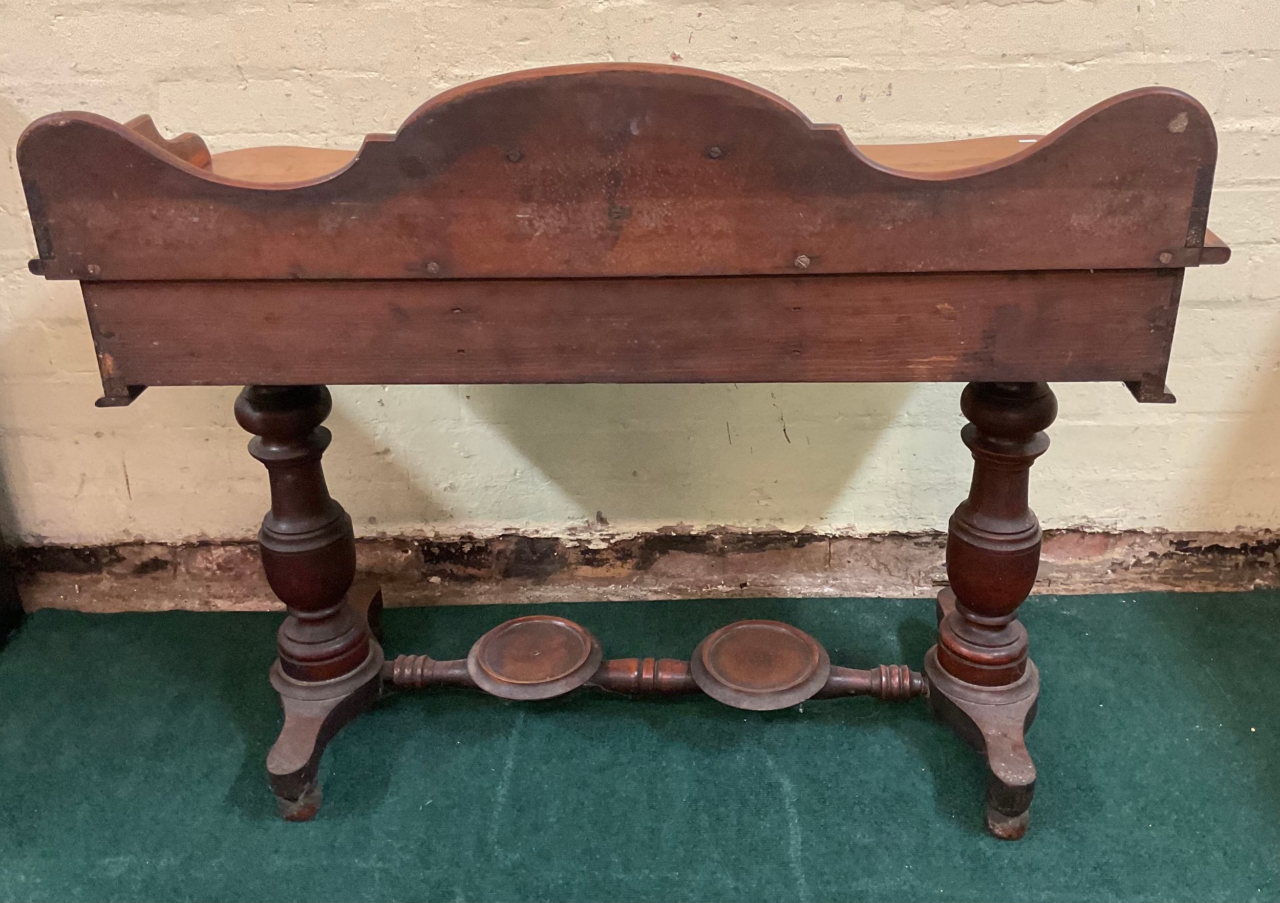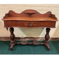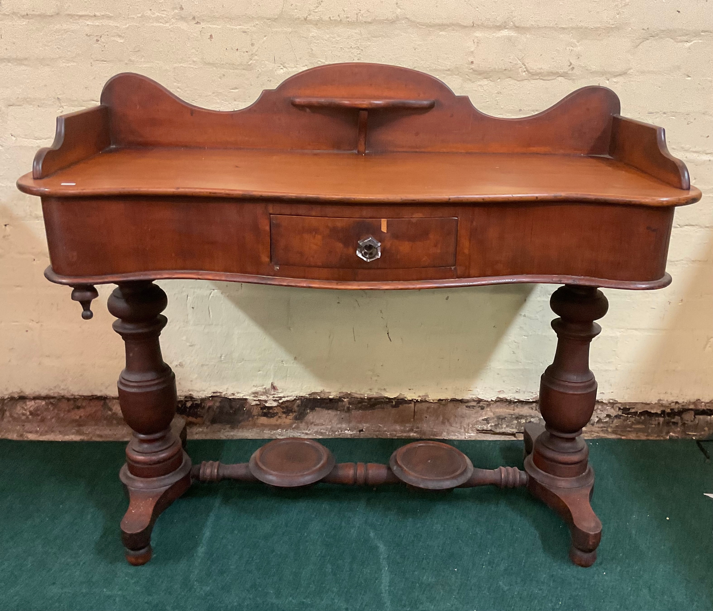 AN ANTIQUE VICTORIAN MAHOGANY WASH STAND/TABLE, MAHOGANY TABLE TOP WITH GALLERY SHELF TO SERPENTINE BACK, OVER SHALED SERPENTINE FRIEZE HOUSING CENTRAL DRAWER, ALL ON TURNED AND CARVED PEDESTAL LEGS STANDING ON TURNED AND CARVED STRETCHER RAILS, WITH JUG STAND AND WASH BOWL STAND TO CENTRAL STRETCHER - APPROX 87.CM.H X 107.CM.W X 43.CM.D