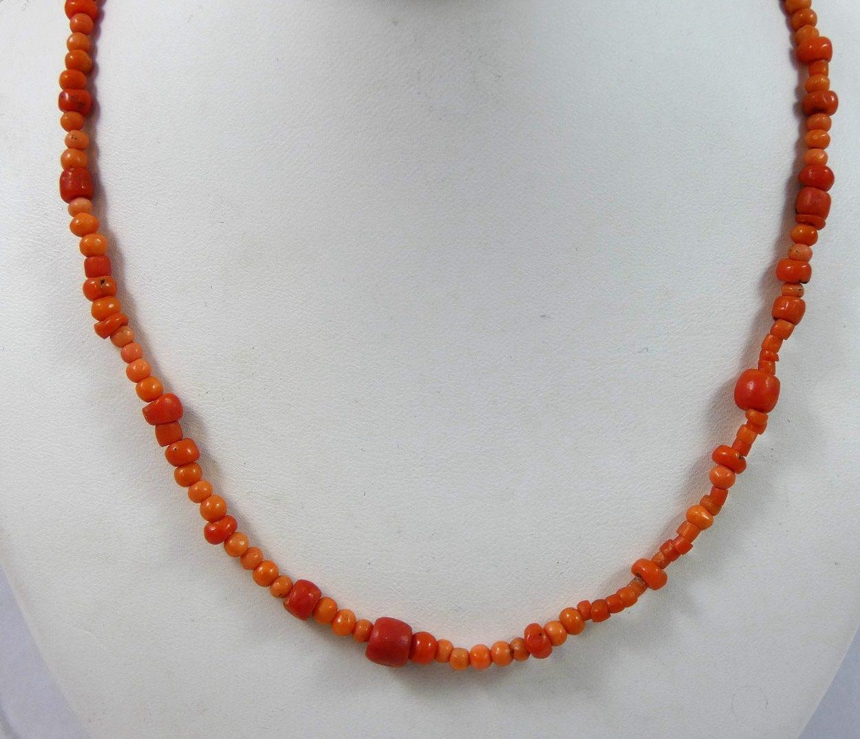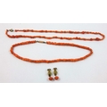 A Victorian coral bead single row necklace, another smaller and a pair of earrings, weight of necklaces 27 gms.