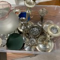 Two silver weighted candlesticks and various other silver plated items.