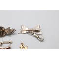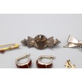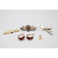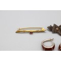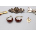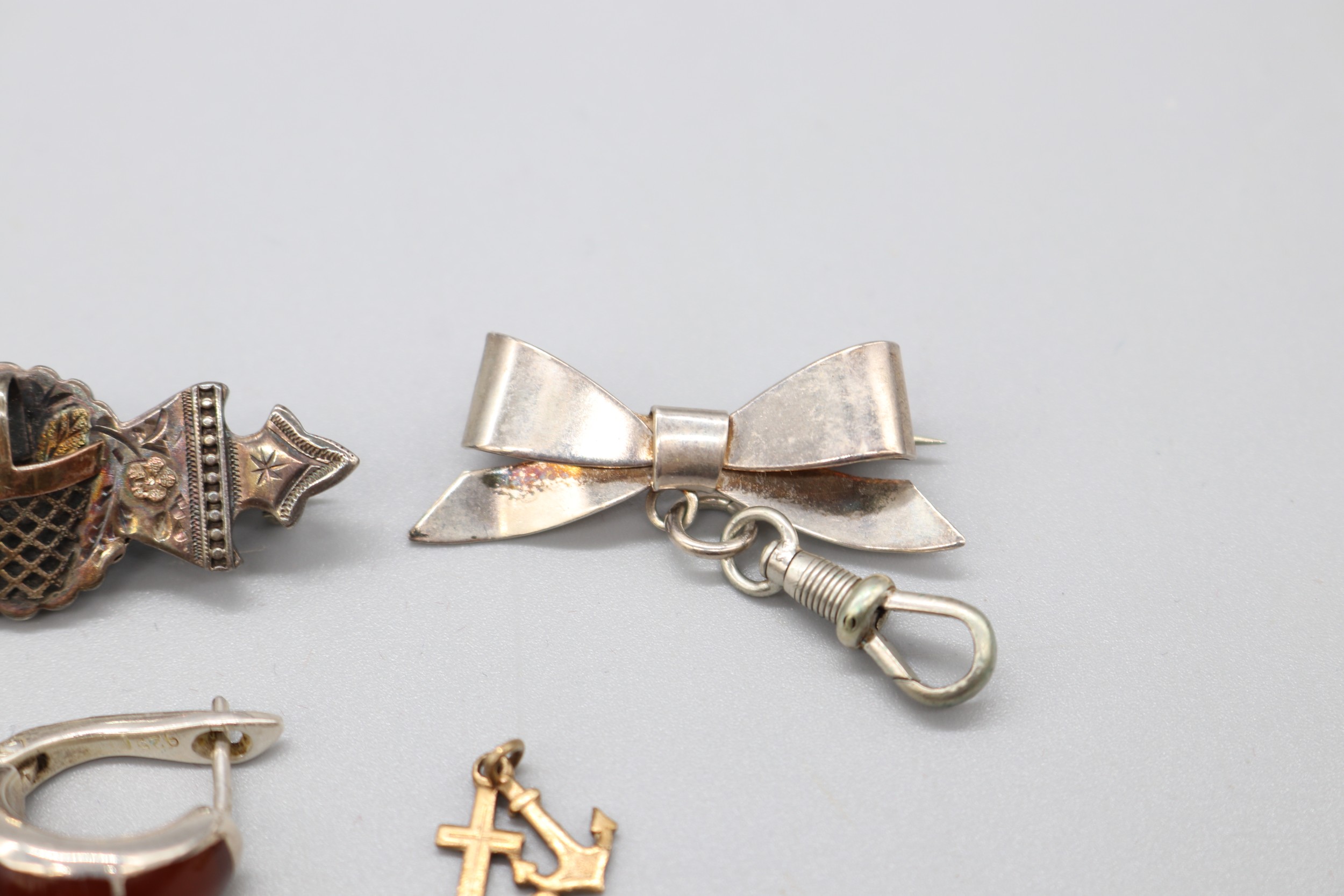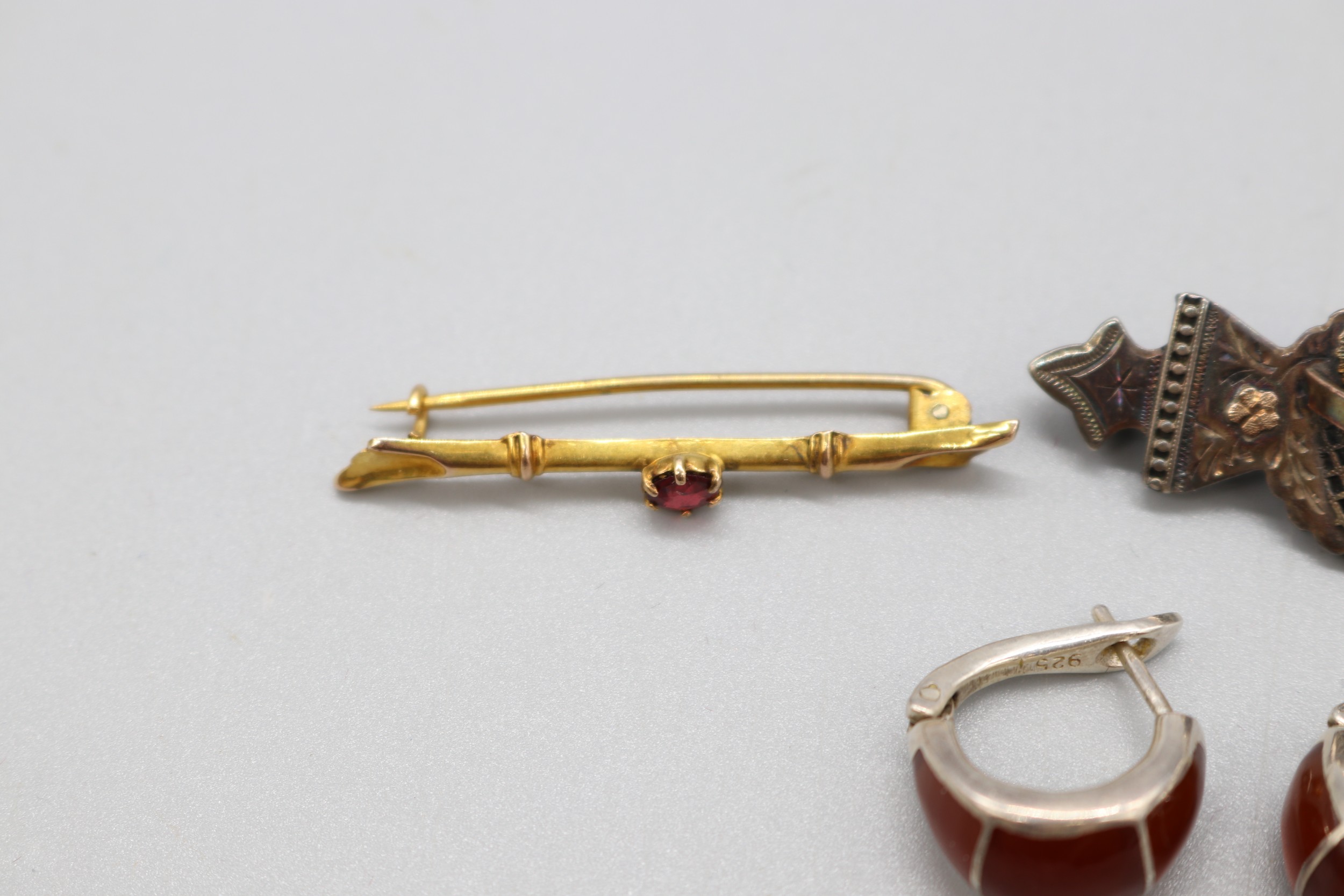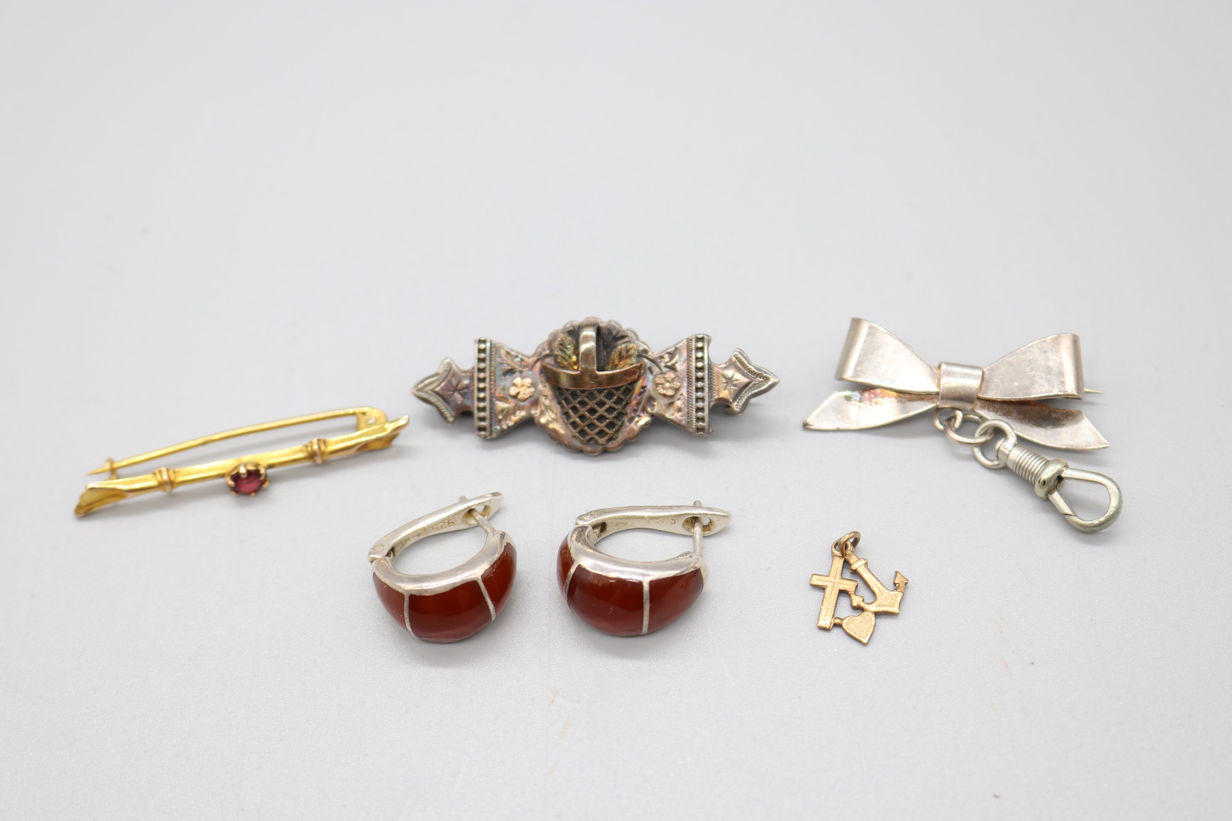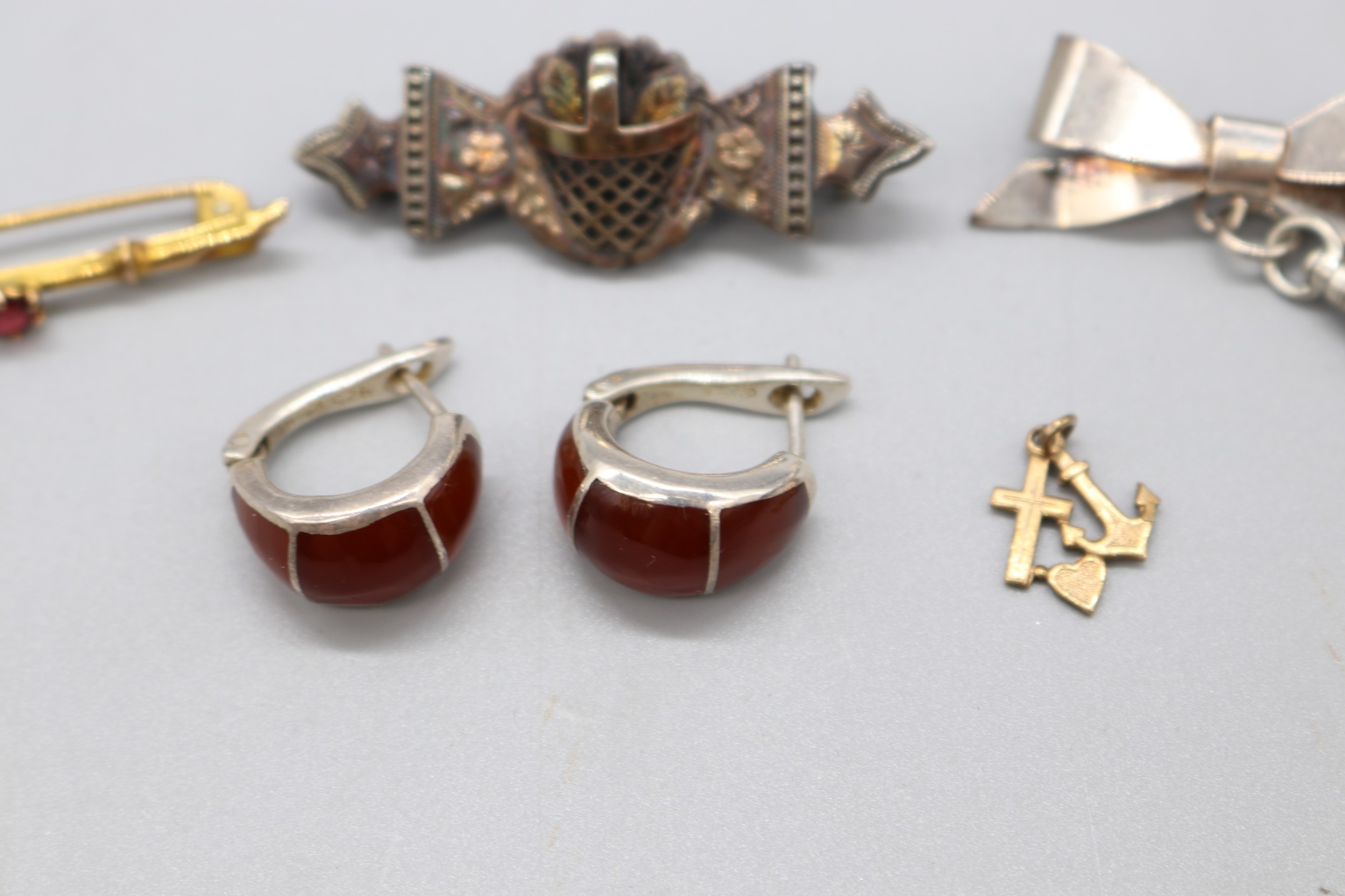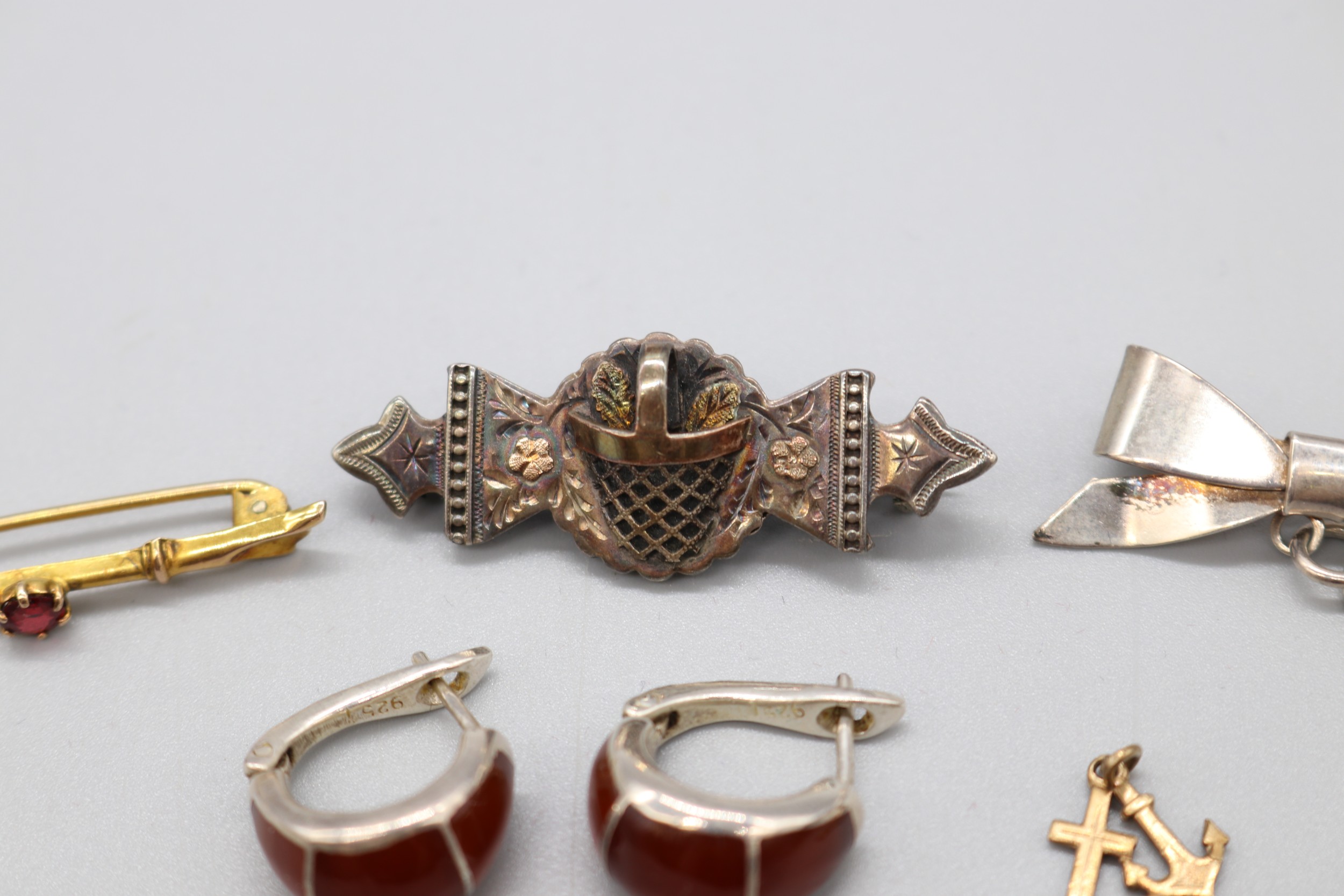 A lot of mixed metal jewellery, comprising a stamped 9ct yellow gold bar brooch with bamboo detail set with a red semi-precious stone (1.29g); a hallmarked 9ct yellow gold faith, hope and charity pendant in the form of a cross, heart and anchor (0.63g); together with a selection of stamped sterling silver items, including a bow bar brooch, an engraved bar brooch with basket detail, and a pair of amber-style hoop earrings. Total silver weight 16.5g