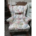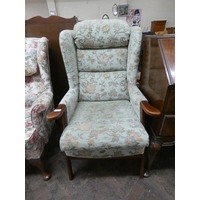 A wing backed easy chair in floral figured tapestry covering standing on cabriole feet