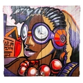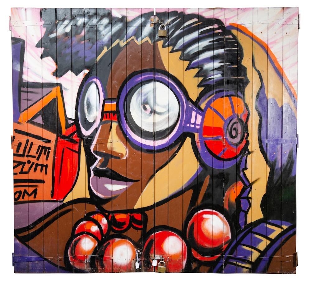Wumi ''Wumzum'' Olaosebikan (British/Nigerian, Contemporary) Camden Lock Gates Mural 2014 Aerosol Paint 210 x 196cm A renowned grafitti artist, illustrator, muralist and animator, Wumzum specialises in character & world design and takes inspiration from a range of sources: the visual language of comics; the interactivity of video games; the dynamism of graffiti; and the fluidity of the London Jazz scene. This work has been described in his own words; 'I'd say this piece was at the beginning of my street art journey. I was finally painting with the big boys'