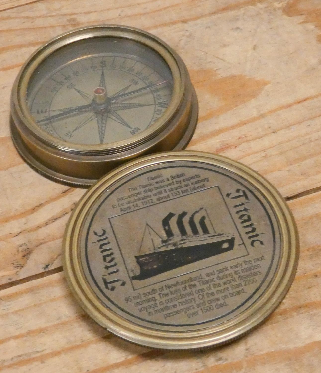 A brass hand held Titanic commemorative compass