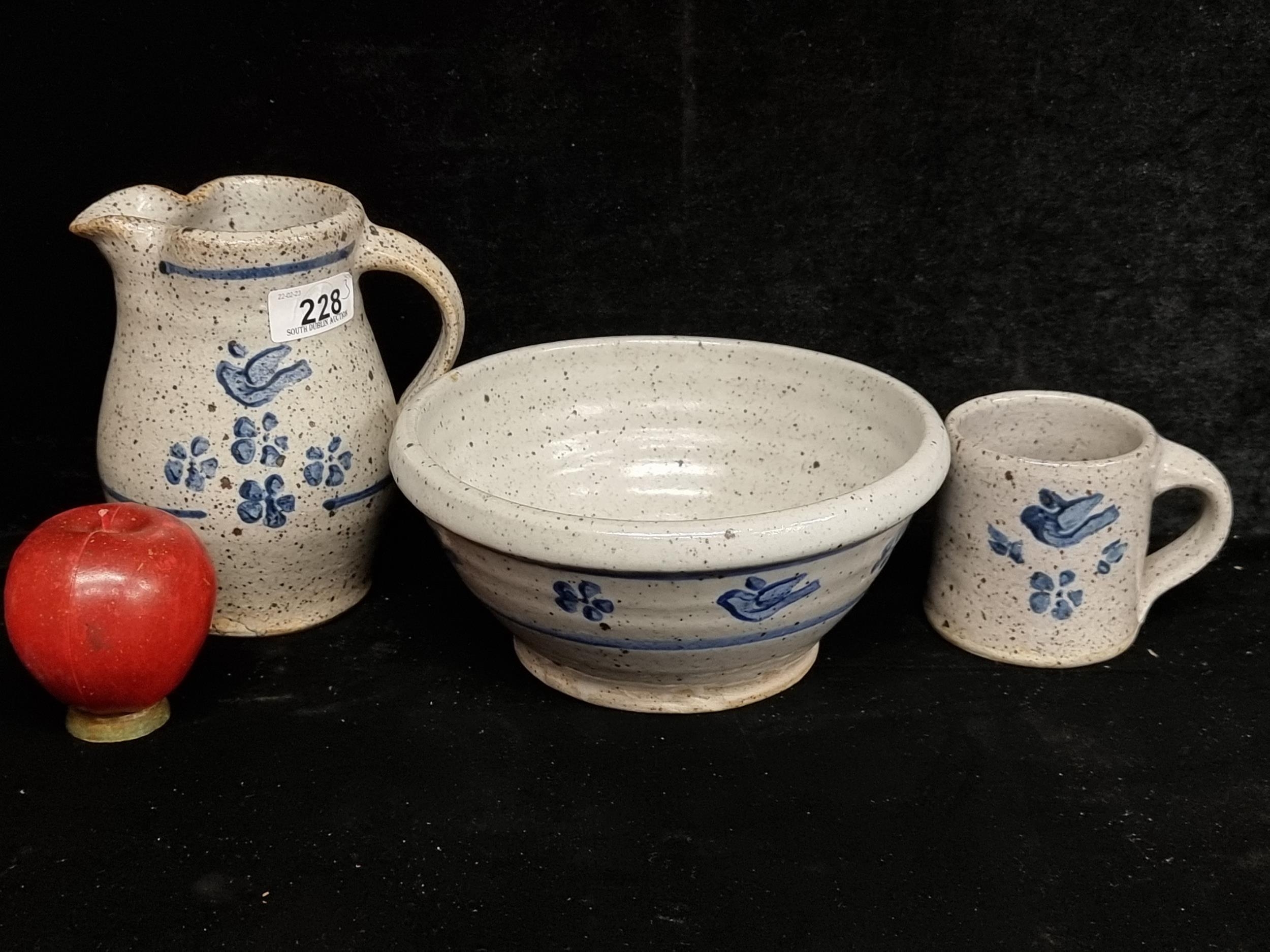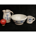 Three great pieces of vintage spongeware pottery by Irish designer Nicholas Mosse including a pitcher jug, large bowl and mug. With a lovely salt glaze in shades of grey and blue. Bowl pressed with the initial "M". All in very good condition.