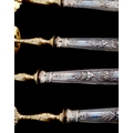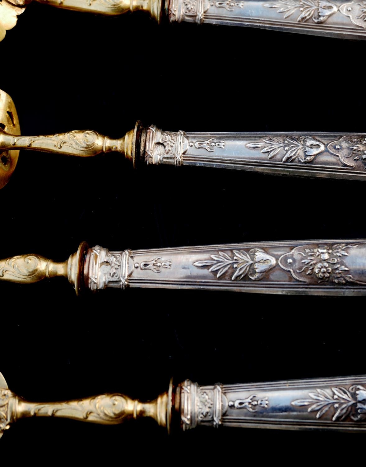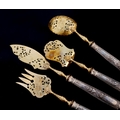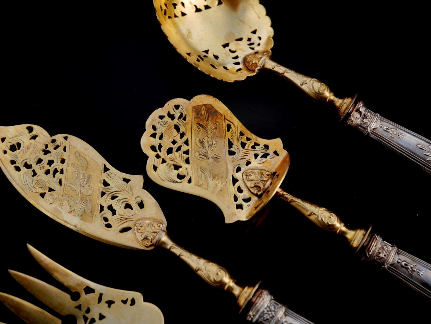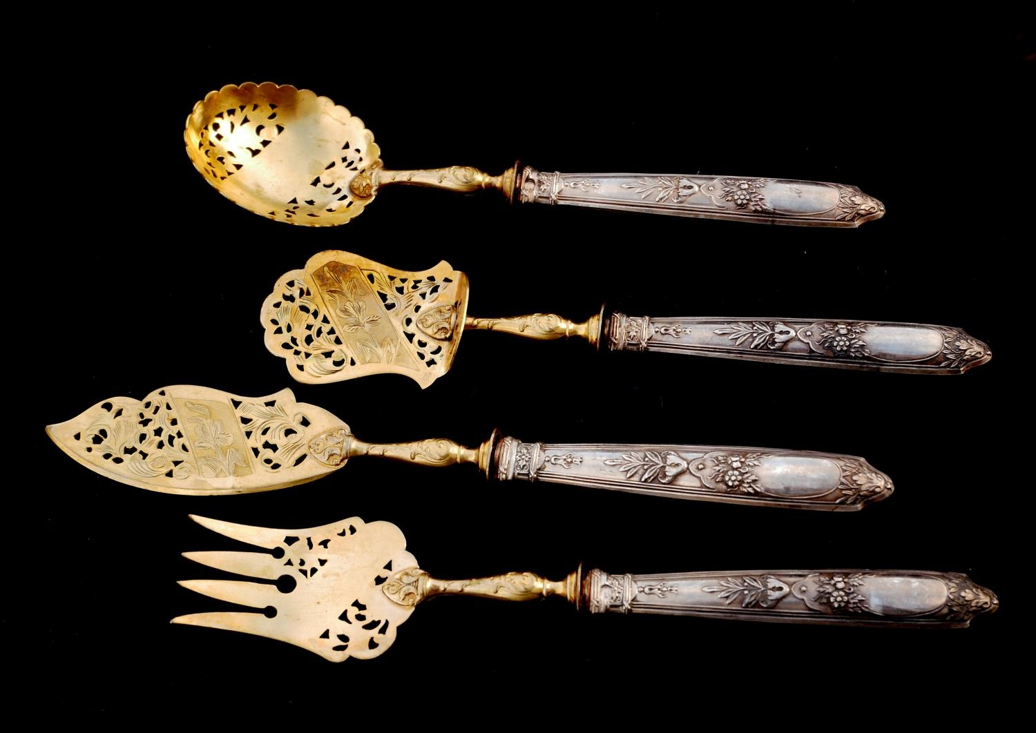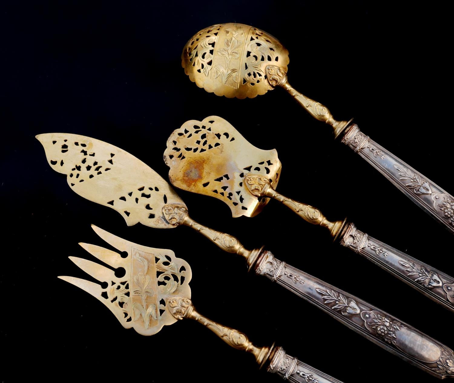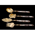 A 19TH CENTURY FRENCH FOUR PIECE SILVER GILT VERMEIL FISH SERVING SET