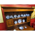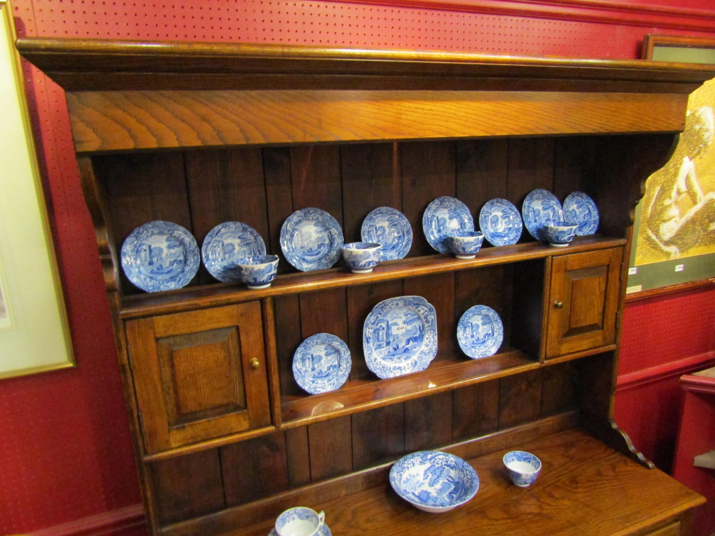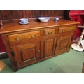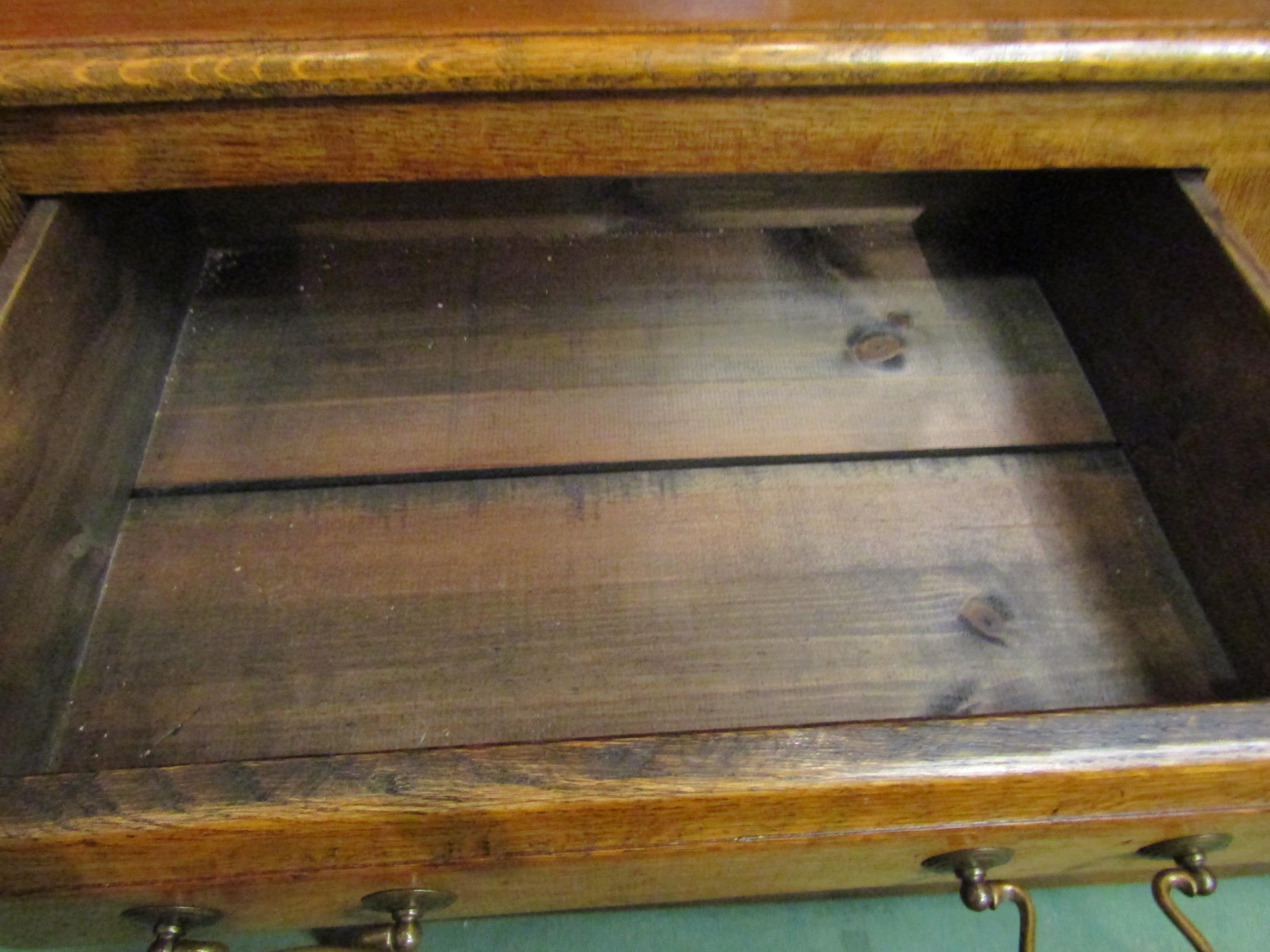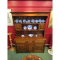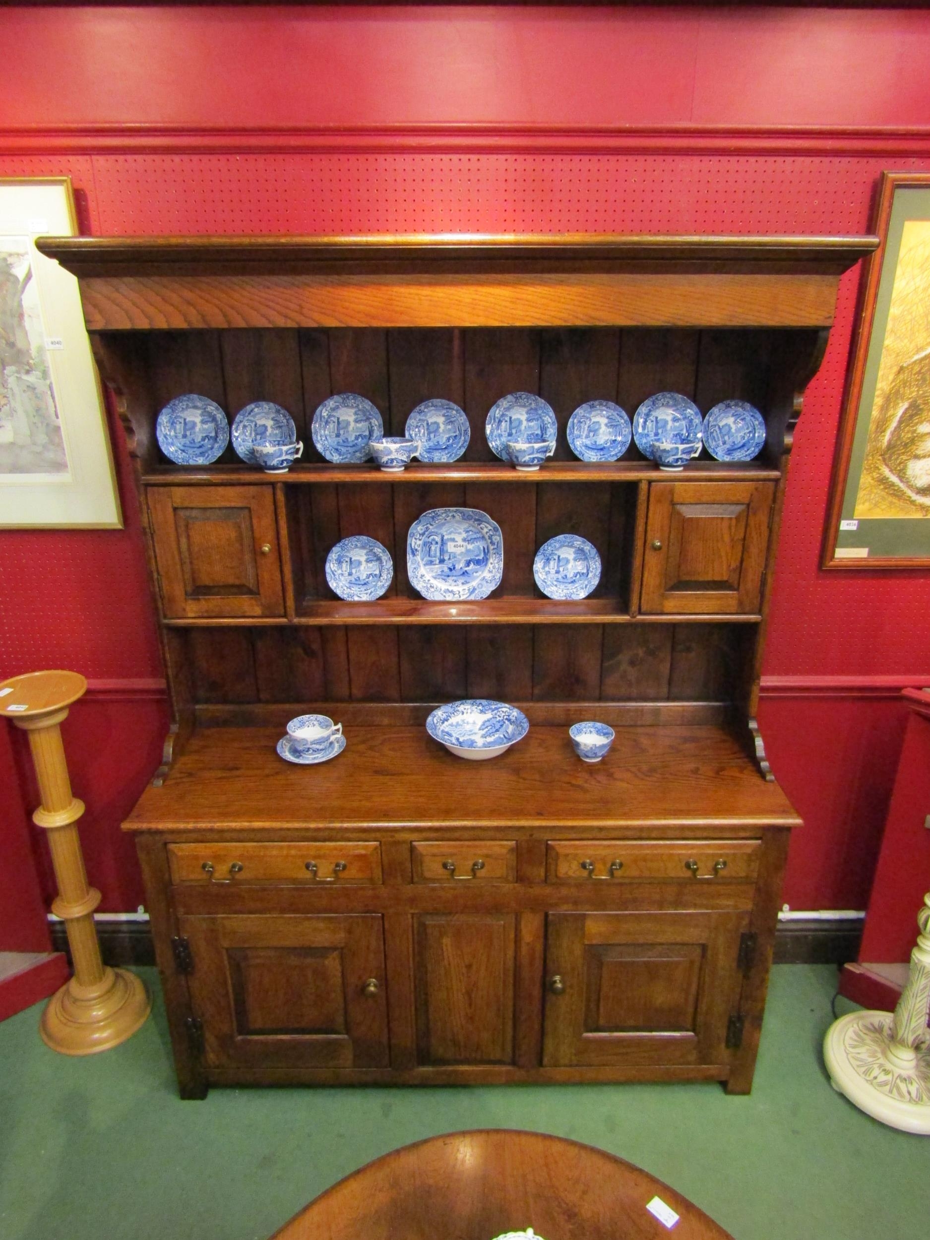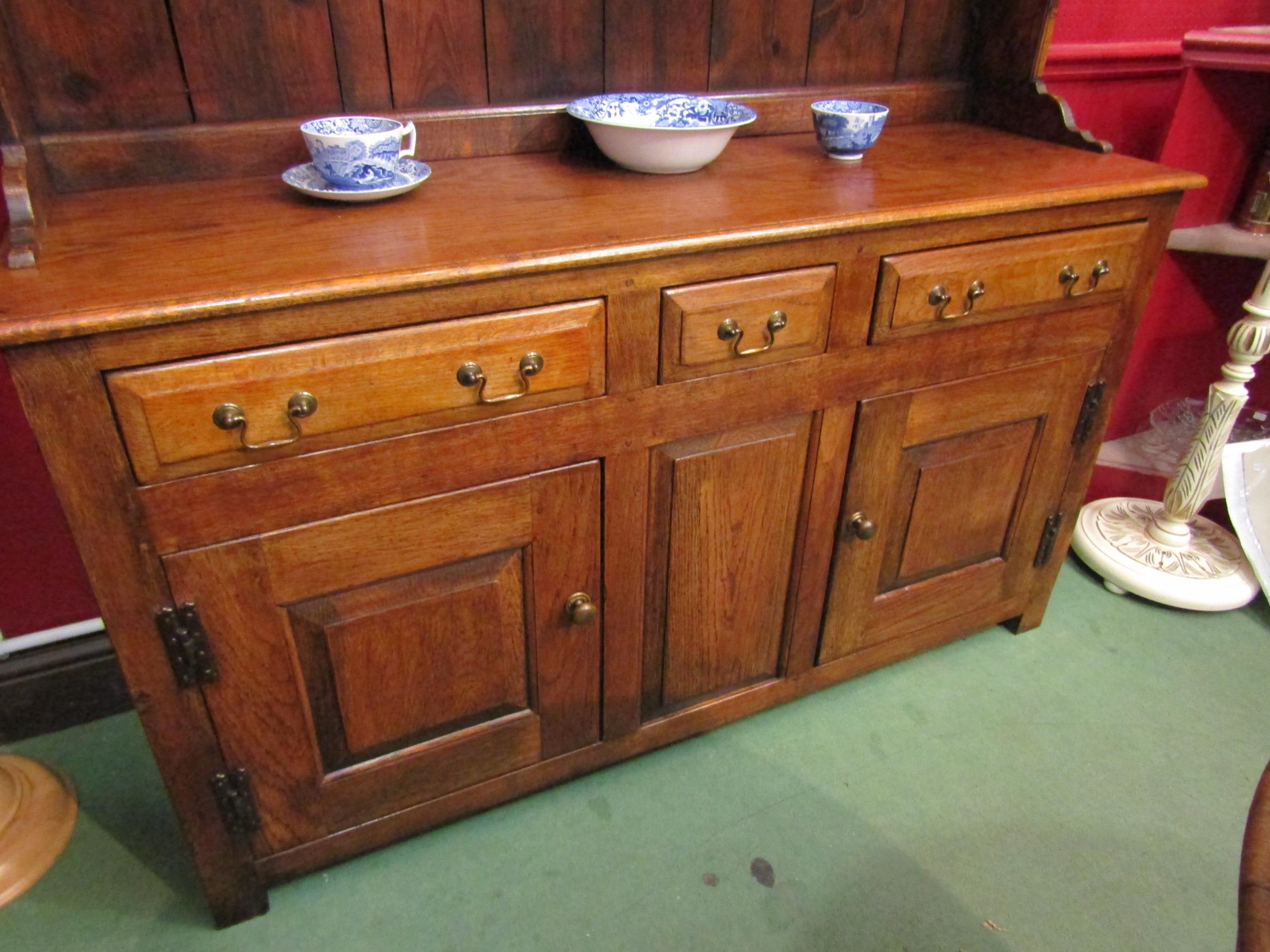 A George III style oak Welsh dresser with raised shelved back having two small cupboards over a three drawer/two door cupboard base on stile feet, 193cm tall x 143cm wide x 45cm deep