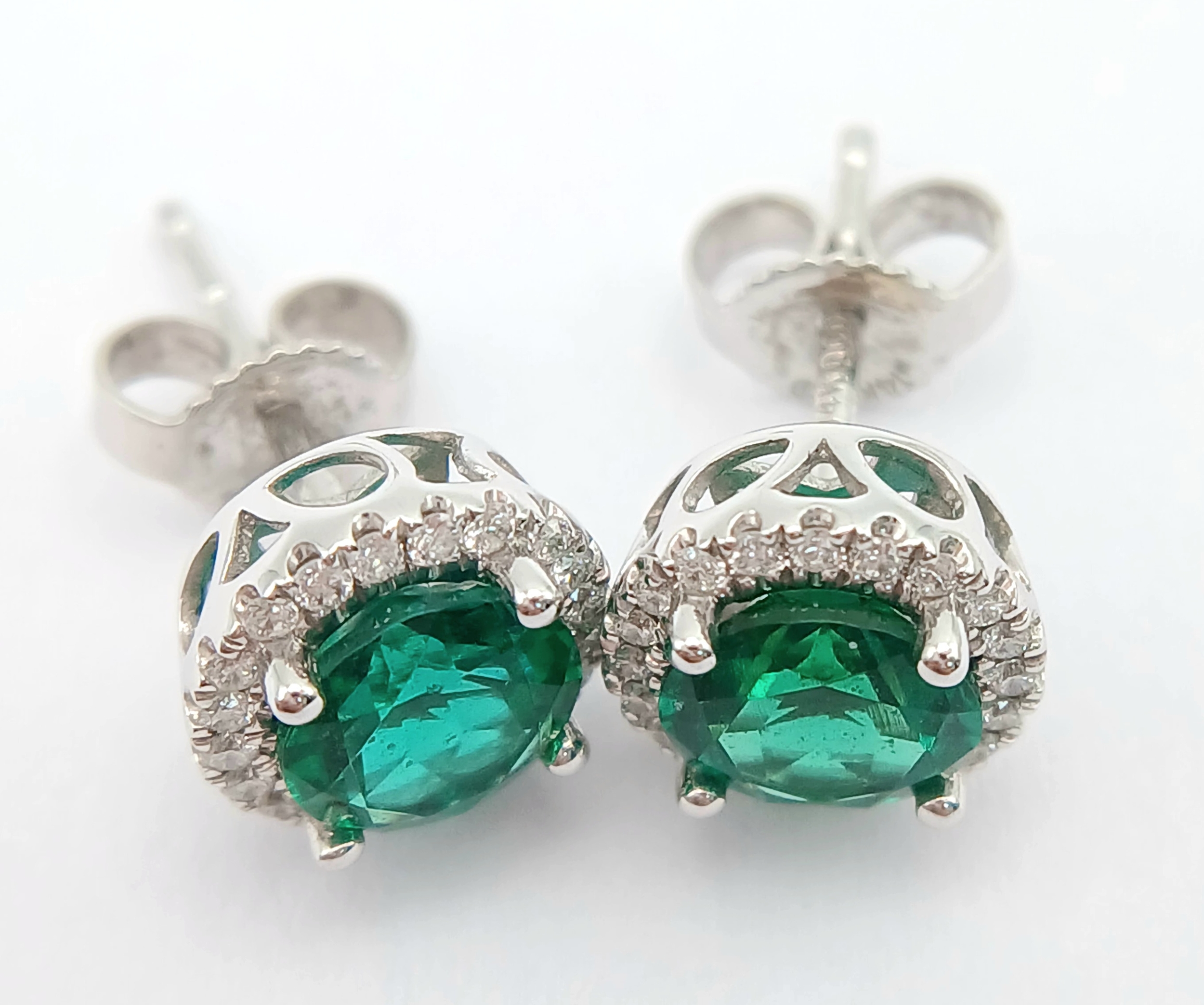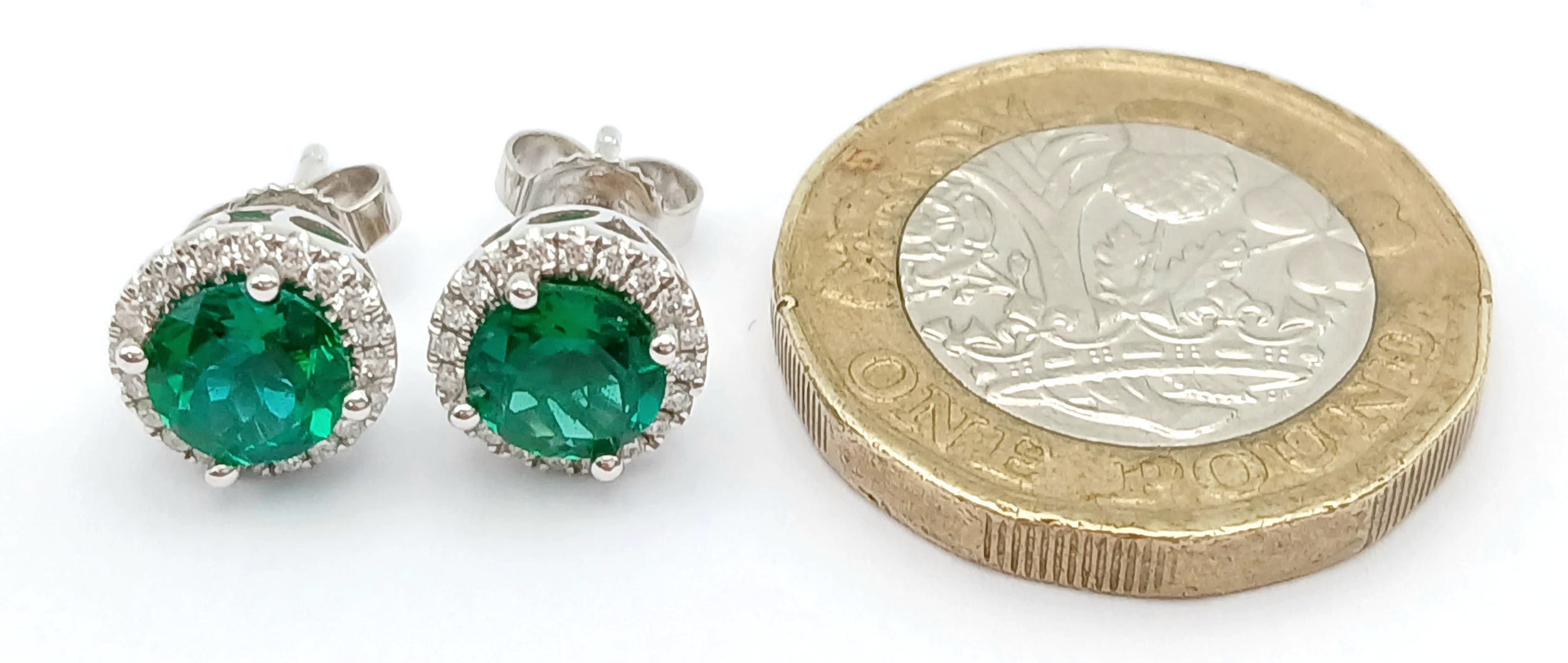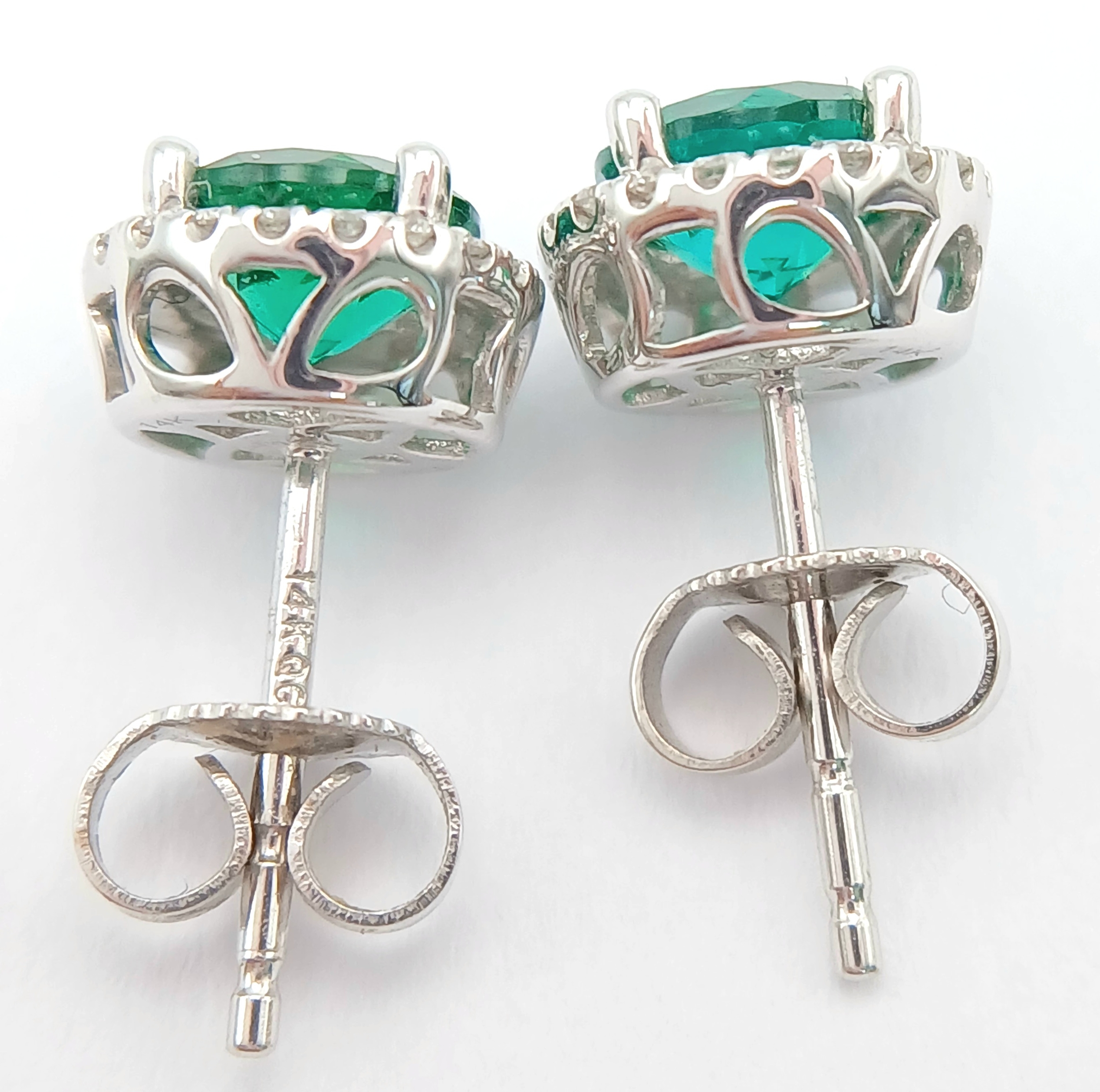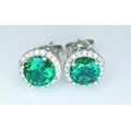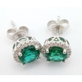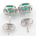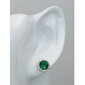 A pair of 14K White Gold, Diamond And Synthetic Emerald Set, Halo Stud Earrings. 2.2G. Tan 6009