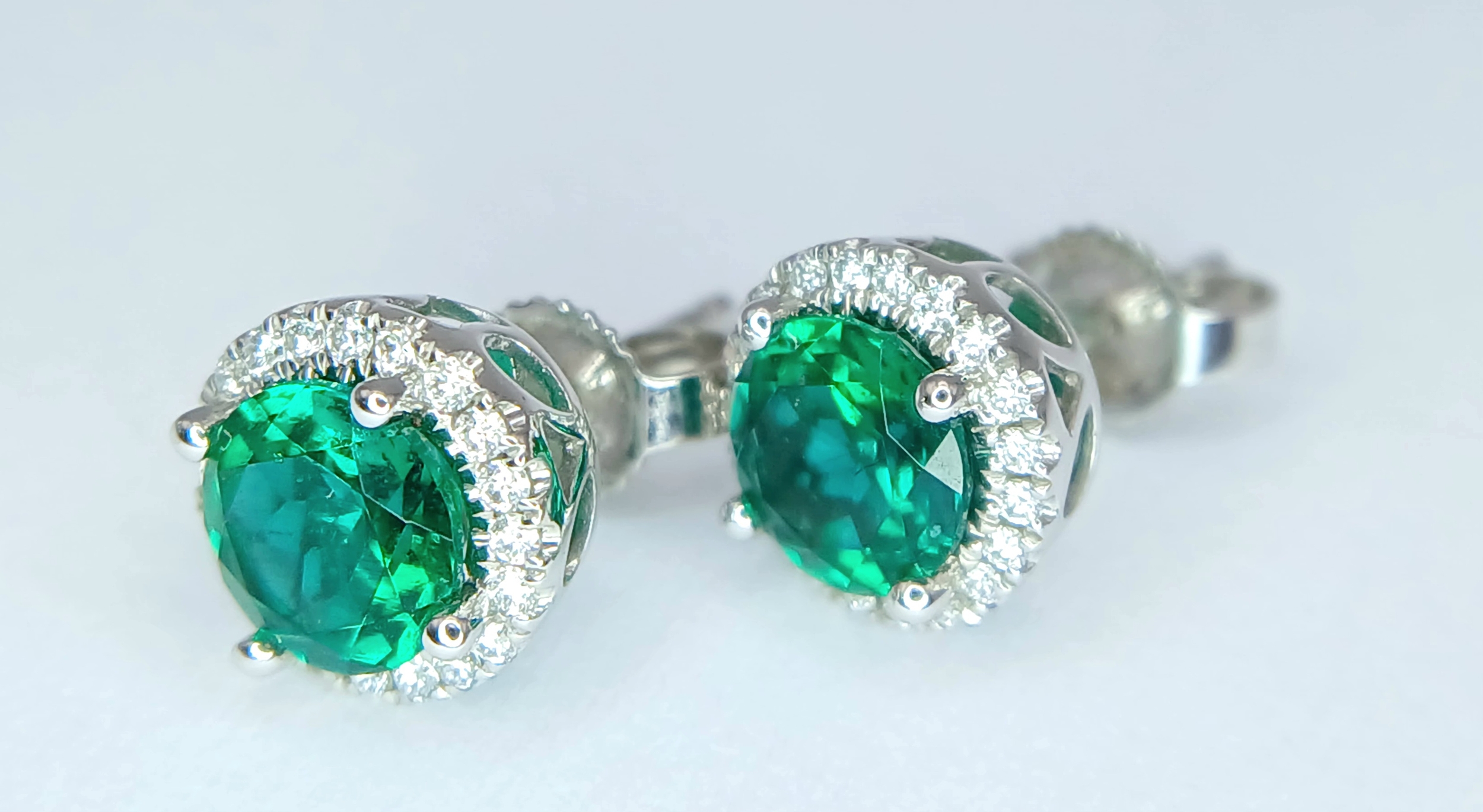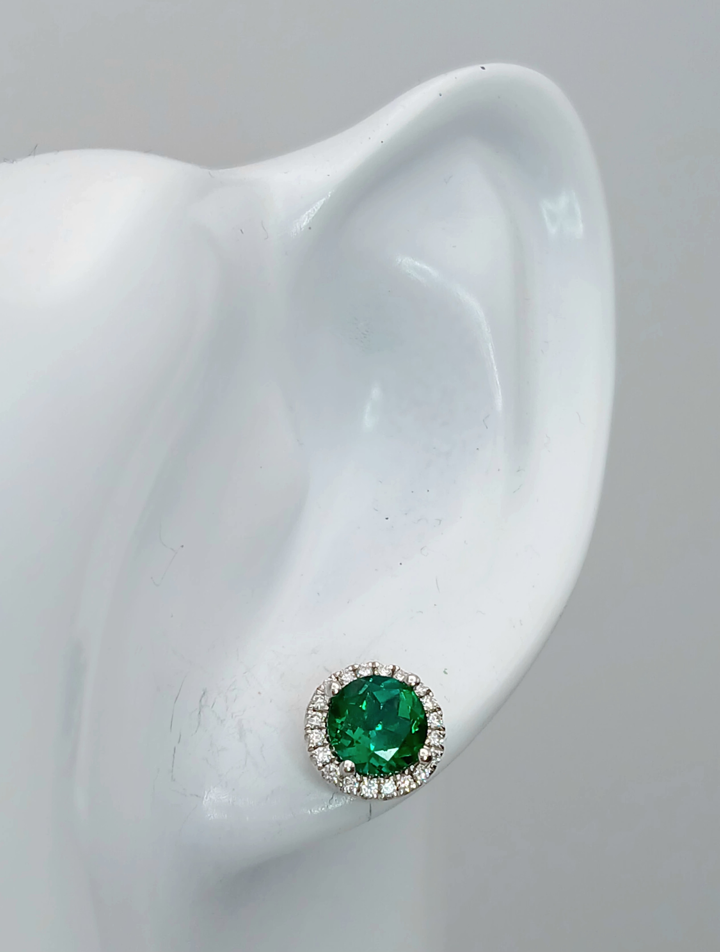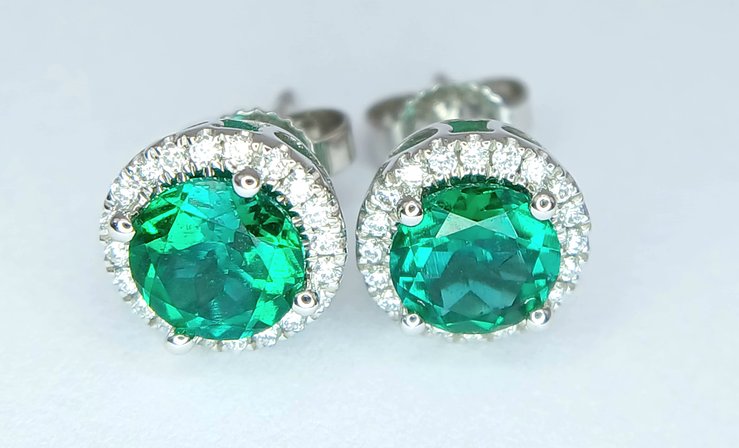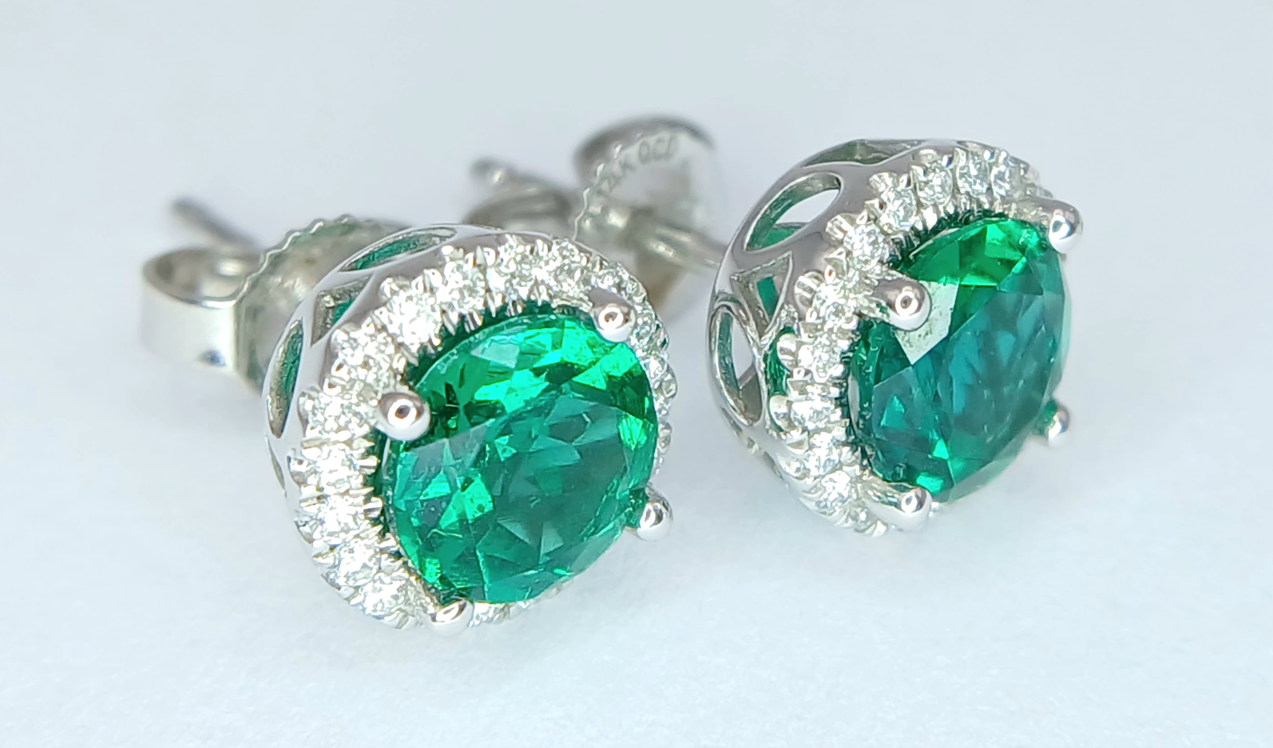 A pair of 14K White Gold, Diamond And Synthetic Emerald Set, Halo Stud Earrings. 2.2G. Tan 6009