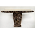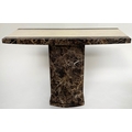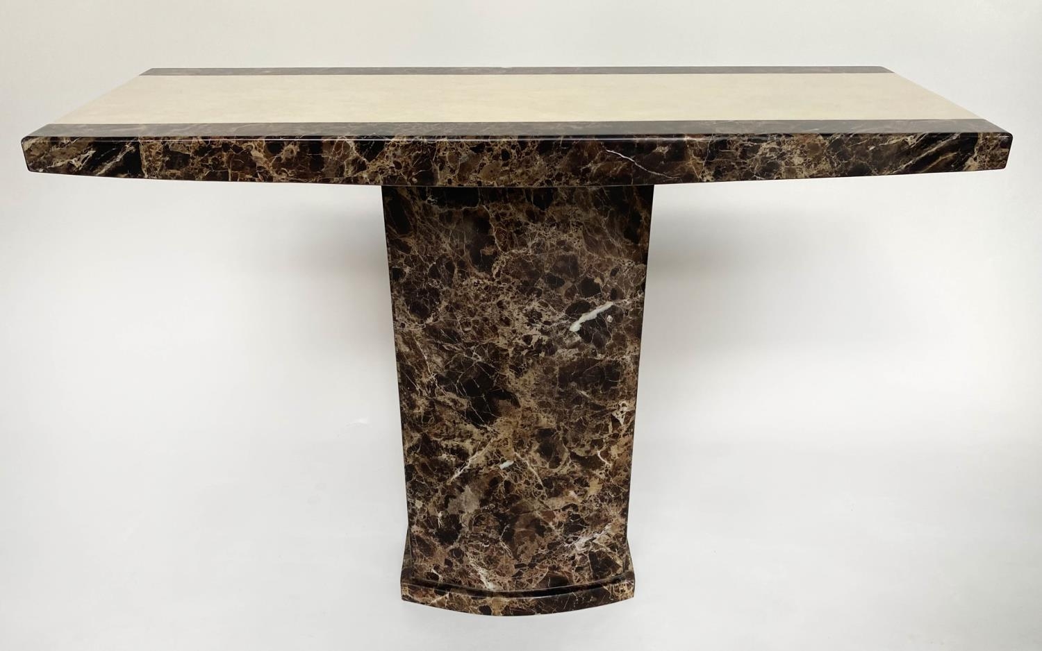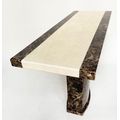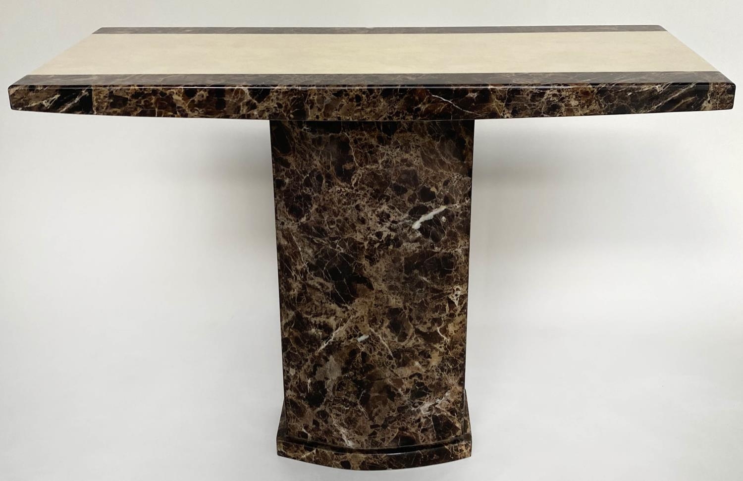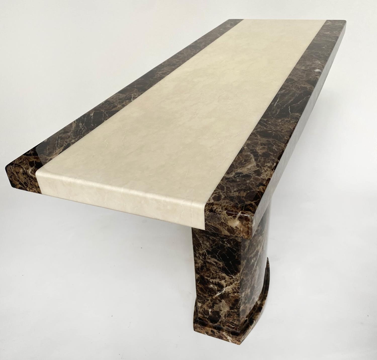 CONSOLE TABLE, 1970s, two tone marble, cream and variegated brown, on plinth support, 110cm x 40cm x 80cm H.