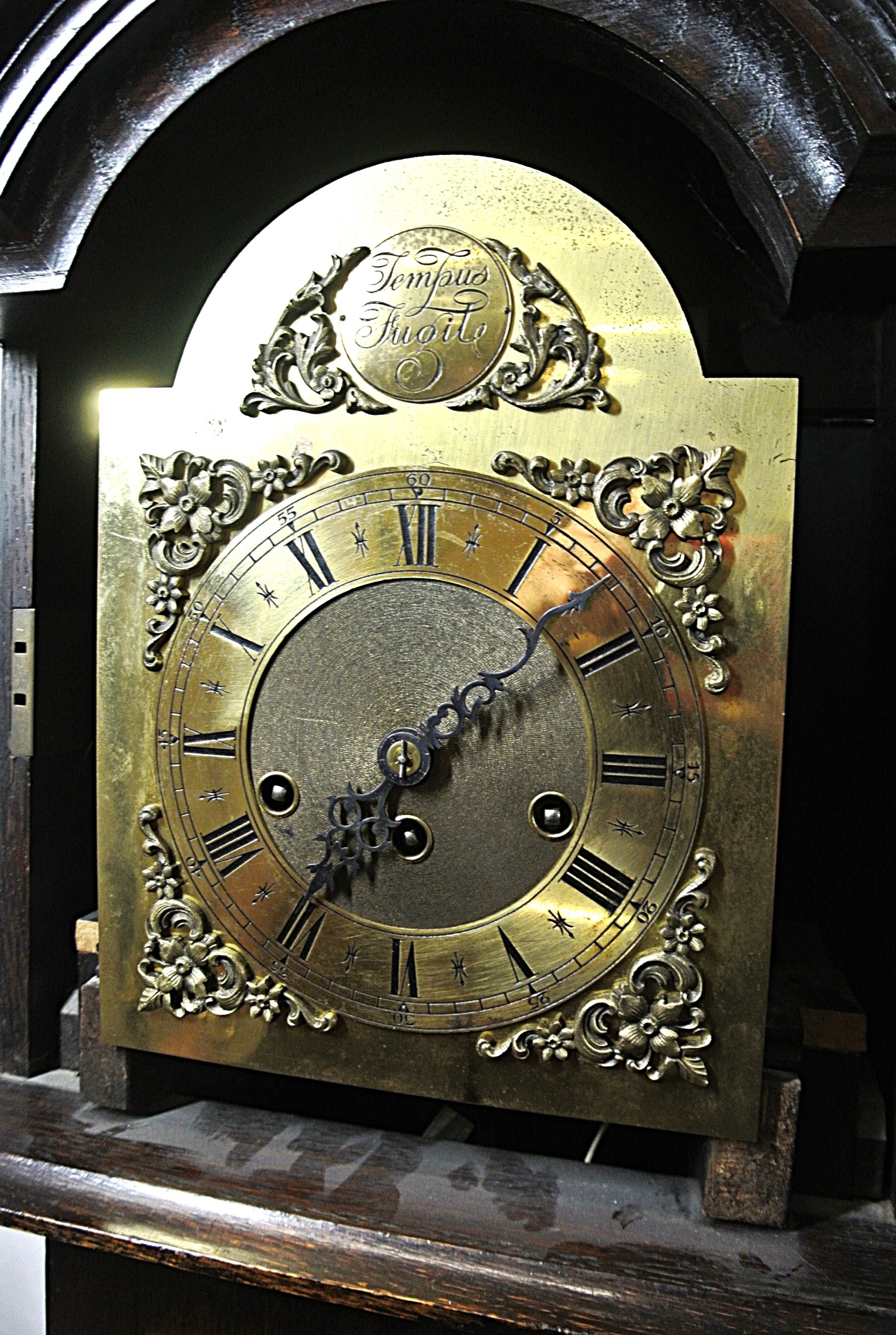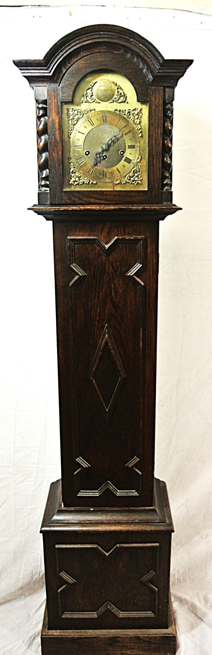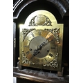 Edwardian style oak cased grandmother clock with domed top, brass framed dial with ormolu mounts, on plinth