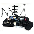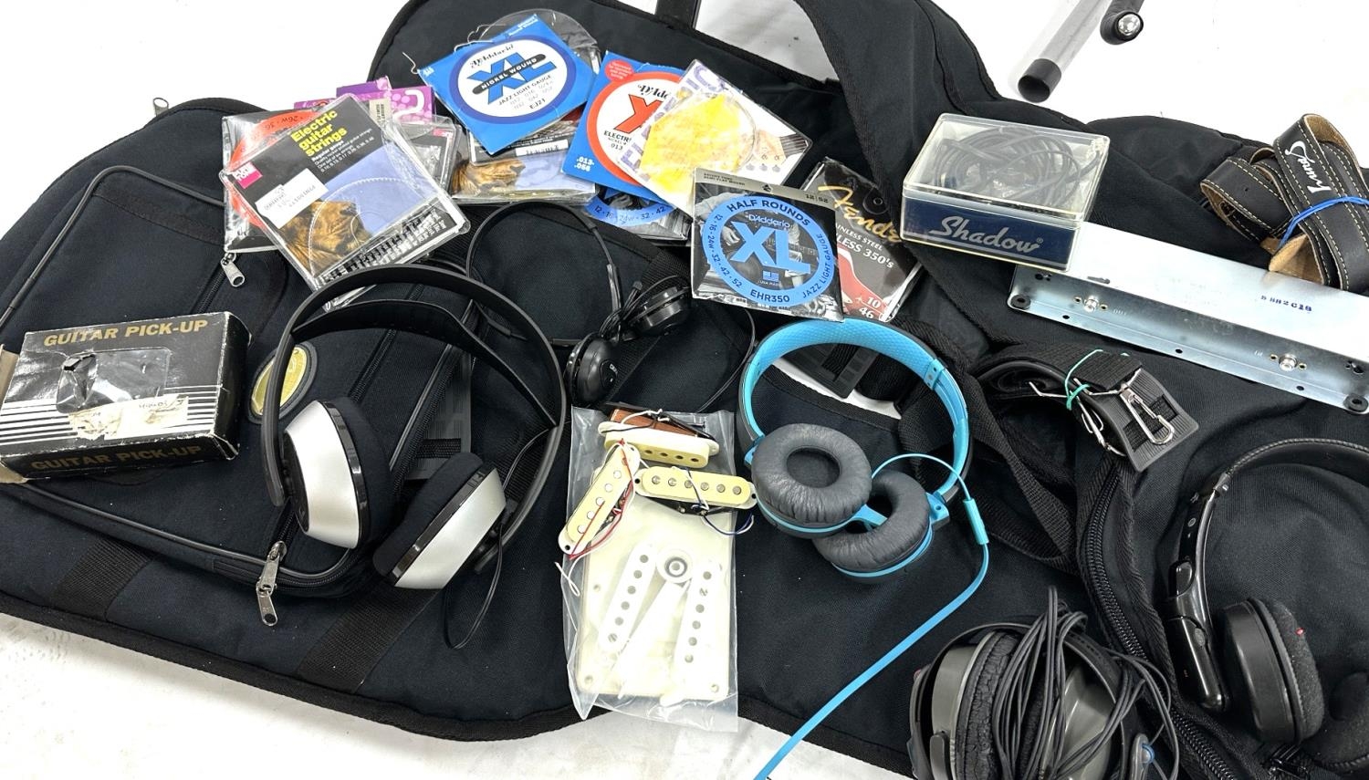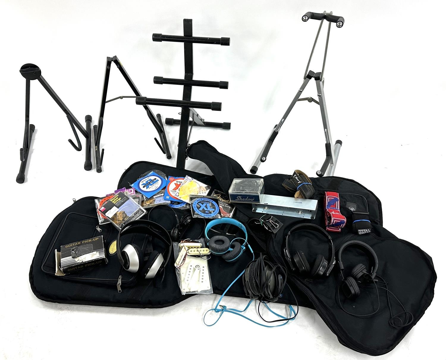 Selection of guitar and other spares to include a set of three single coil ceramic pickups, a selection of strings, Strat plastics, an acoustic guitar pickup, an Accutronics spring reverb, guitar straps, headphones, three guitar stands, an amplifier stand and three gig bags