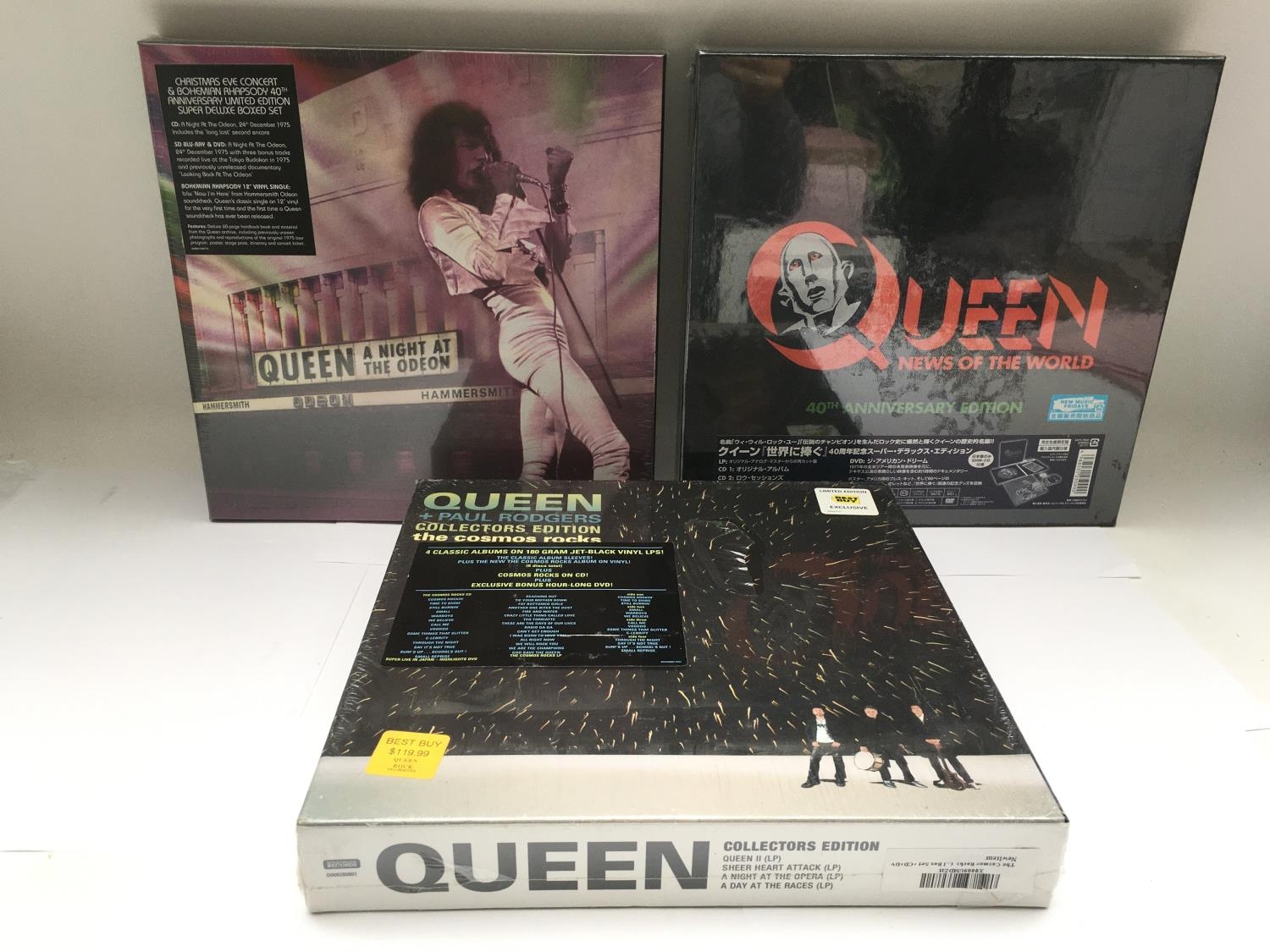 Three mint and sealed Queen multi LP/CD/BluRay/DVD box sets comprising a 40th Anniversary 'News Of The World', 'A Night At The Odeon' and 'The Cosmos Rocks'.