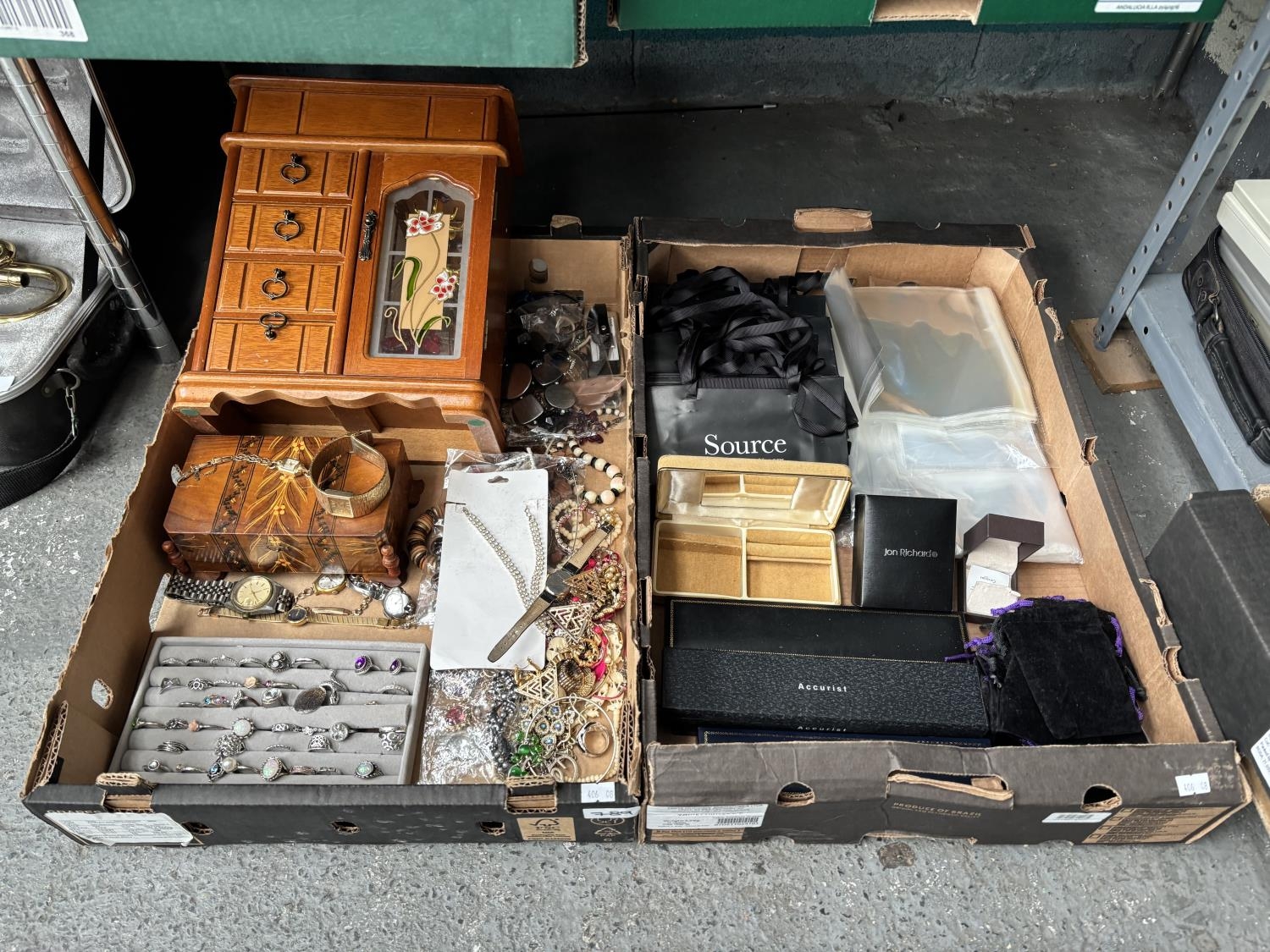 2 Boxes containing costume jewellery, vintage watches and jewellery boxes