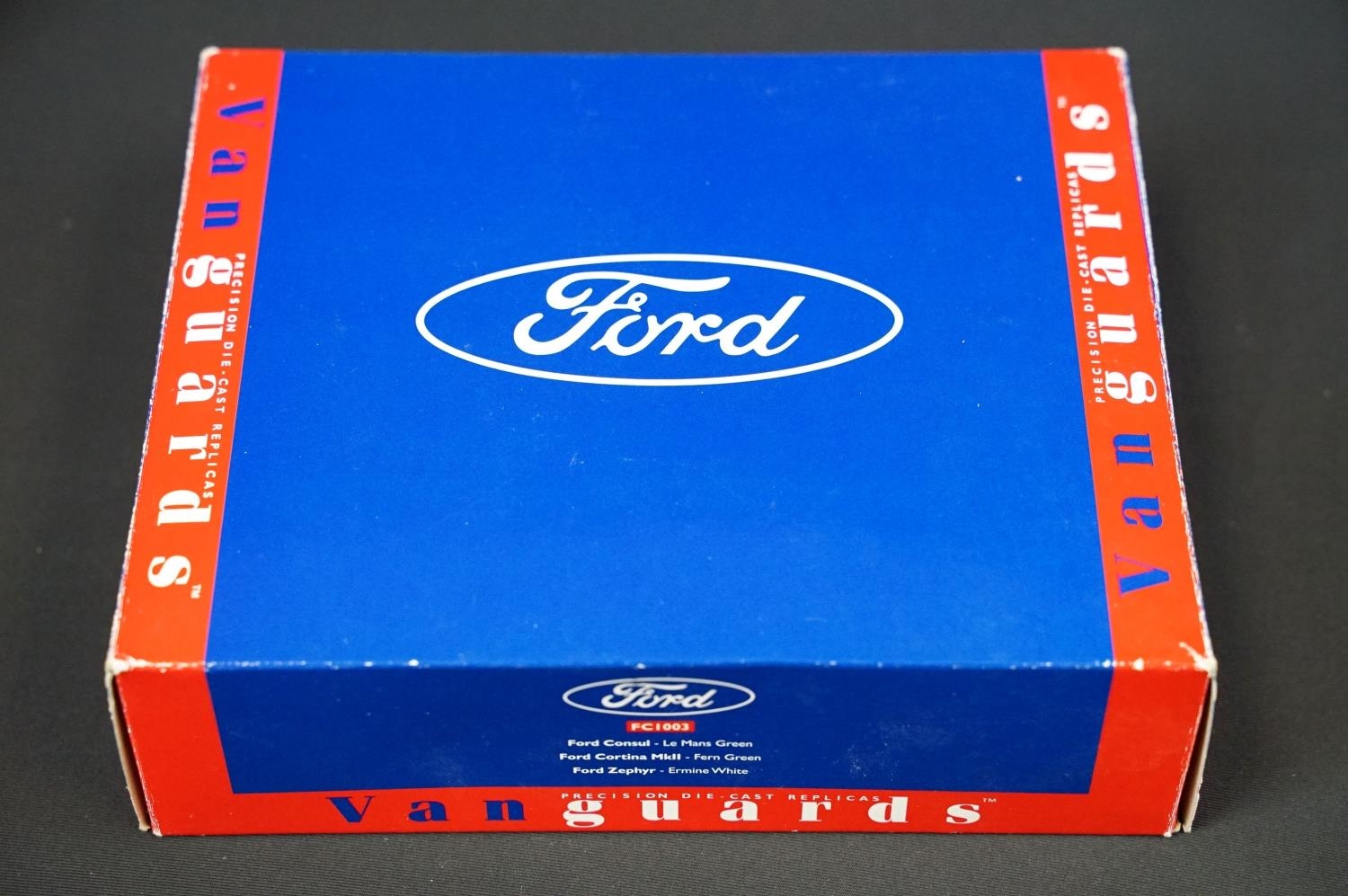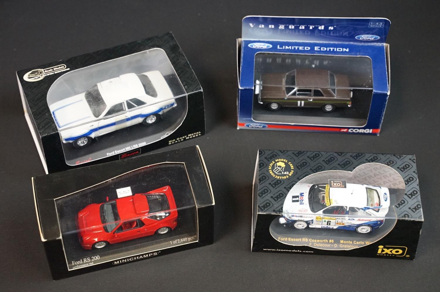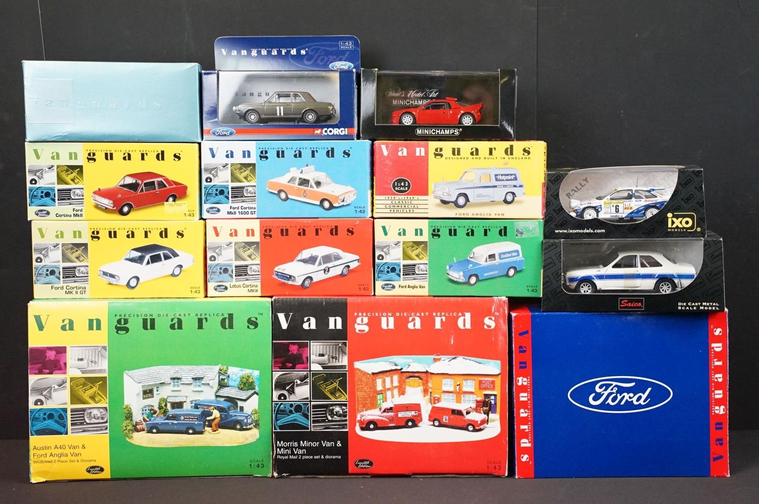 14 Boxed diecast models featuring 11 x boxed Vanguards diecast models to include BD1002, GD1002, FC1003, VA04100, VA04106, VA04105, VA04102, VA00414, VA04103, VA4002 and VA04111 and 3 x cased diecast models to include Ixo Models RAC022 Ford Escort RS Cosworth, Paul's Model Art Minichamps 430080201 Ford RS200 and Saico Ford Escort MK I RS2000, all diecast ex, boxes vg