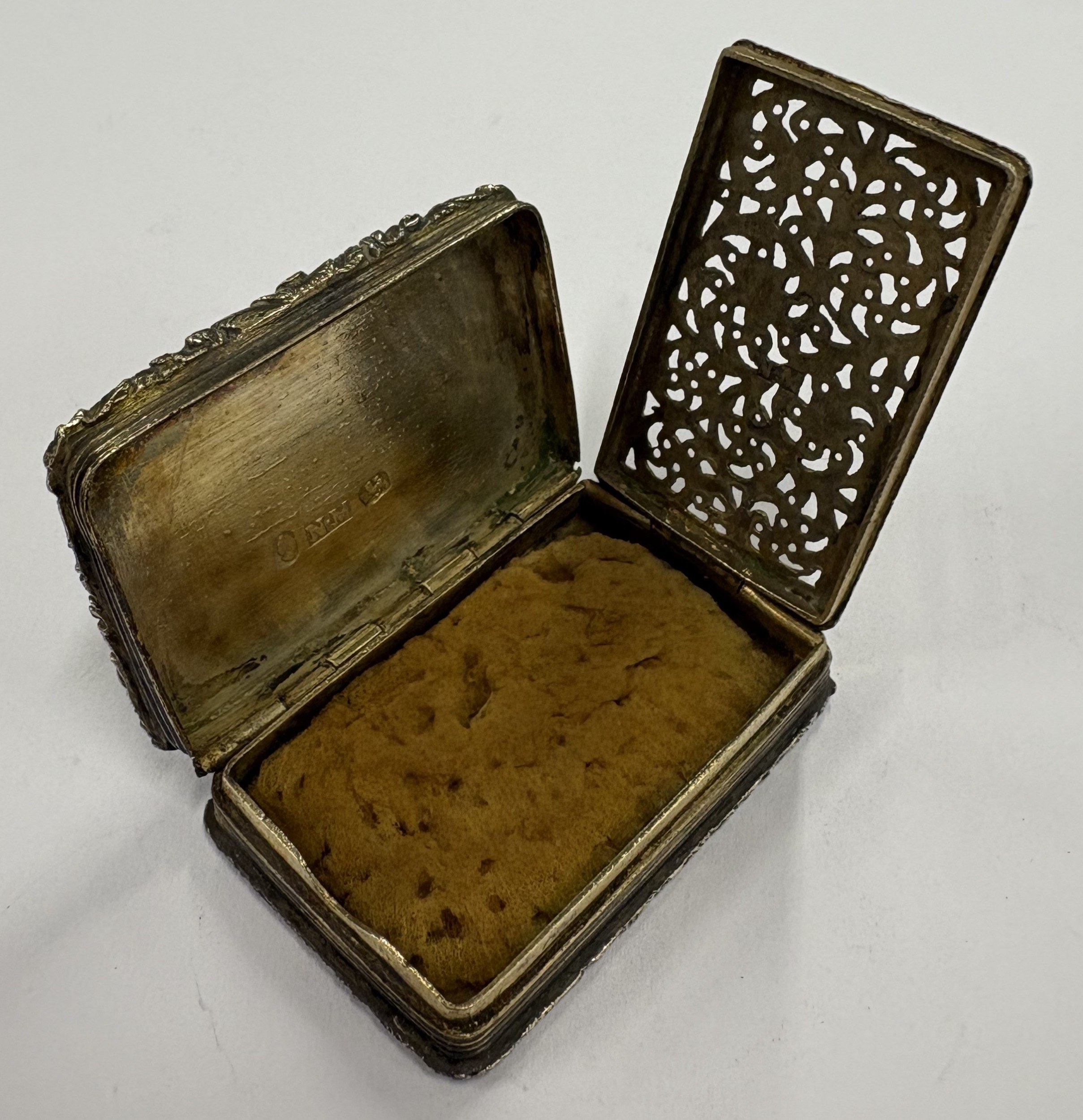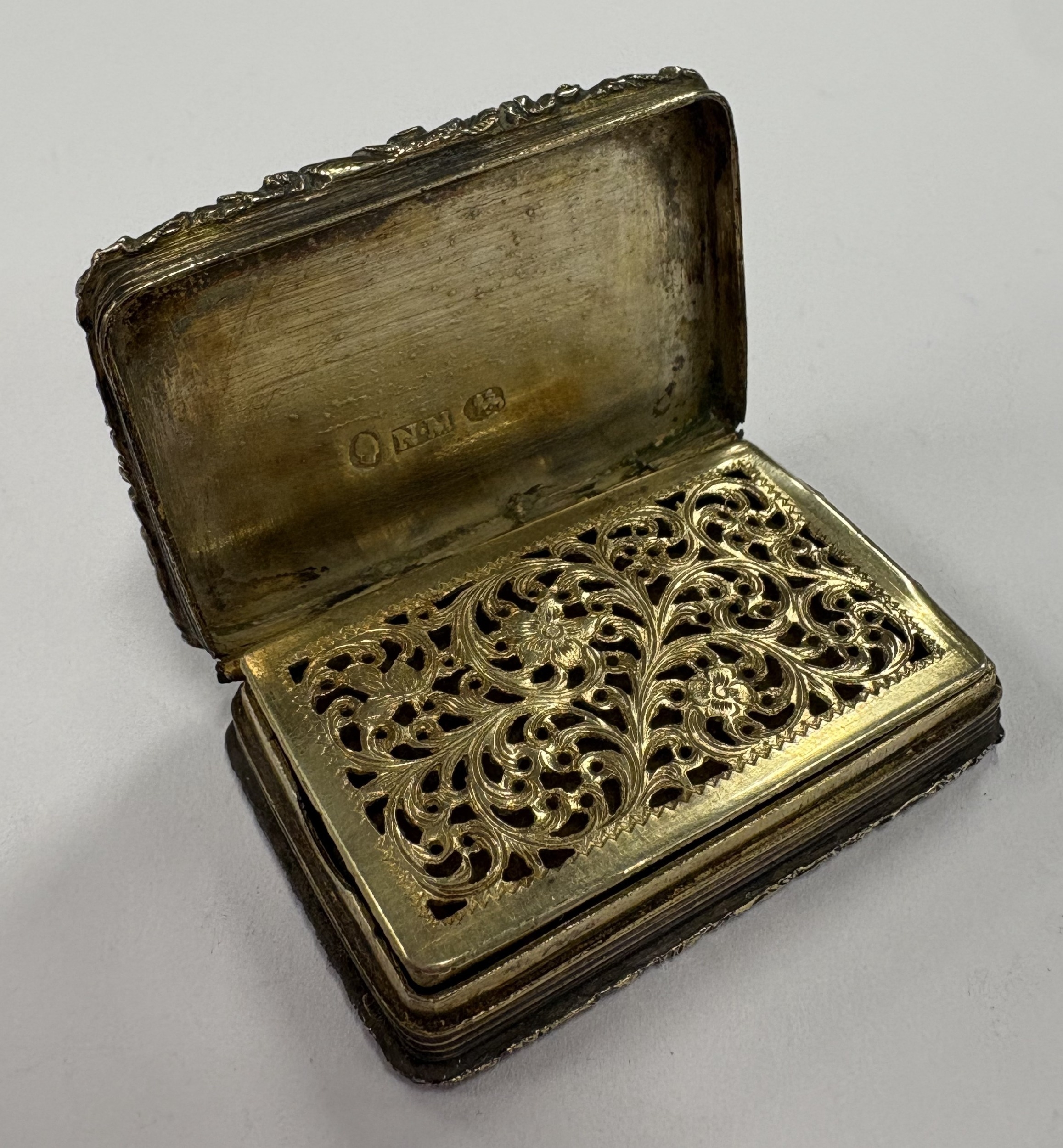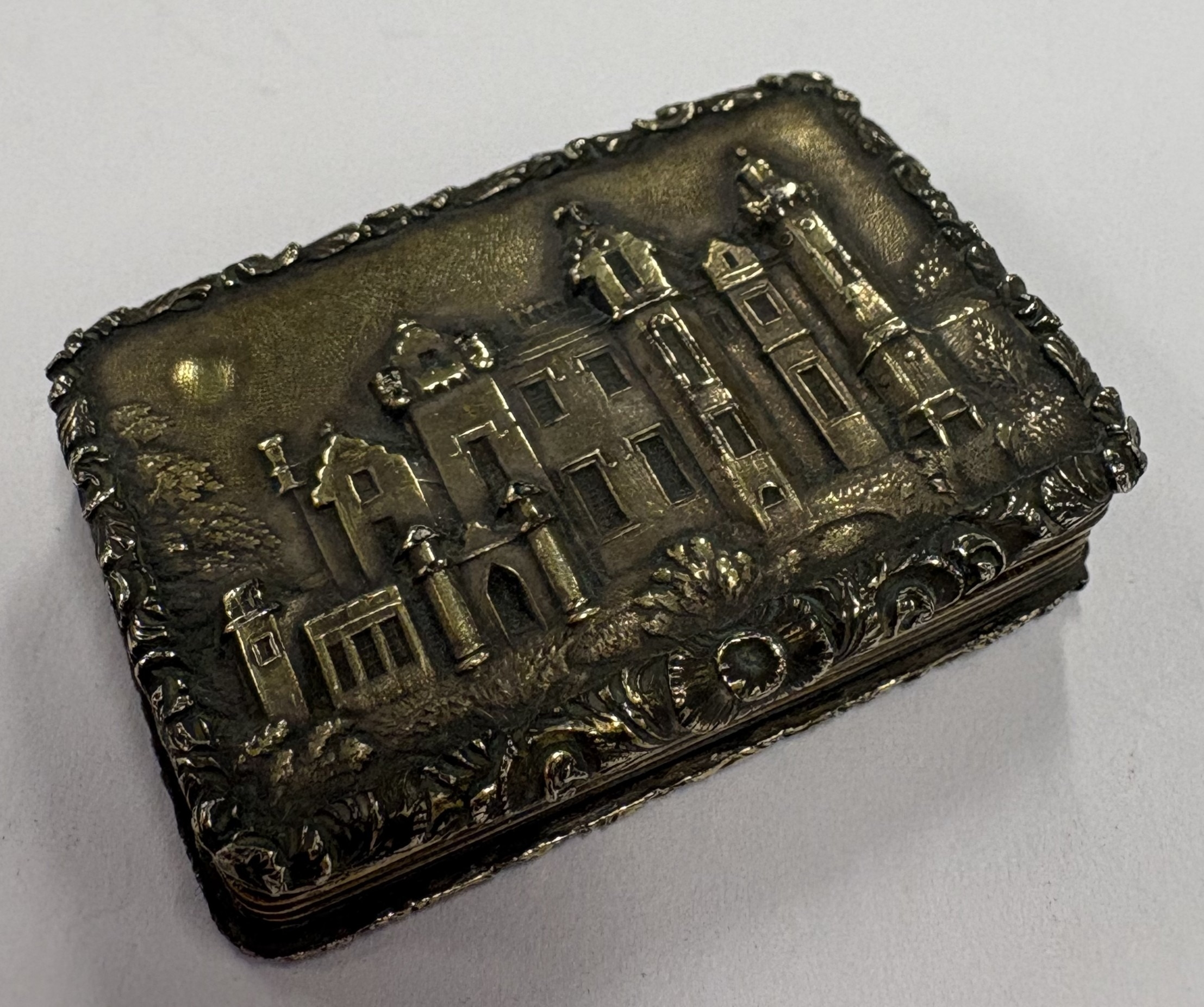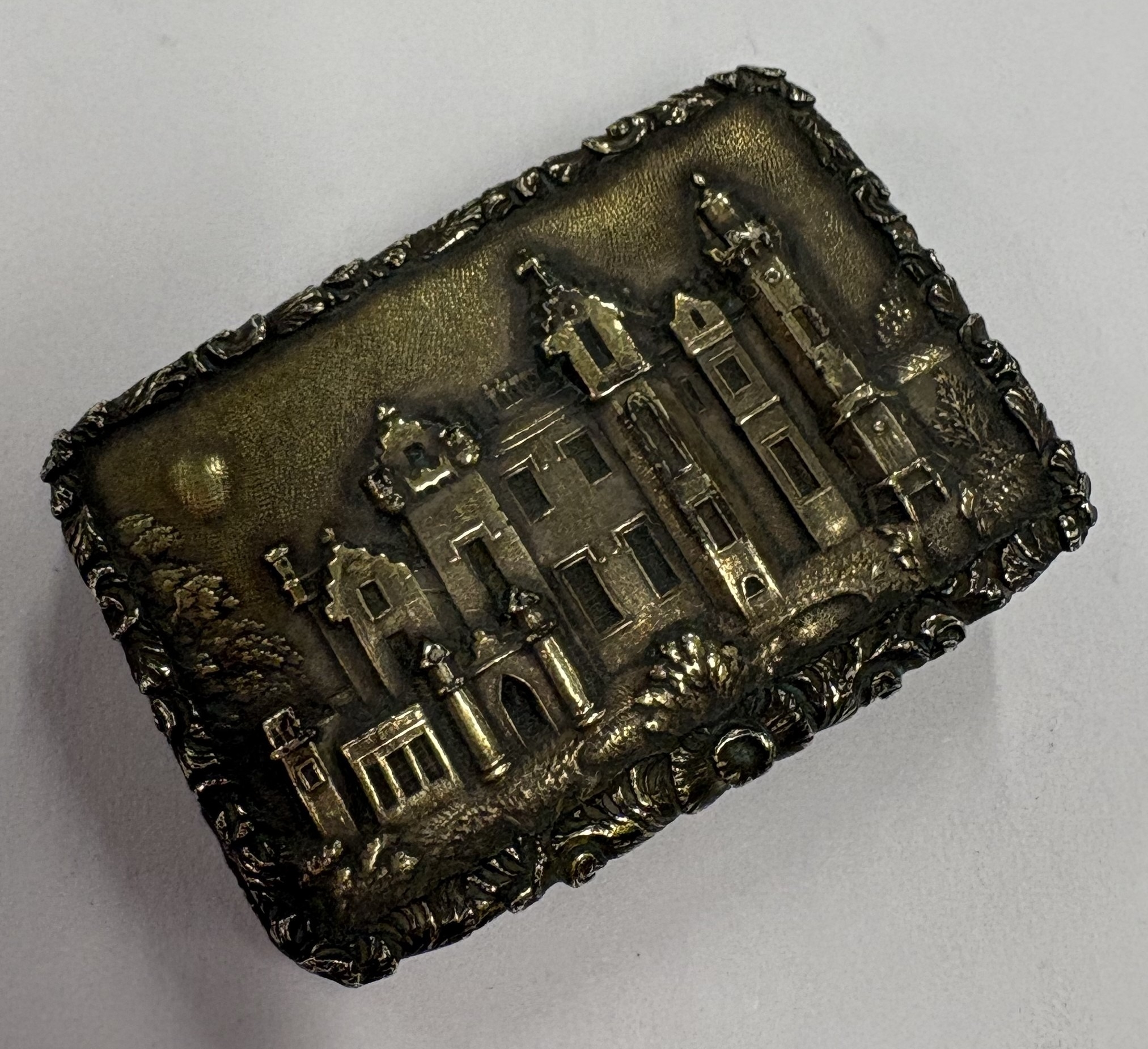 A silver-gilt castle top vinaigrette. Birmingham 1848. By Nathaniel Mills. Approx. 34 grams. Est. £500 - £800.