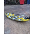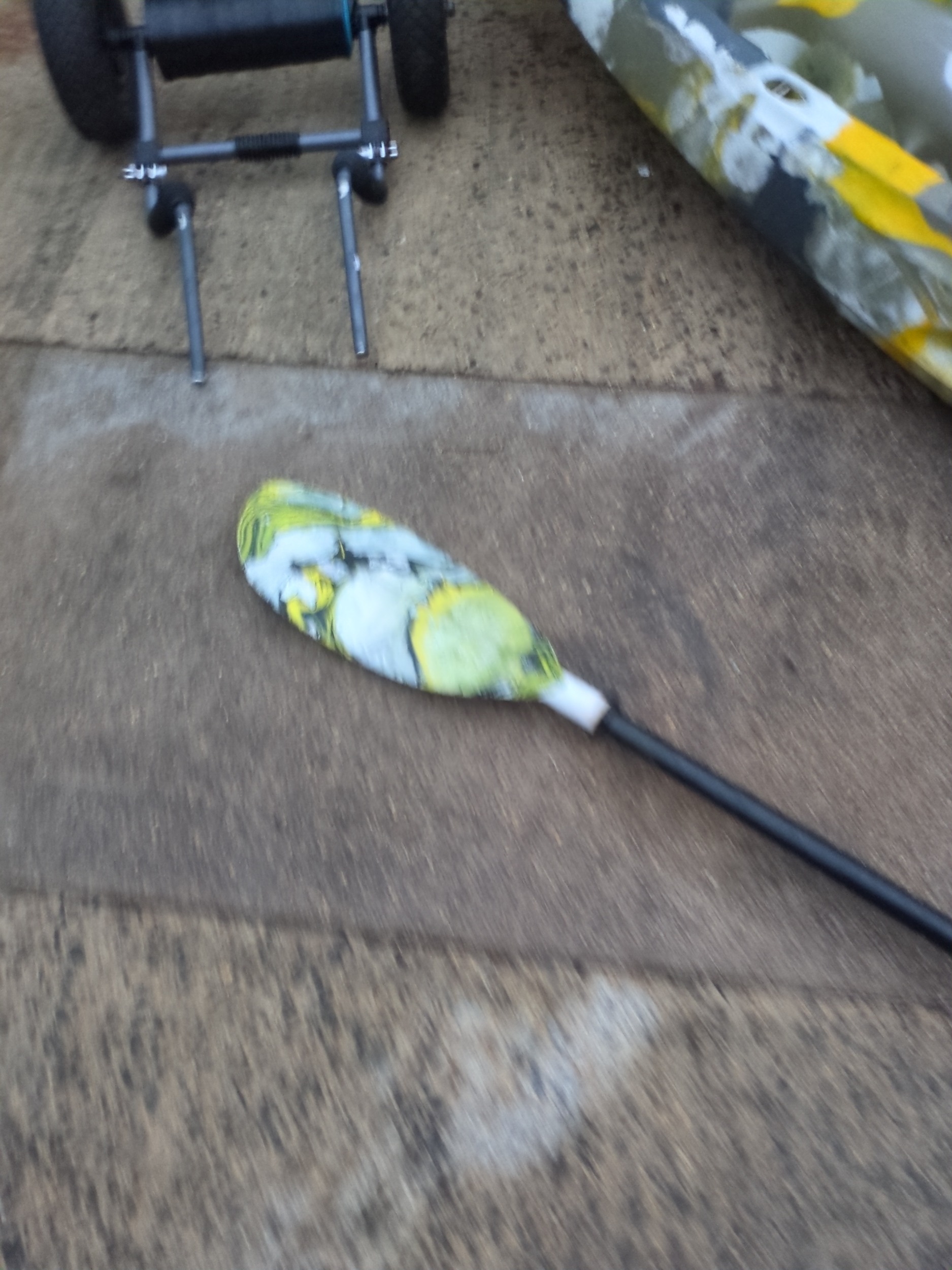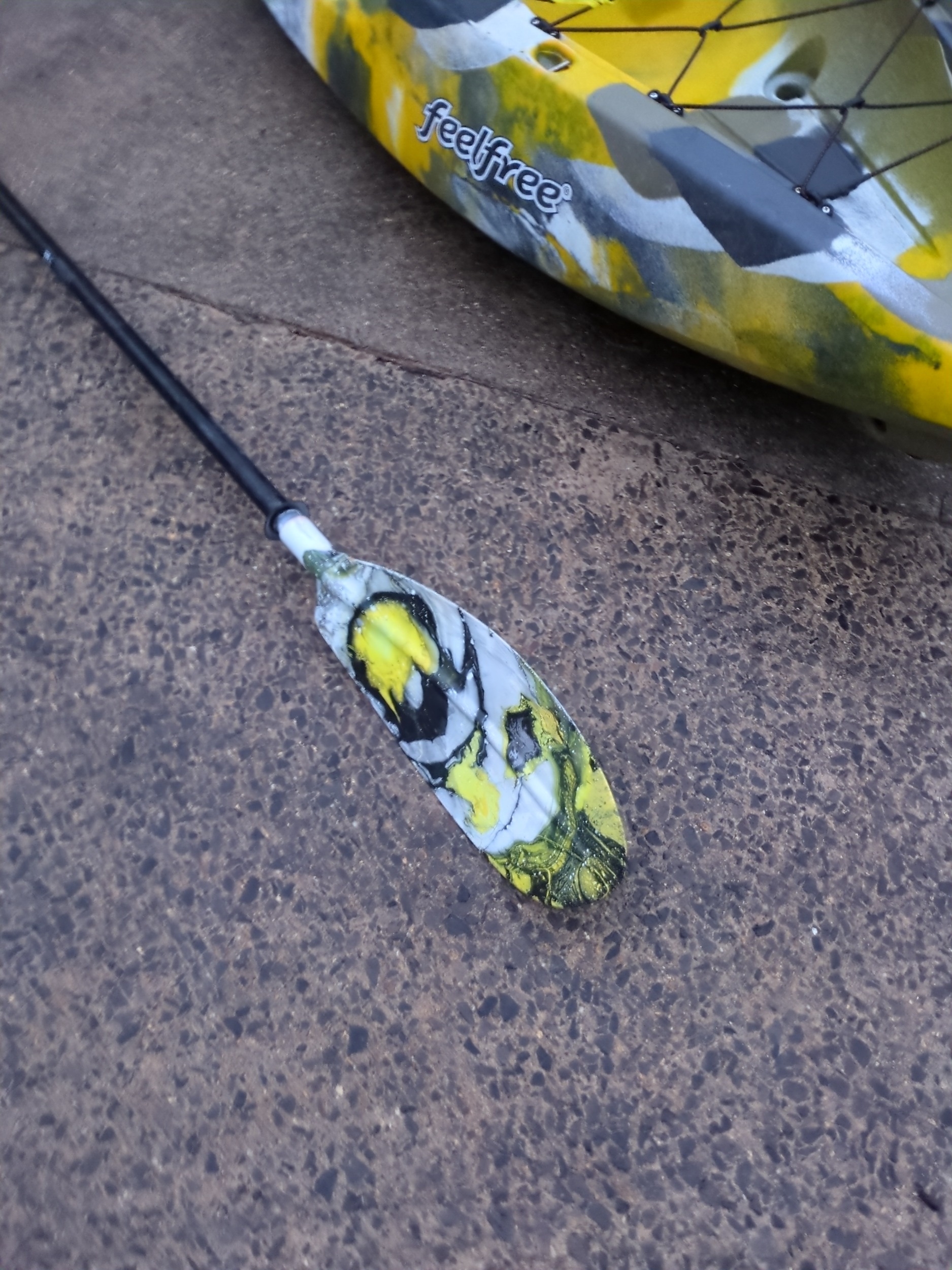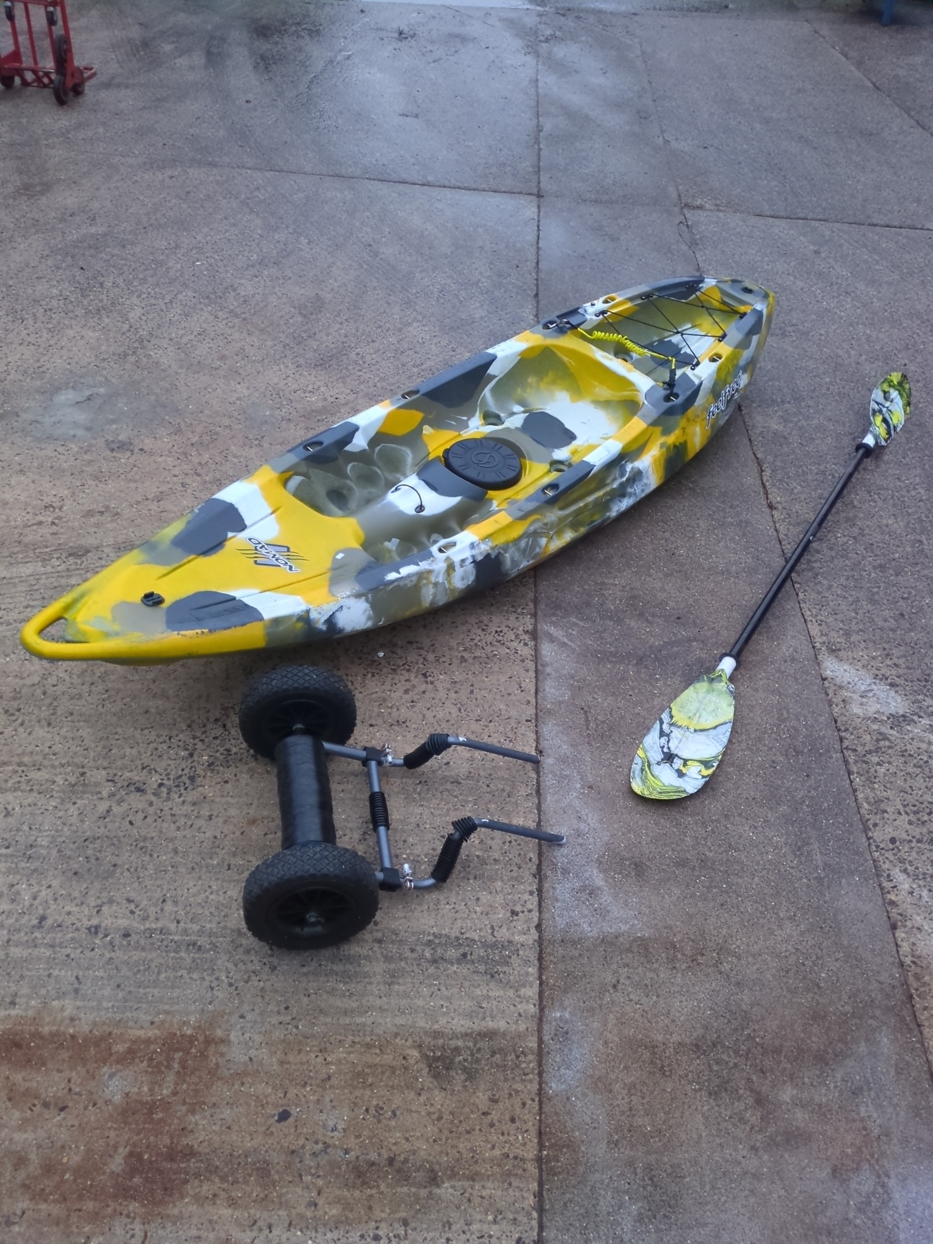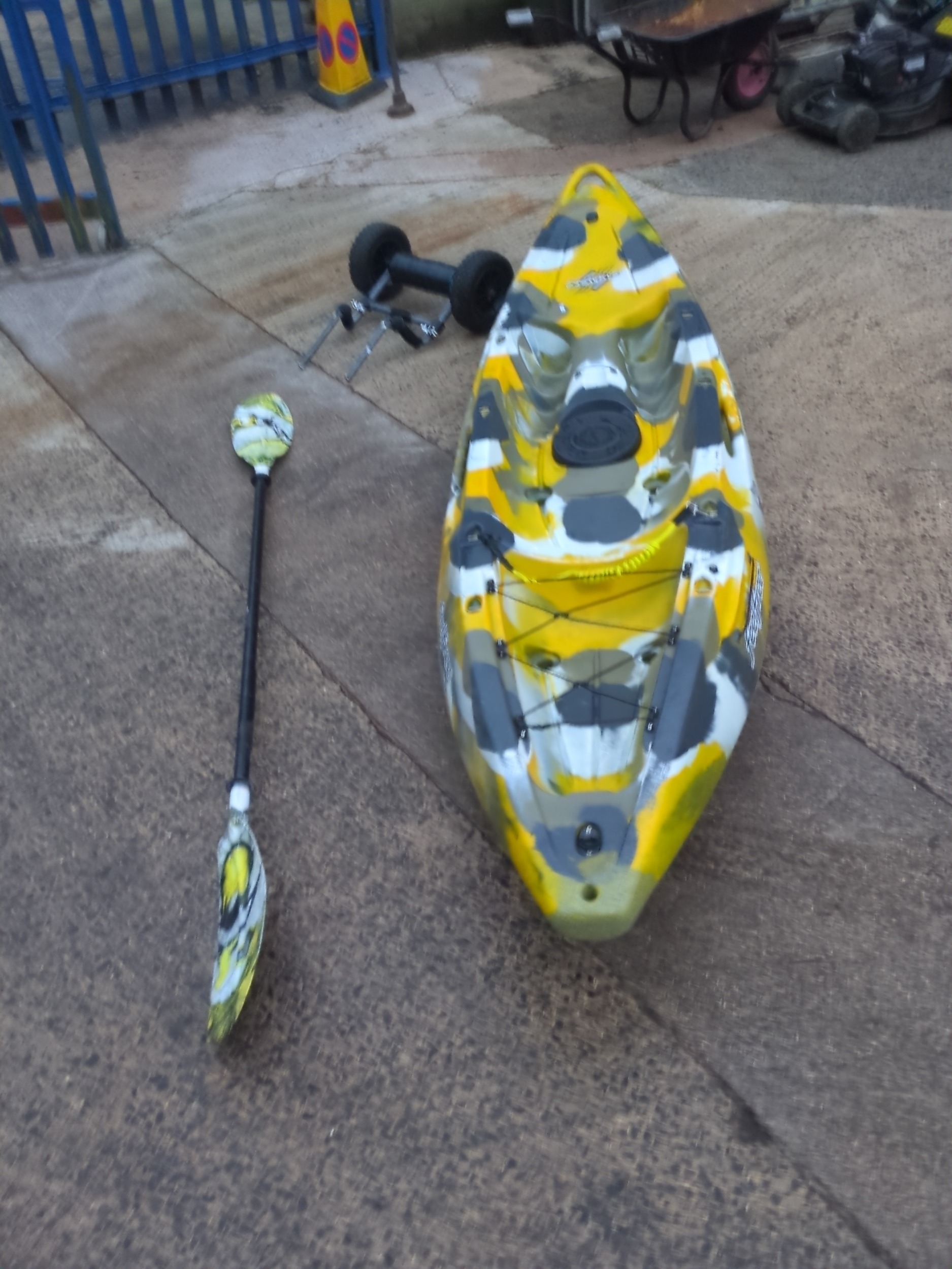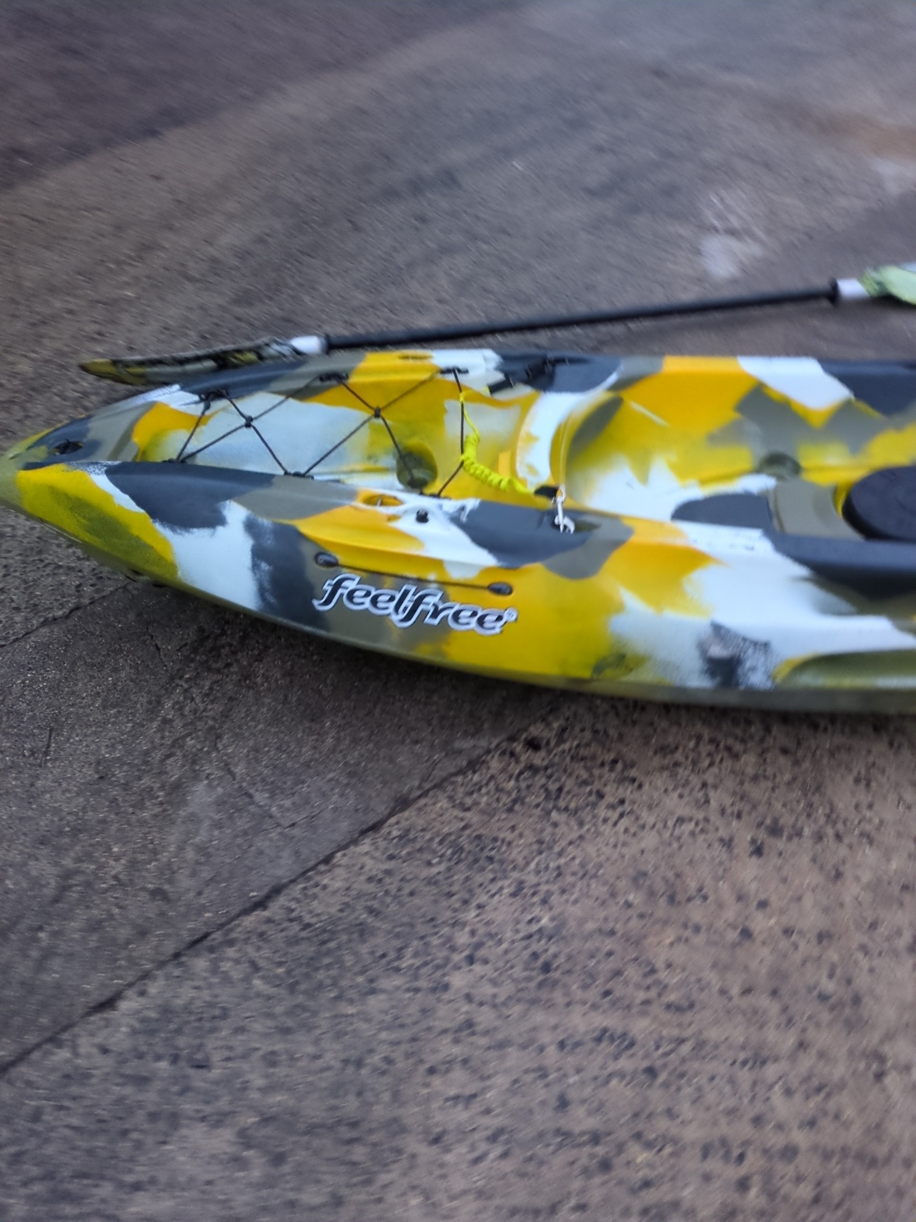 This Feelfree sit-on-top kayak features a vibrant camo design, perfect for outdoor water adventures. The kayak is designed for stability and ease of use, making it suitable for beginners and experienced paddlers alike. Included with the kayak is a matching paddle and a portable trolley for easy transportation. The kayak has a spacious cockpit and integrated storage options for convenience.