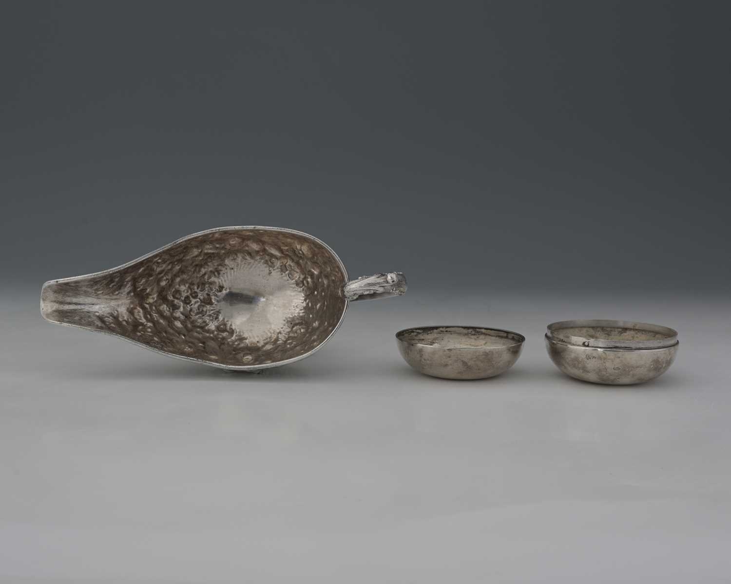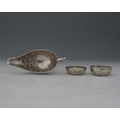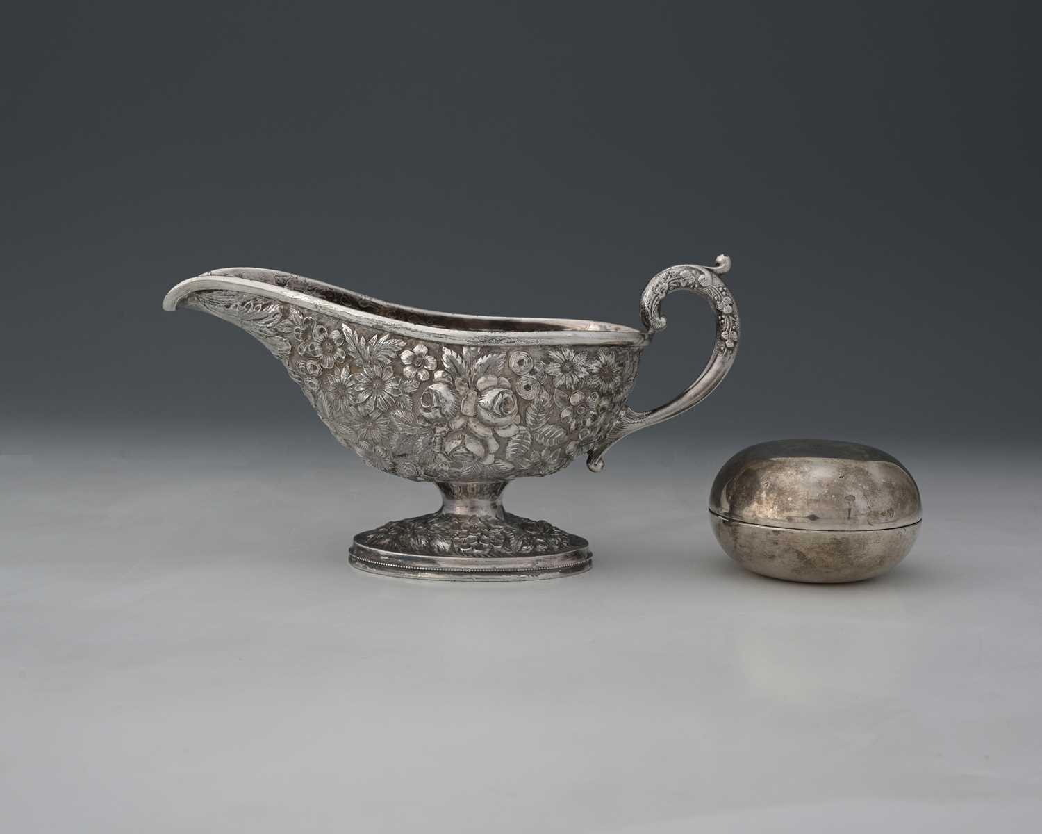 A white metal sauce boat, twentieth-century, the body decorated with flowers and foliage, the underside of the lip initialled in script, 'RLS', apparently unmarked, height 12cm, together with a white metal box and cover, combined weight 541g/17.39ozt approx (2)