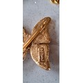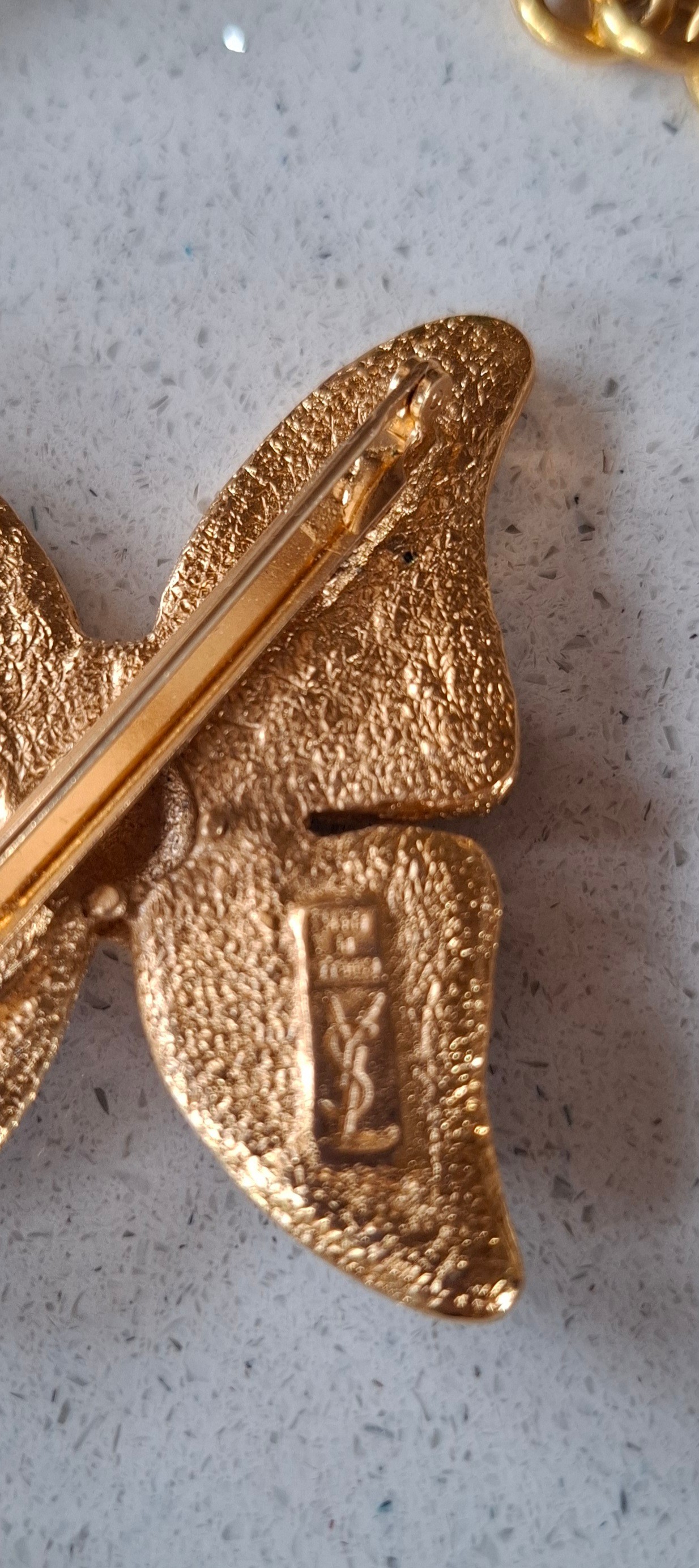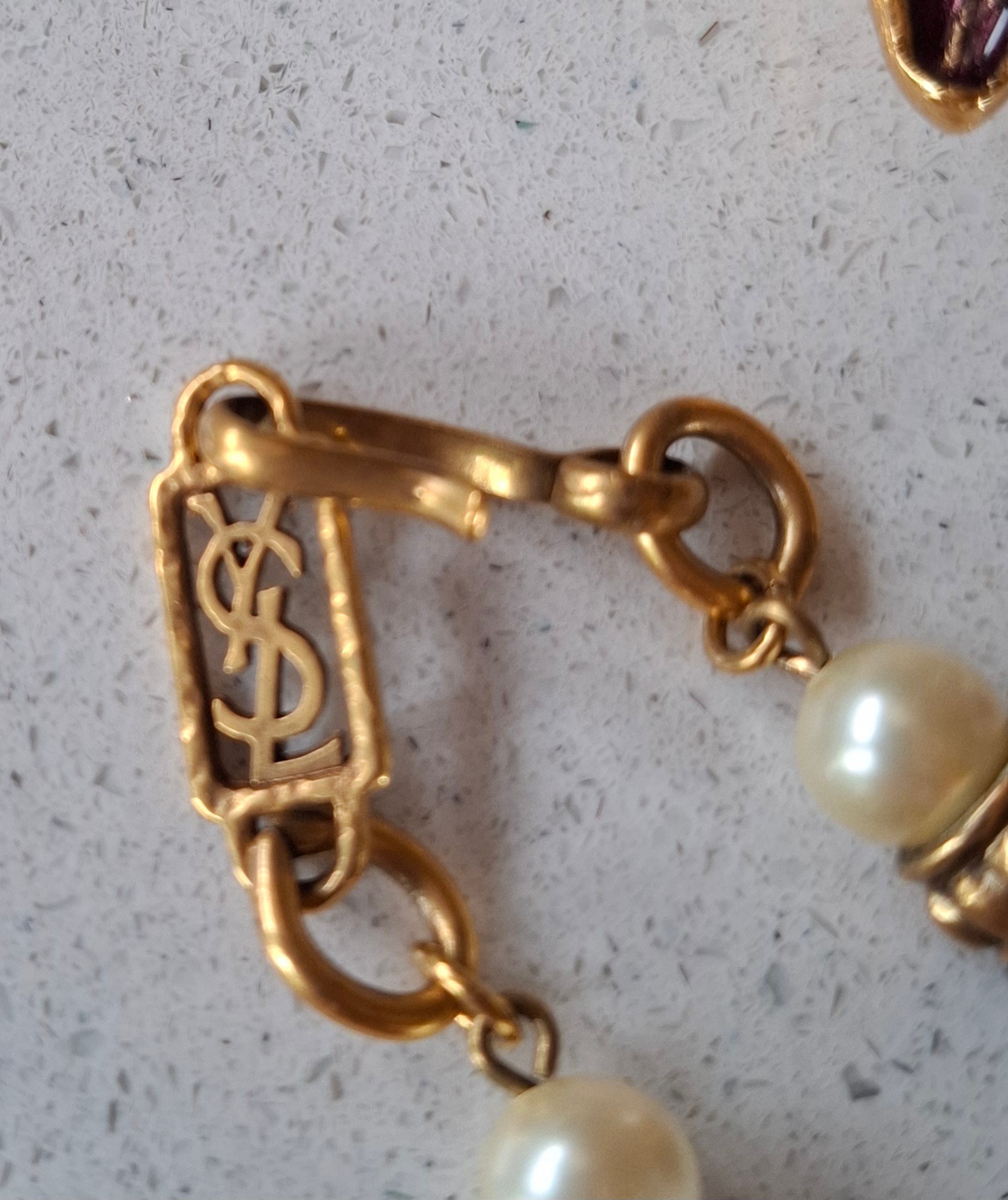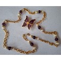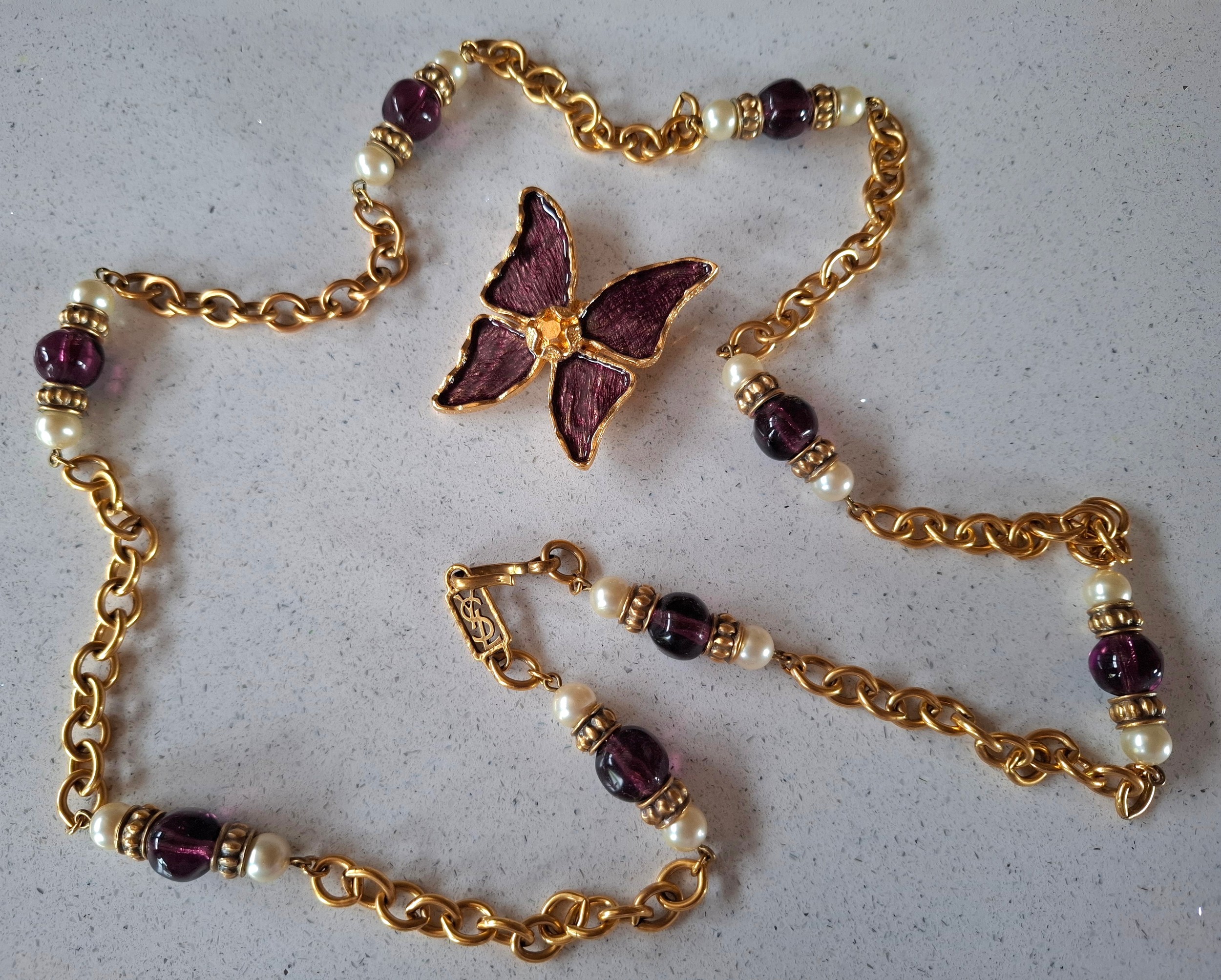 YSL- A late 20th Century gold tone open chain necklace with intermittent faux pearls and aubergine glass beads together with an YSL matched gold tone and enamel butterfly brooch, both stamped with the designers name and Made In France to the reverse. Location: CAB 1