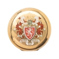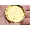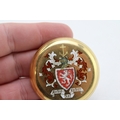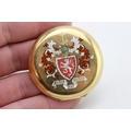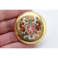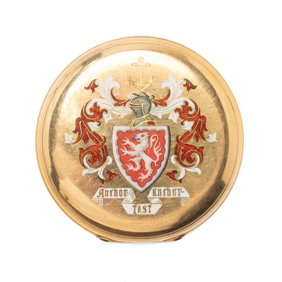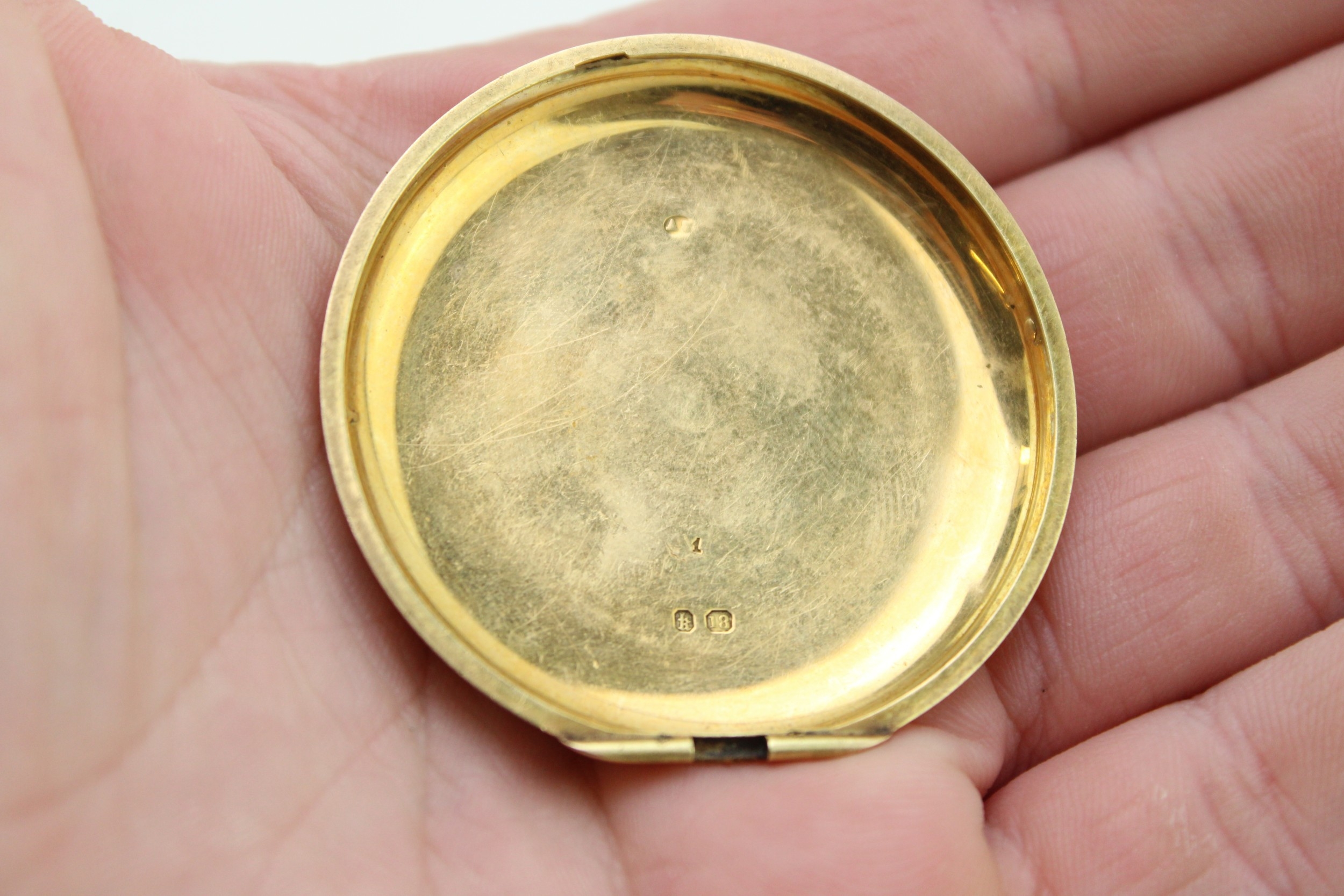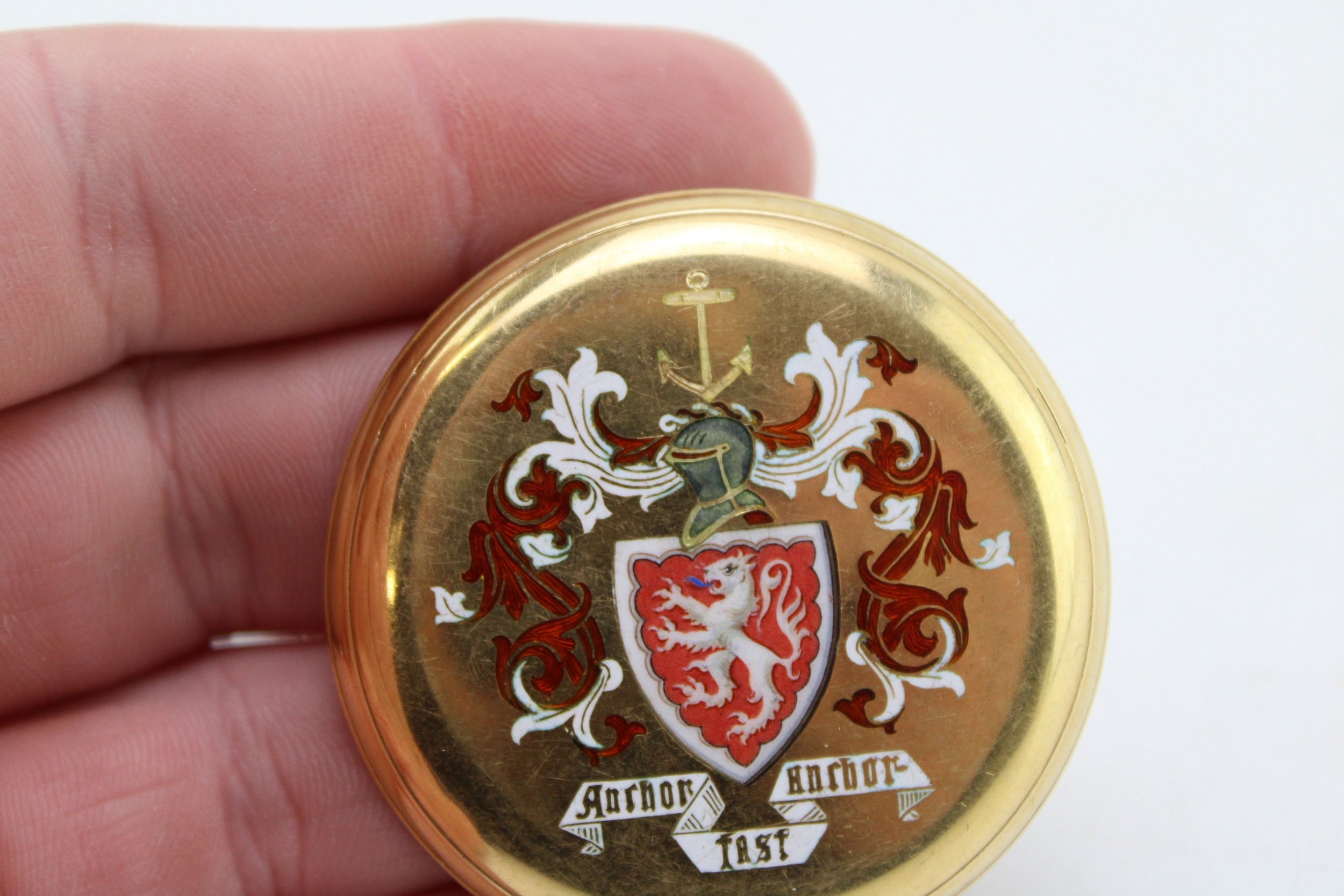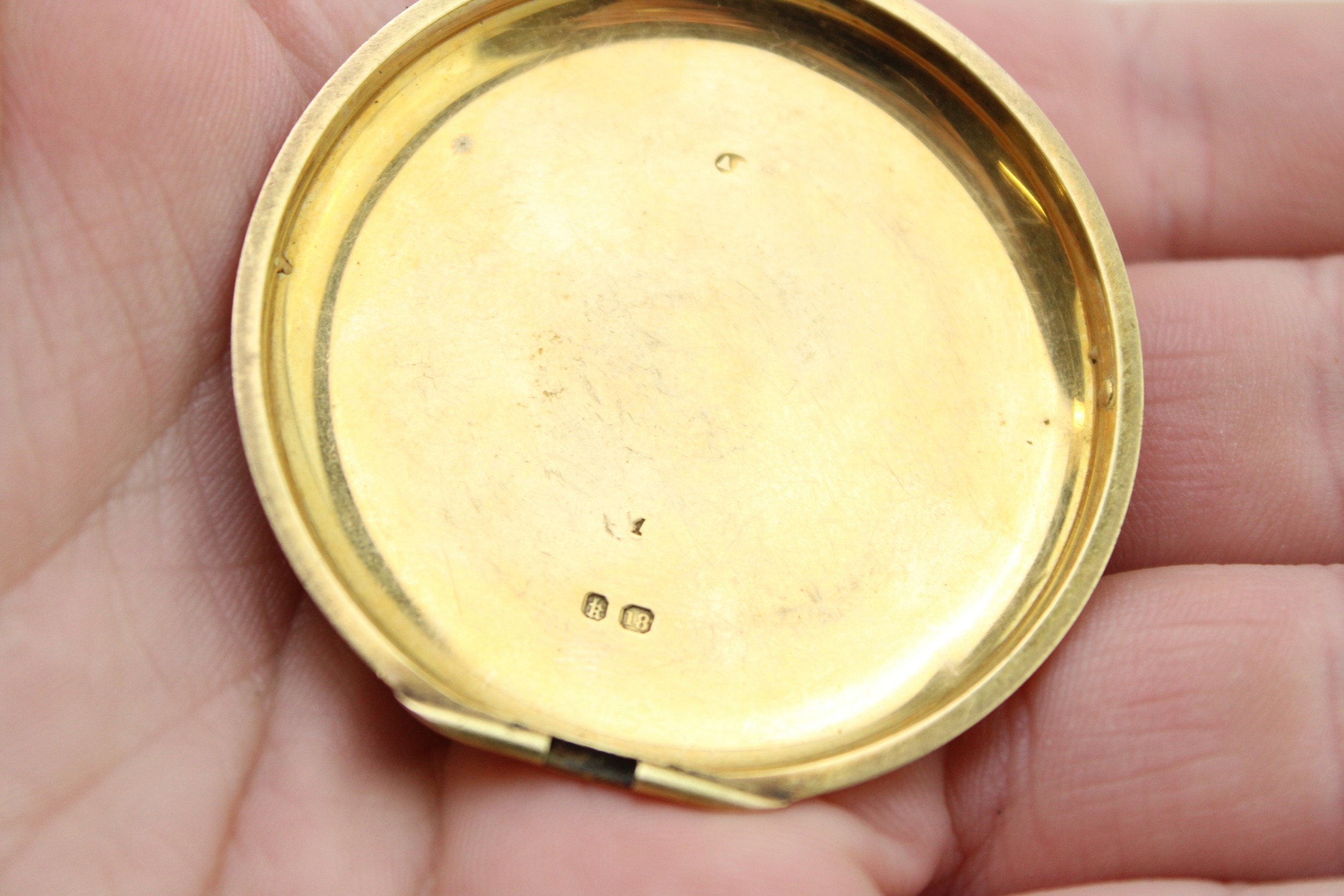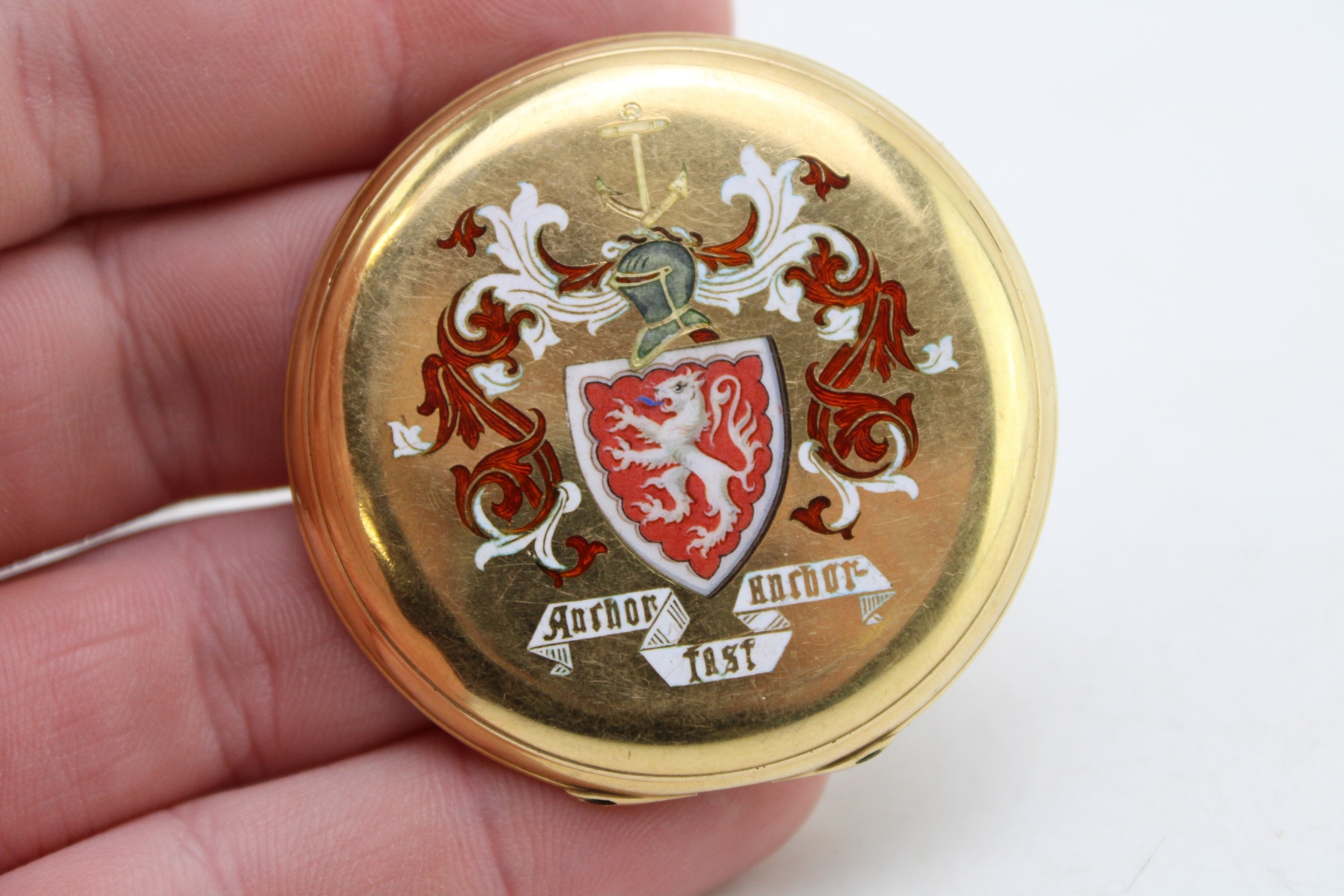 An 18ct gold pocket watch cover, with enamel armorial engraving, 48.2mm diameter, total weight 16.2g.