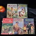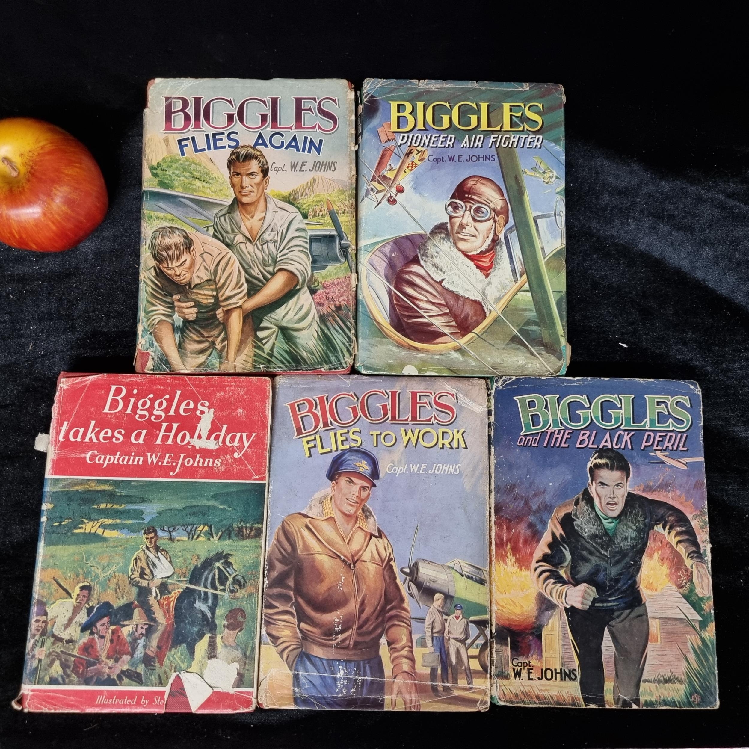 Five fantastic vintage 1950's and 1960's Biggles adventure books by Capt W.E Johns, including "Biggles Pioneer Air Fighter" and "Biggles and Black Peril". A super collection of classic books.