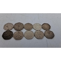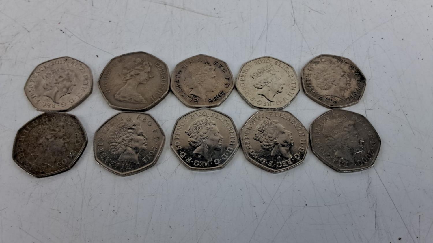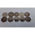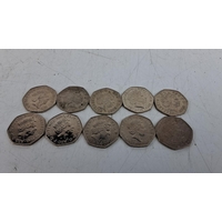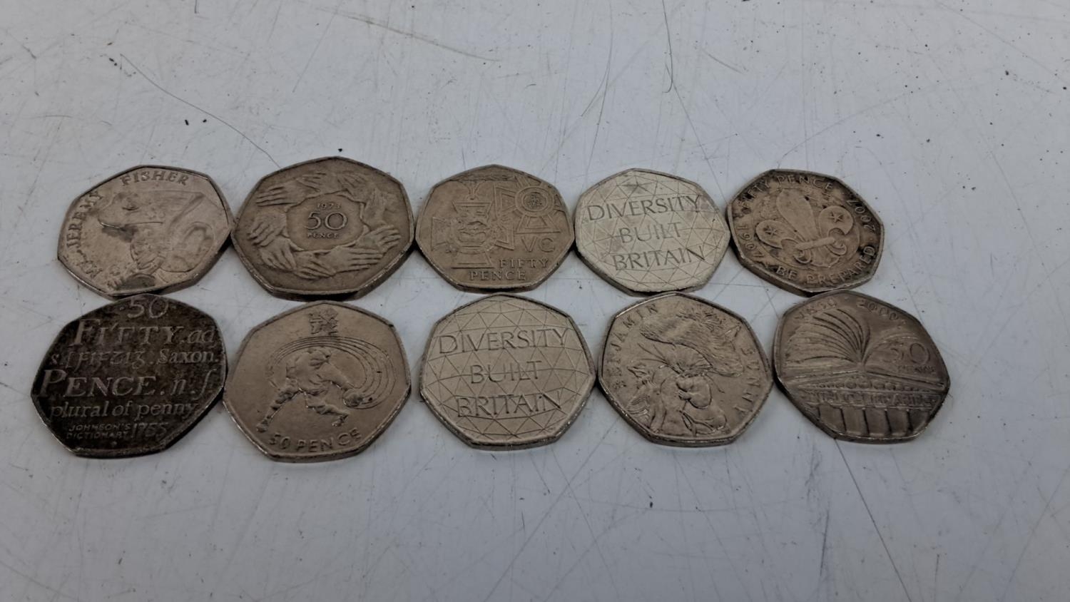 Collection of 10 British 50p coins. Coins feature various designs including "Diversity Built Britain," "Victoria Cross," and "Benjamin Britten." Dates range from 2005 to 2020.