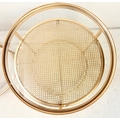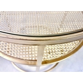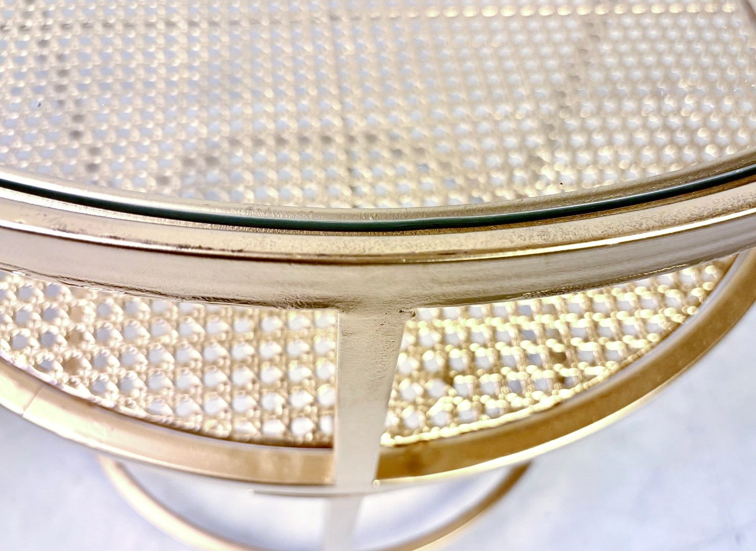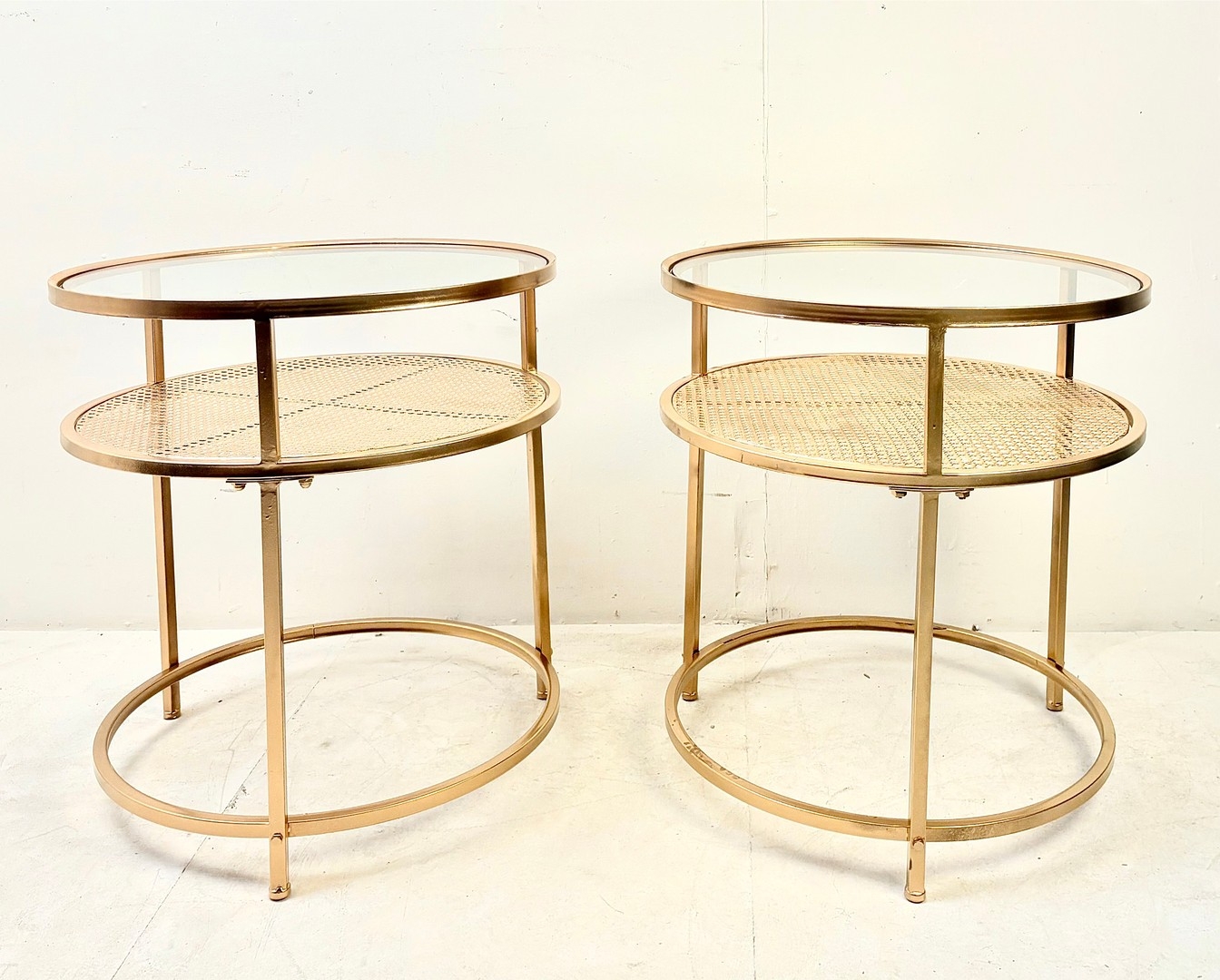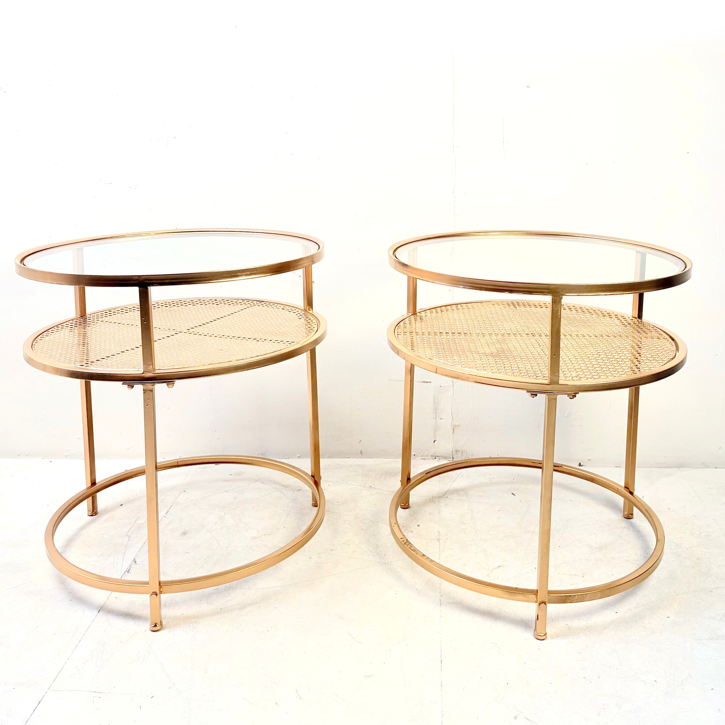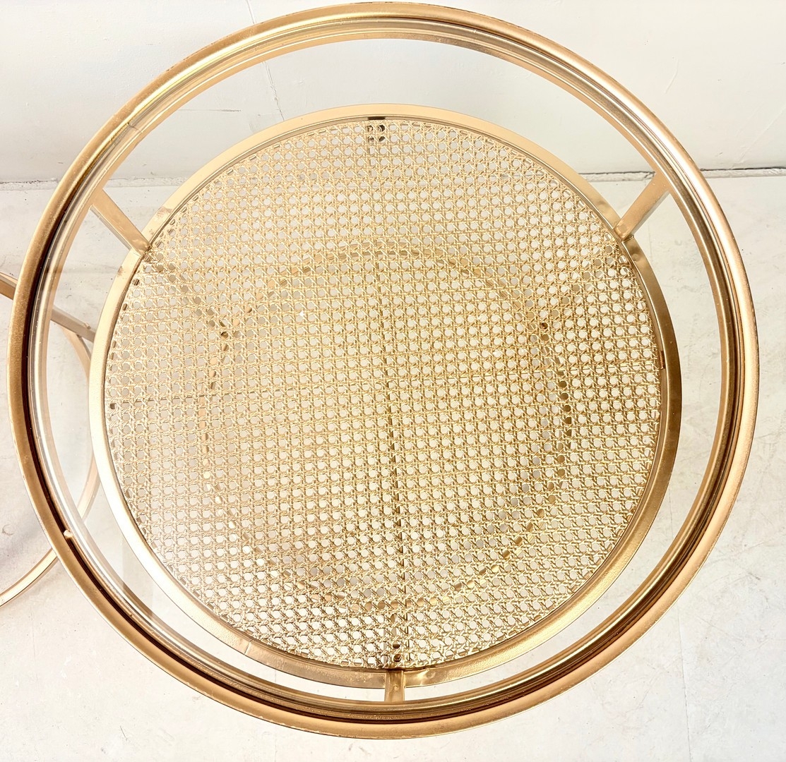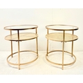PAIR OF CONTEMPORARY DESIGN GILT METAL OCCASIONAL TABLES WITH CIRCULAR GLASS TOPS. 61cm H x 58cm W.