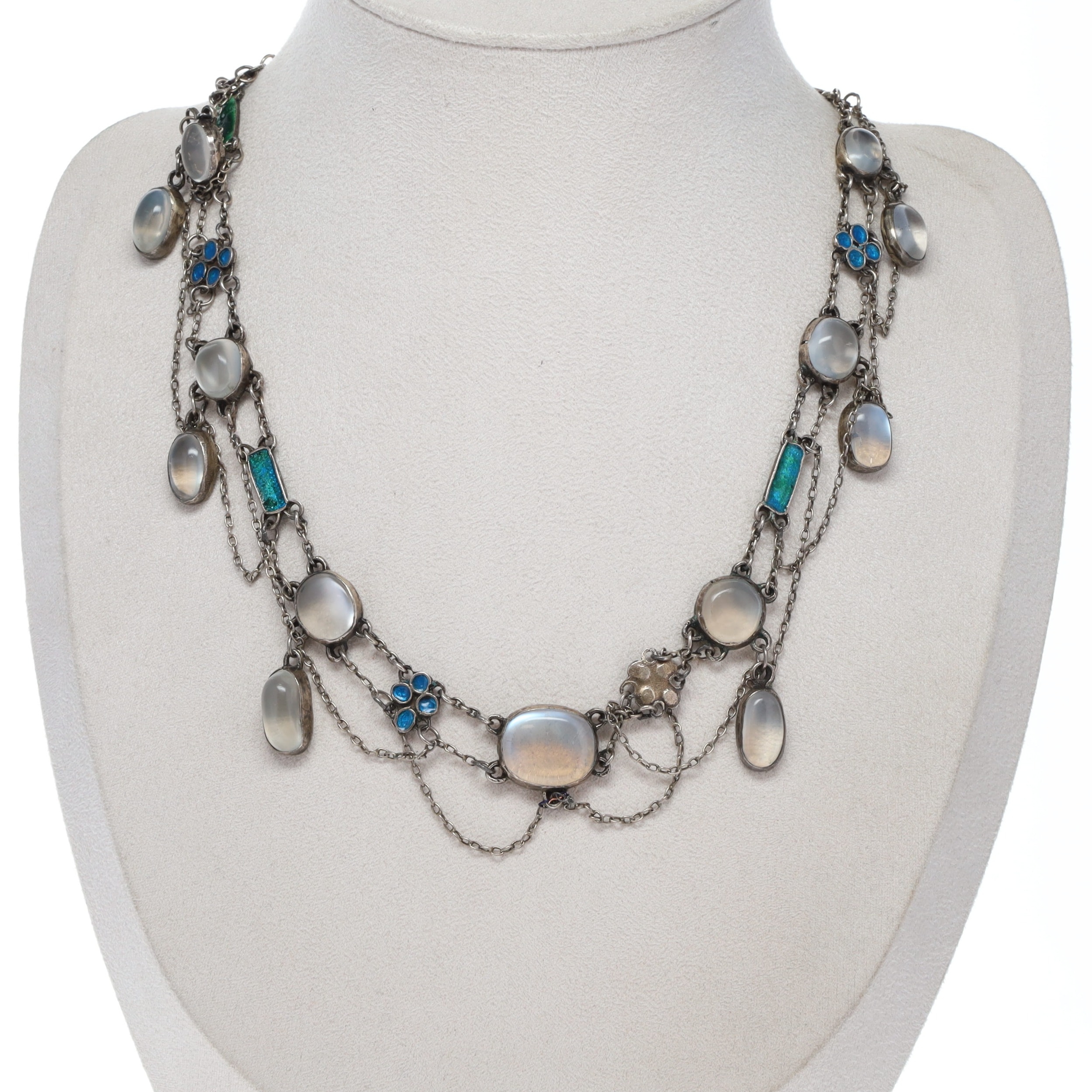 Arts & Crafts Enamel and Moonstone Silver Necklace, 31.8g
