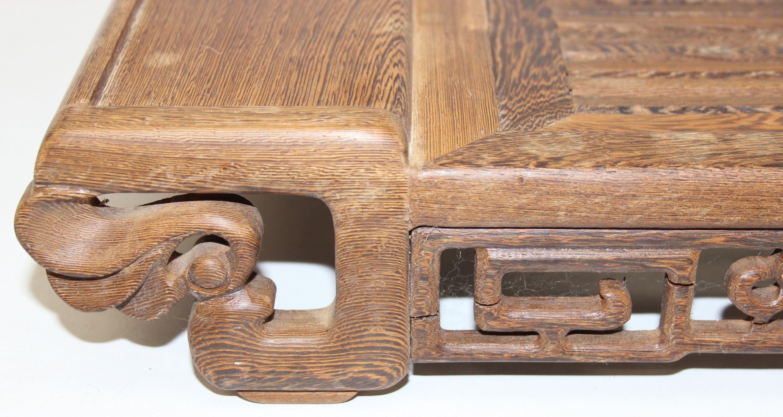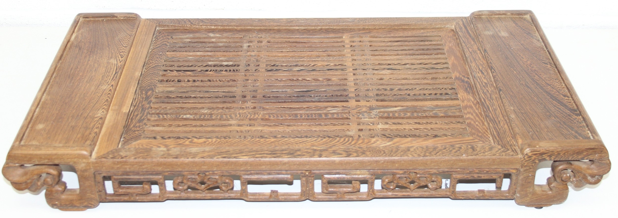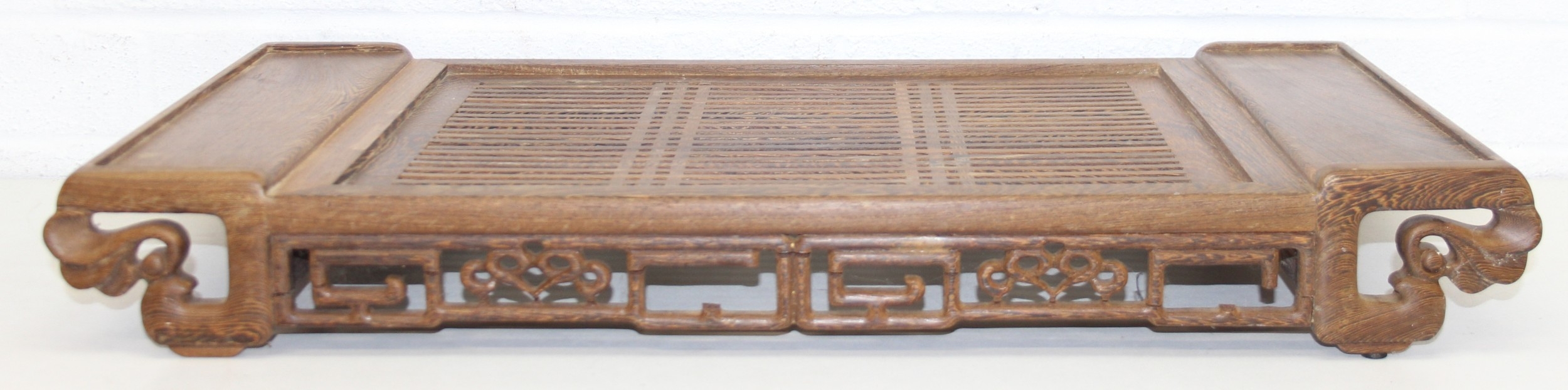 Vintage wooden Chinese or Japanese tea tray with carved details, 70cm x 36cm x 9cm