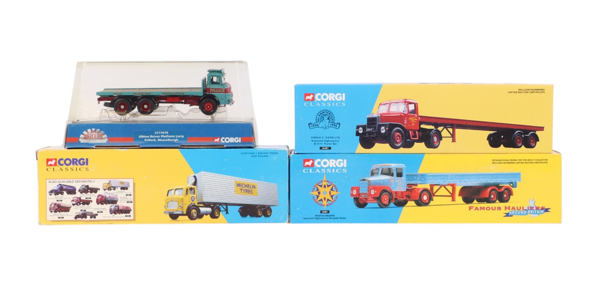 Four Corgi Classic commercial vehicles, comprising Pentus Brown Scammel Highwayman drop side trailer, 16201, Siddle C.Cook Ltd, Scammel Highwayman & 33ft trailer set, 16401, MICHELIN Leyland beaver box trailer set, 24701 and Albion Reiver platform lorry Pollock, Musselburgh, CC1610, all boxed (4).