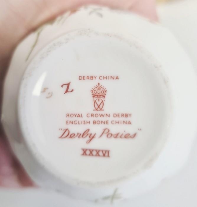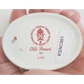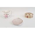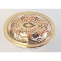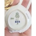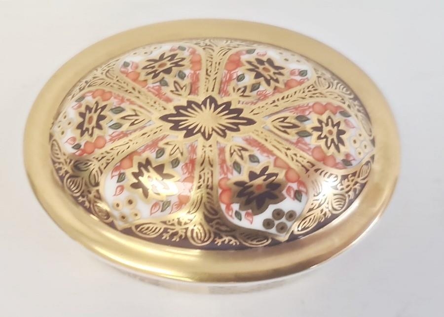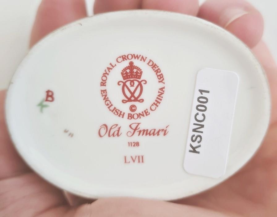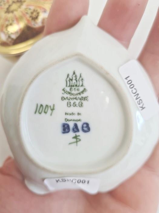 Royal Crown Derby small box and cover of oval form decorated in the 'Old Imari' pattern, 7cm long, a Danish Bing & Grondahl pin dish modelled as a leaf and a Royal Crown Derby jug in the Derby Posies pattern and a pair of plated squat candlesticks of classical column form(5)