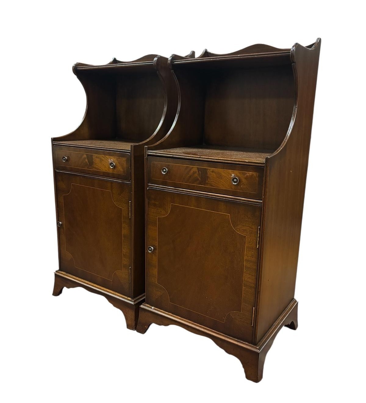 A PAIR OF VINTAGE MAHOGANY PEDESTALS each of rectangular form the superstructure with moulded shelf above an open compartment with frieze drawer and cupboards on bracket feet 85cm (h) x 36cm (w) x 31cm (d)