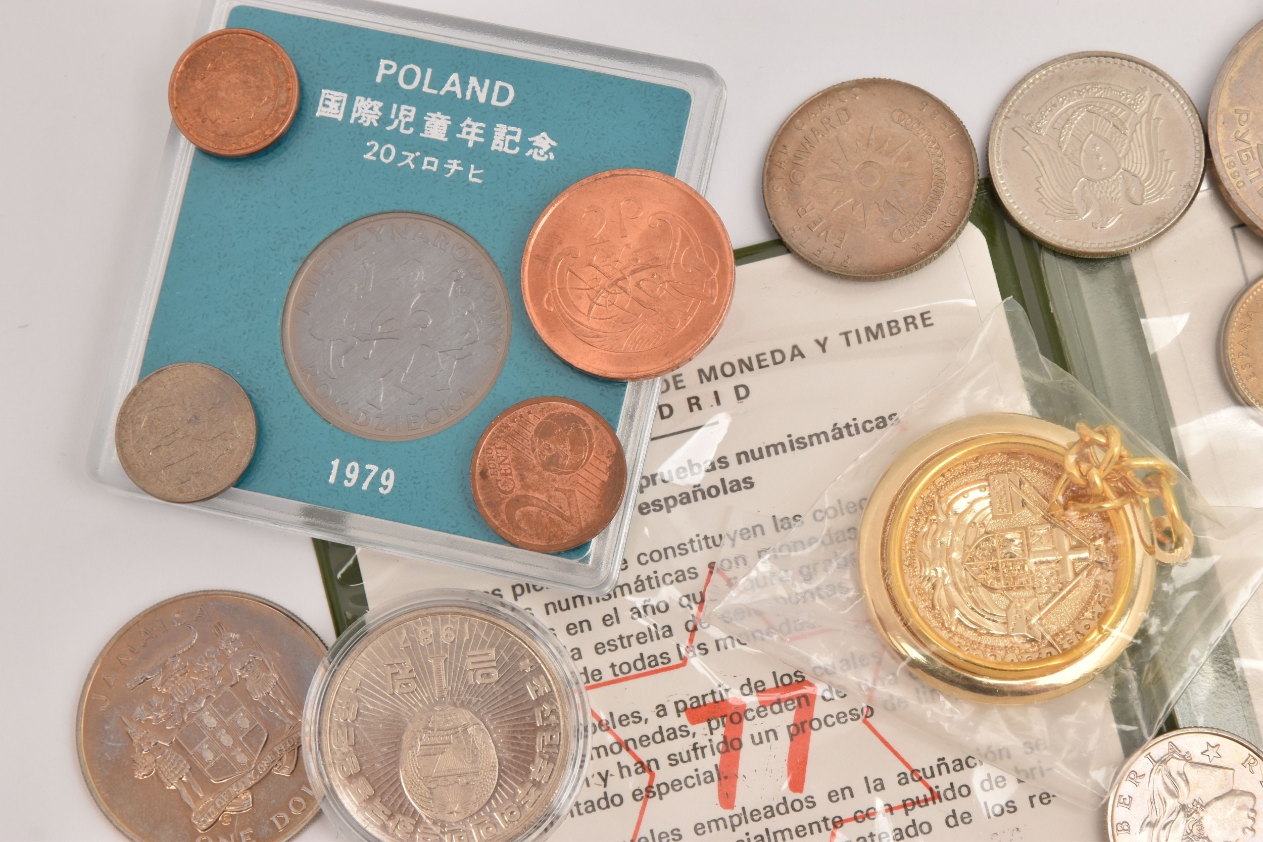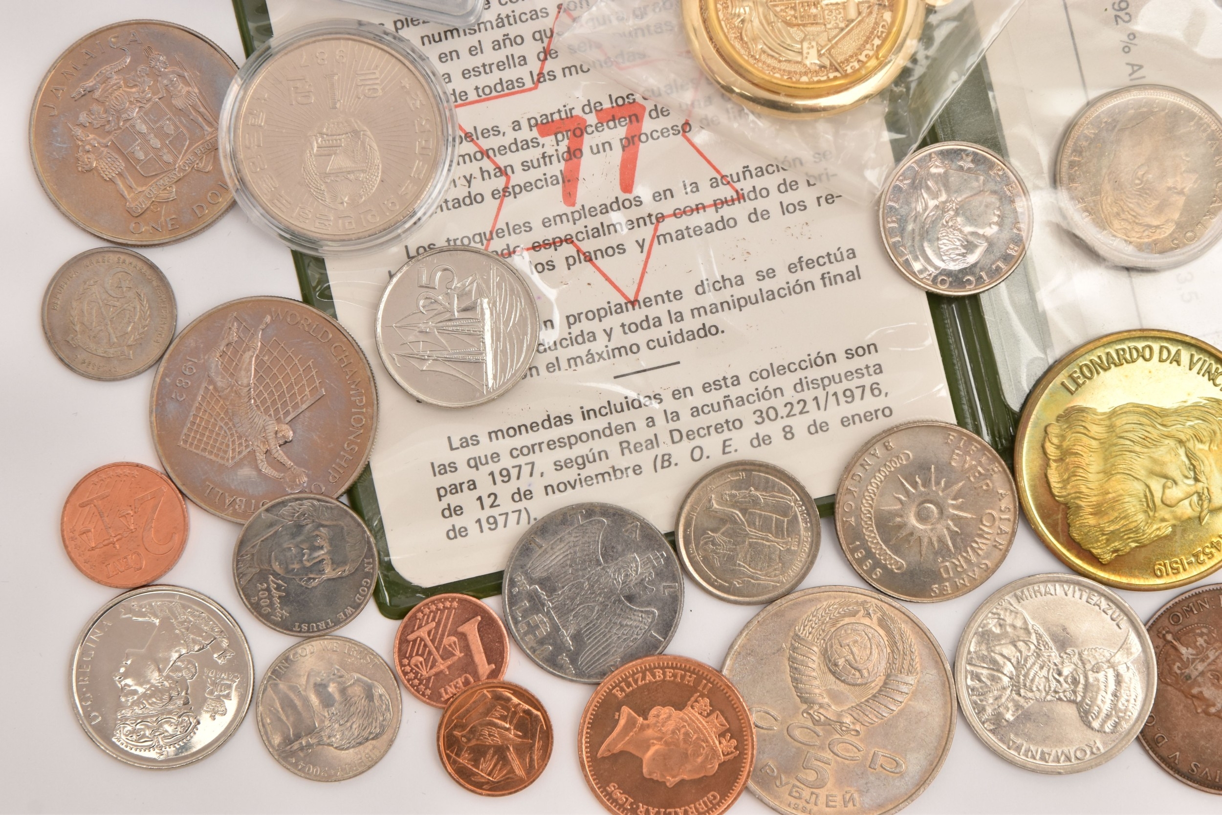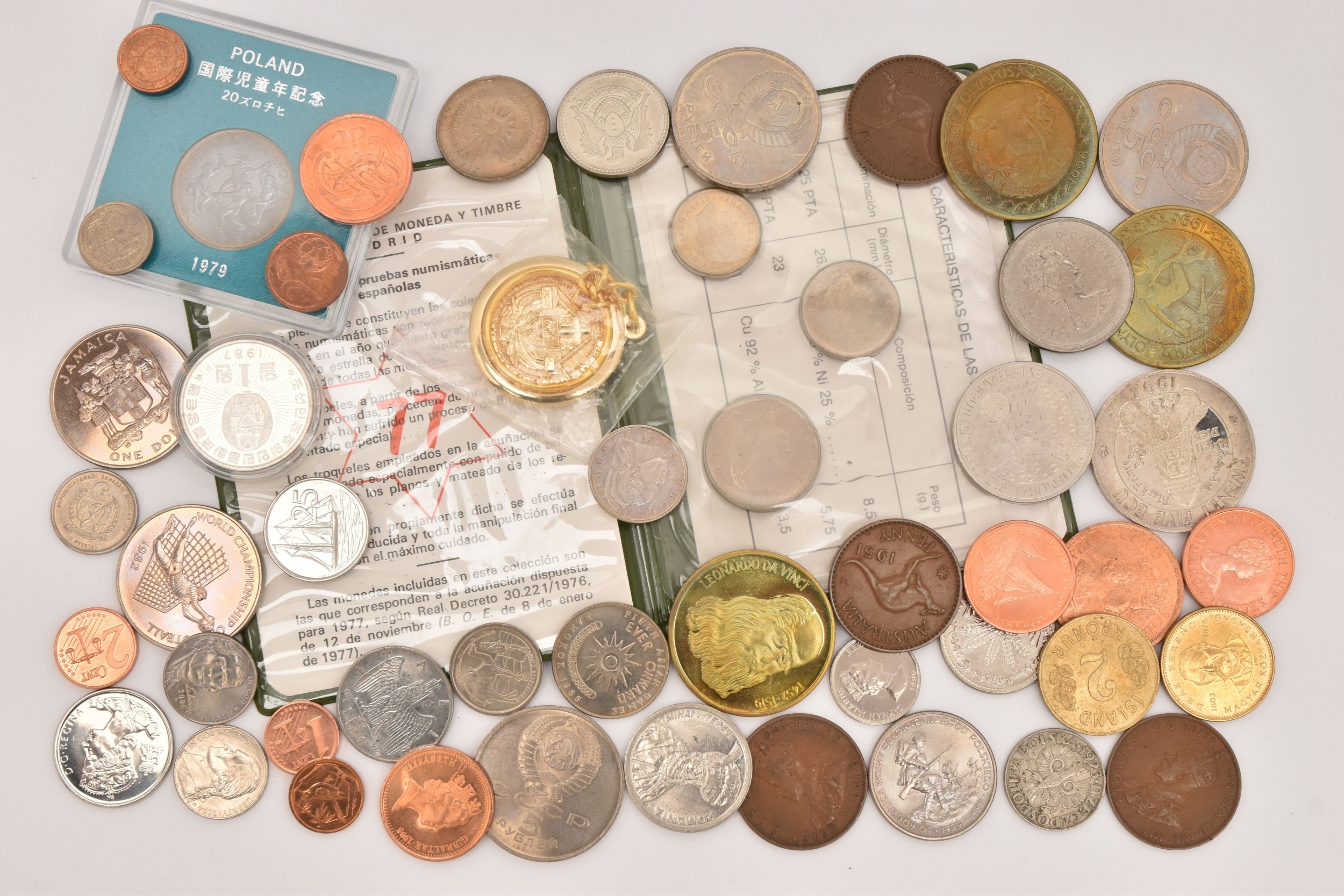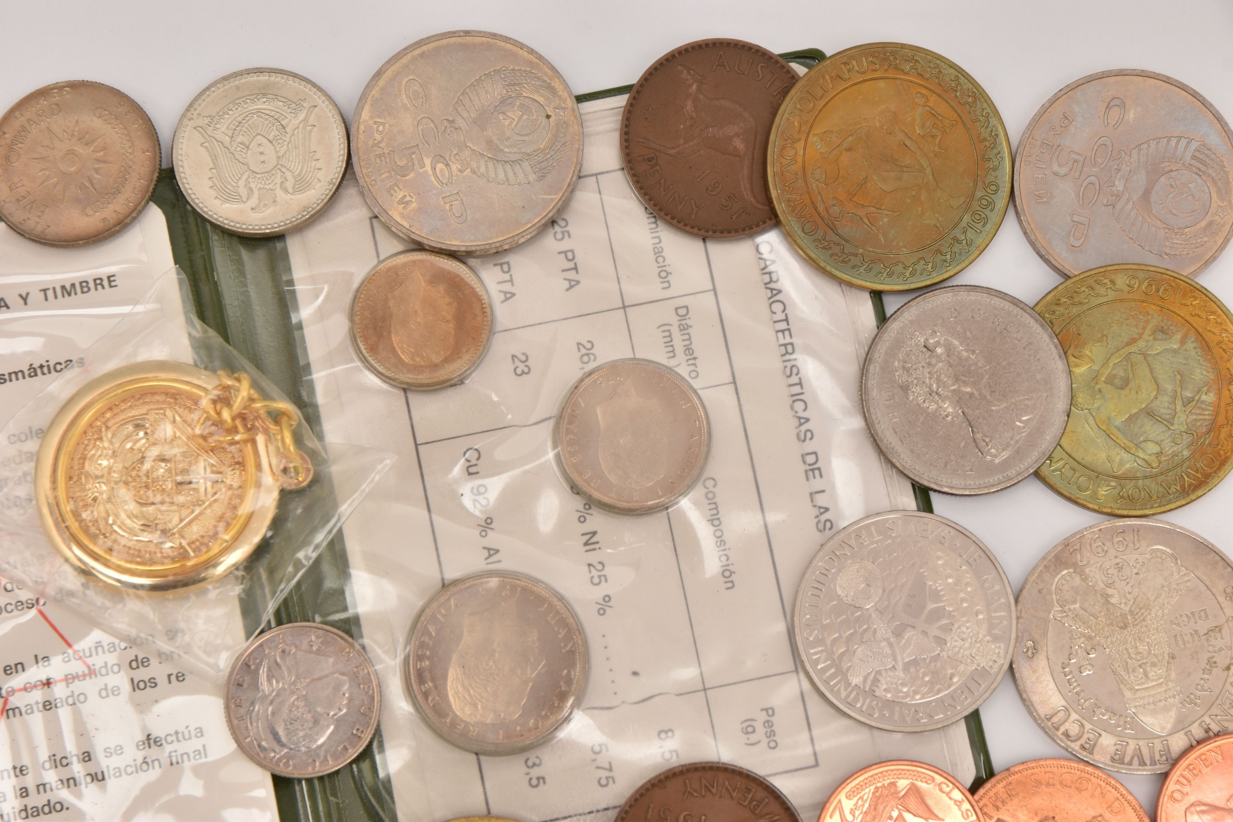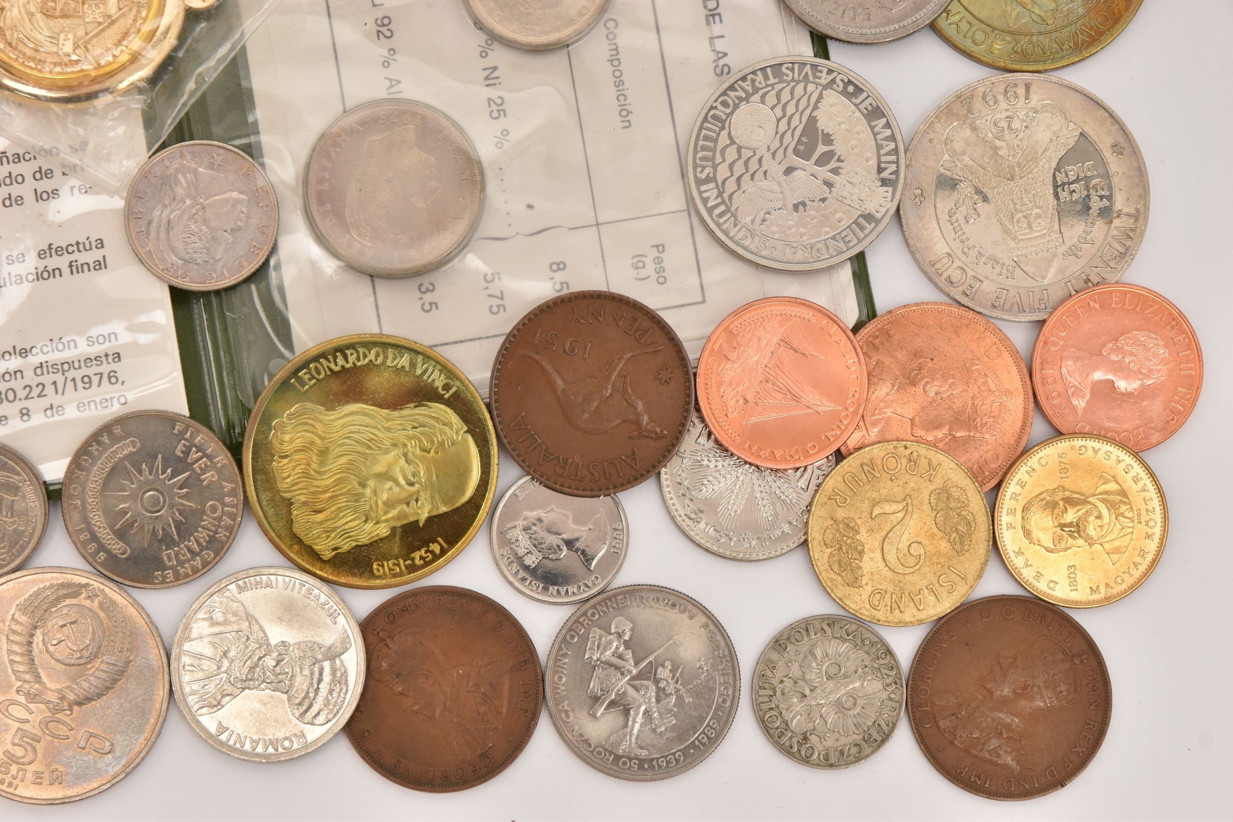 A SMALL COLLECTION OF COINS FROM OVERSEAS to include coins from Spain, Soviet Union, Greece, Romania, Poland, Australia, Canada and others, approx. 50 coins in total including a 10 Euro and 20 Euro coin, mostly circulated condition.