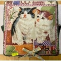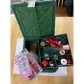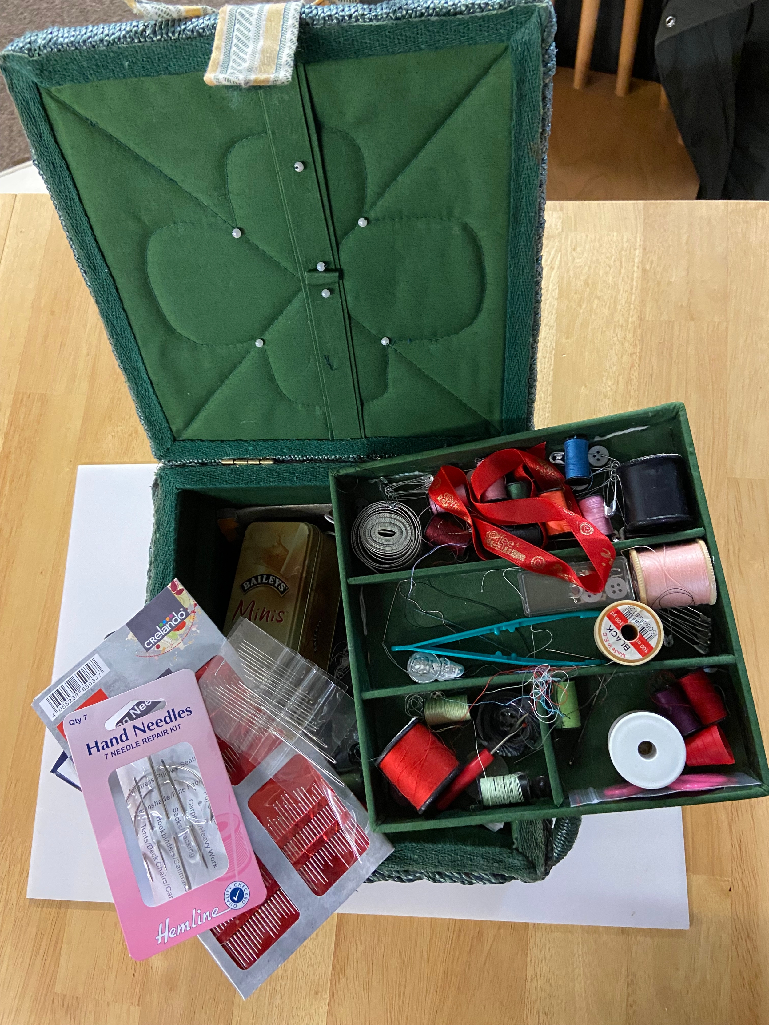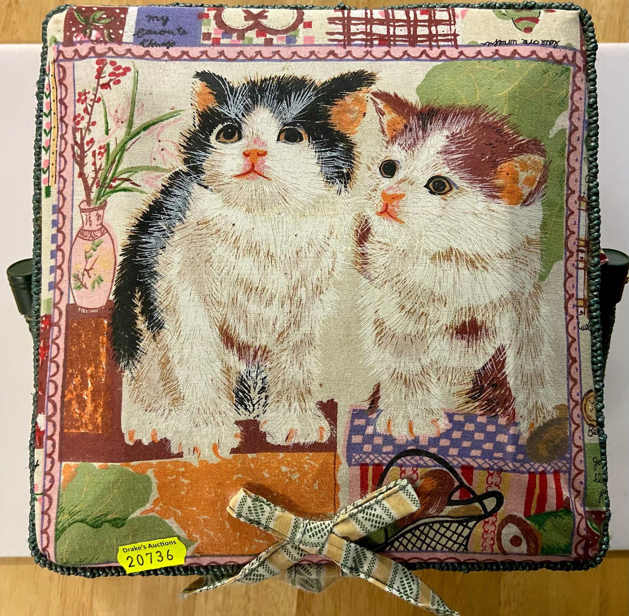 Sewing box and contents with kitten decoration to lid. W23 D23 H 13 cm
